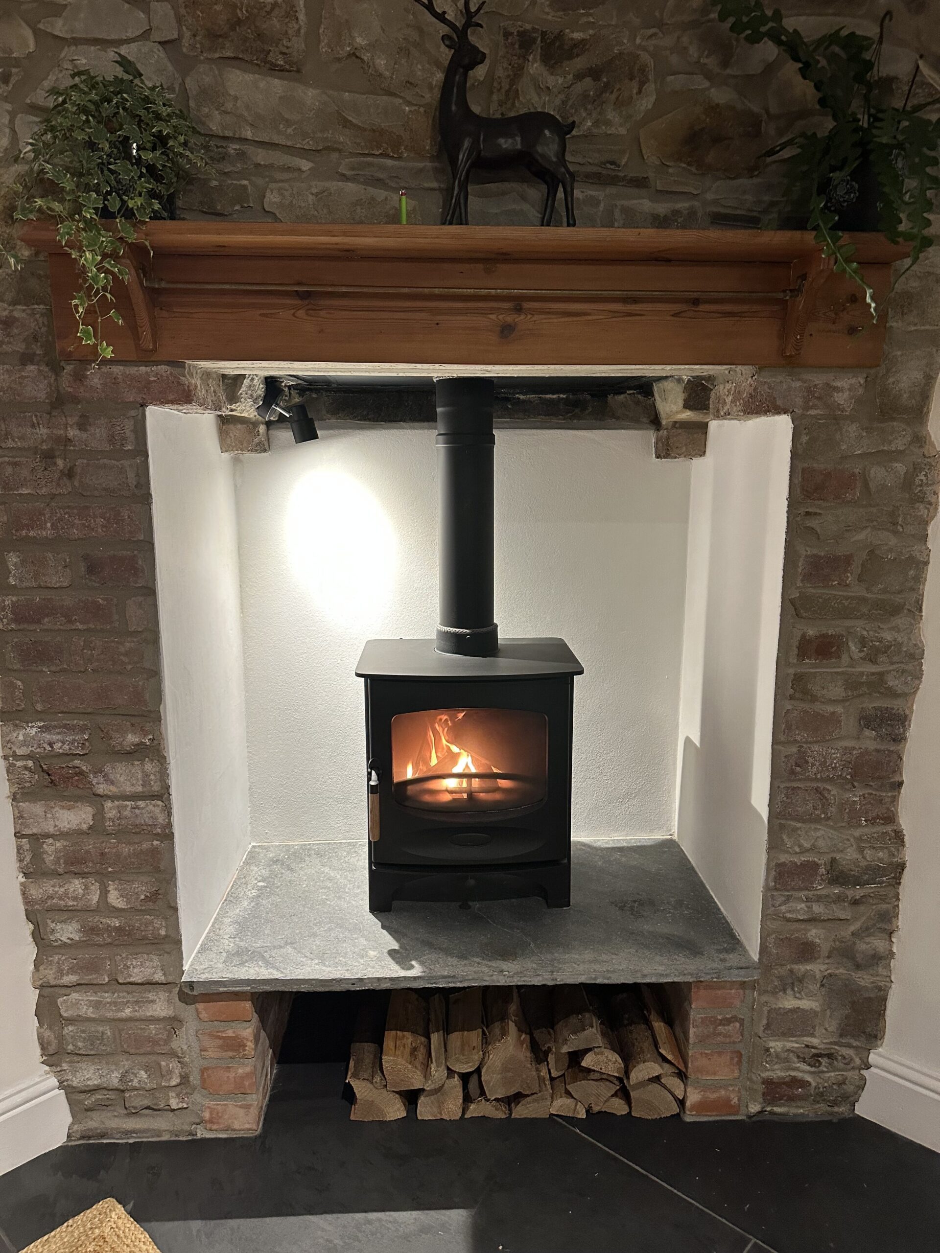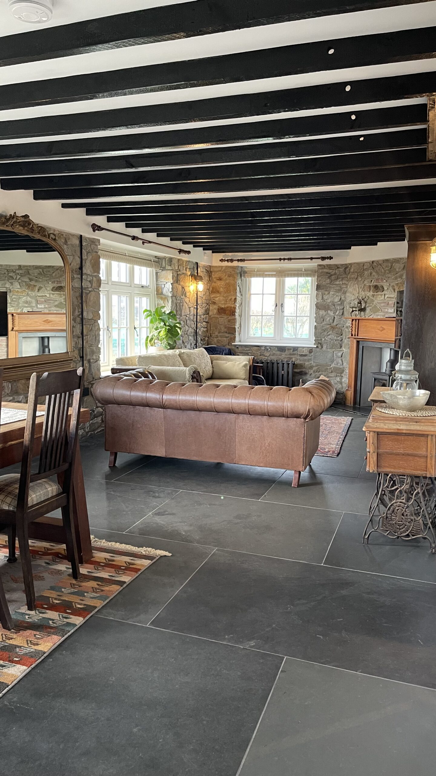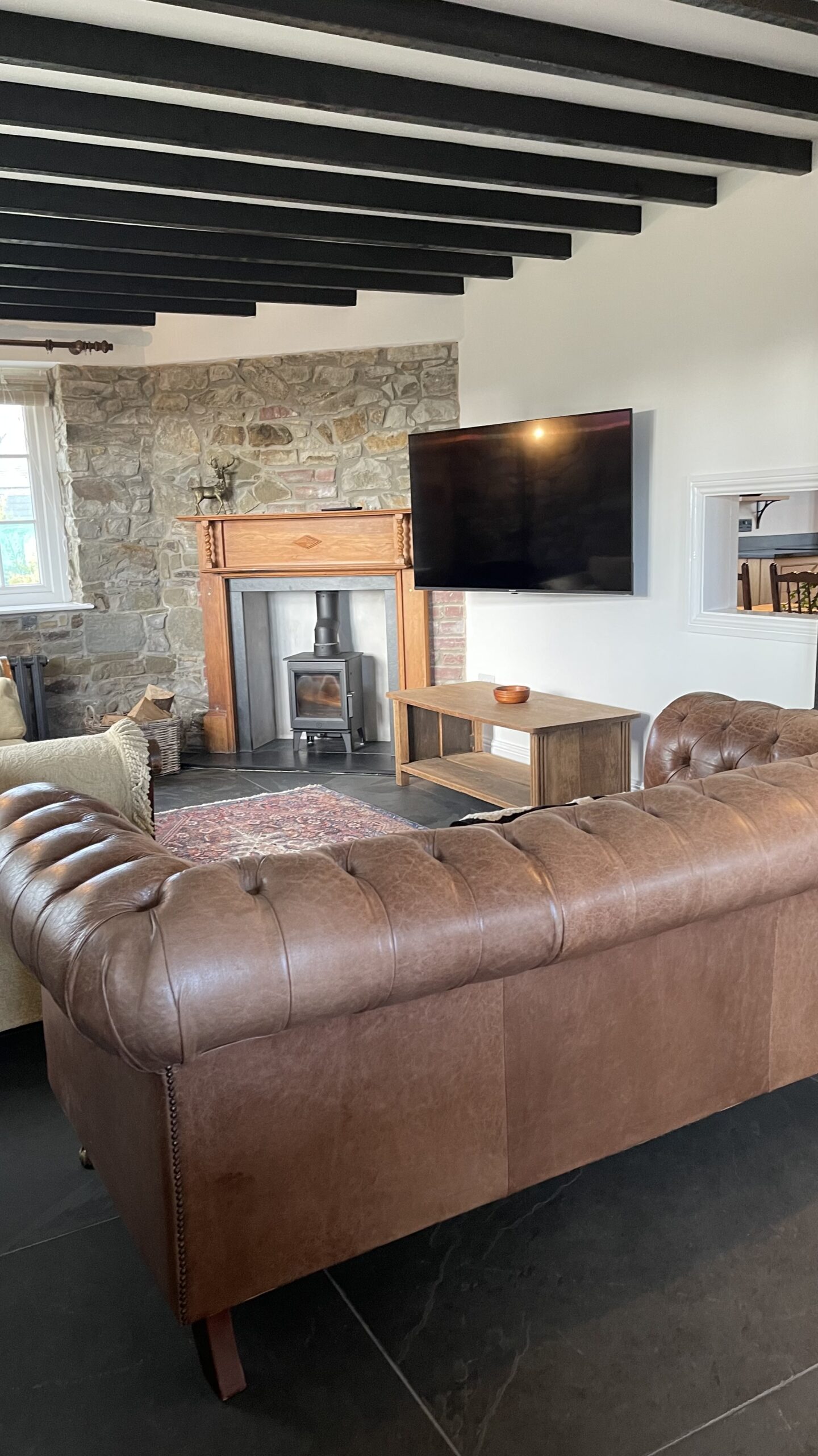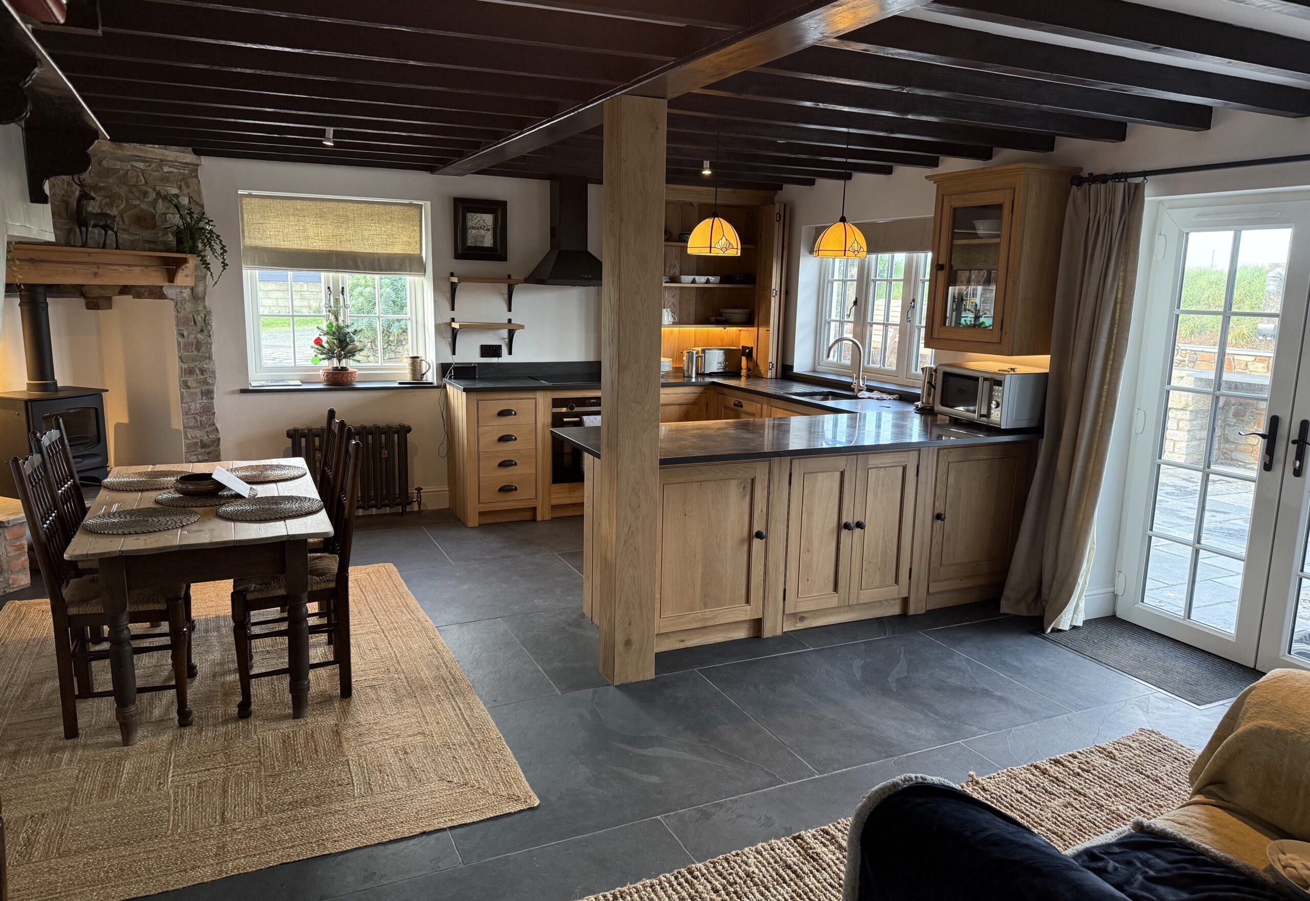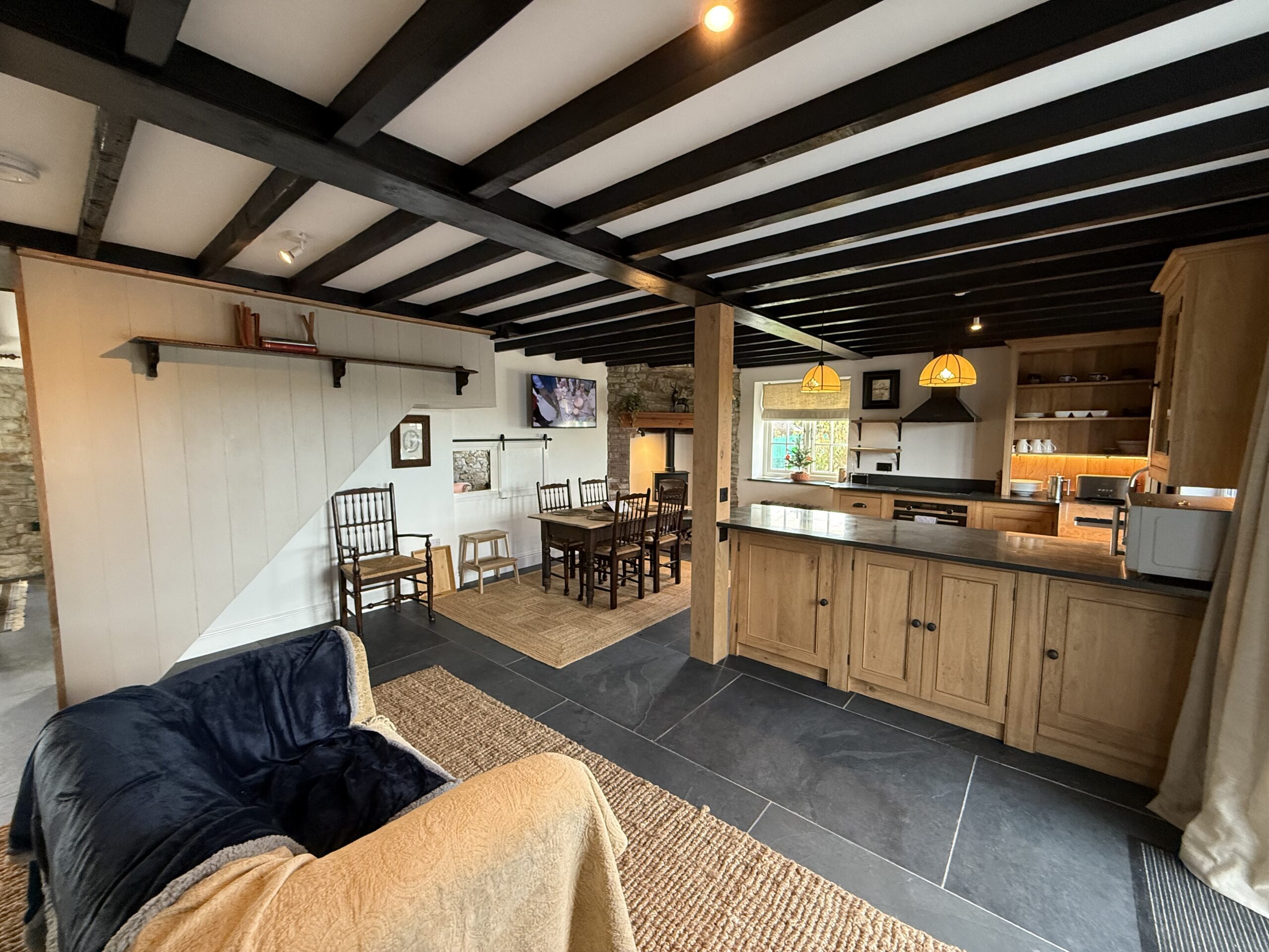The cottage is fully equipped with Wi-Fi, TV, a Bose sound system, log burners, and underfloor heating throughout. The kitchen features high-quality appliances, including an oven, induction hob, microwave, Nespresso machine, toaster, kettle, fridge, and freezer. A separate laundry room includes a washing machine, tumble dryer, and ironing facilities. Large patio doors open onto a slate terrace with a dedicated BBQ and outdoor kitchen area, complete with sink and slate worktops—ideal for al fresco dining.