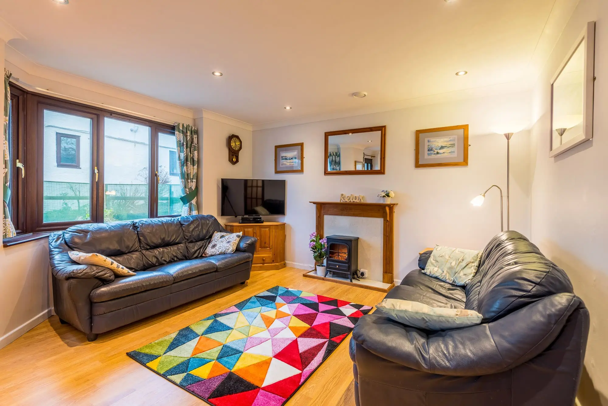 - Wall-mounted 43” smart TV with streaming apps, plus DVD player and mini hi-fi