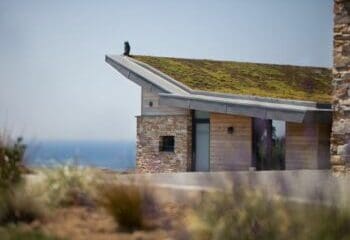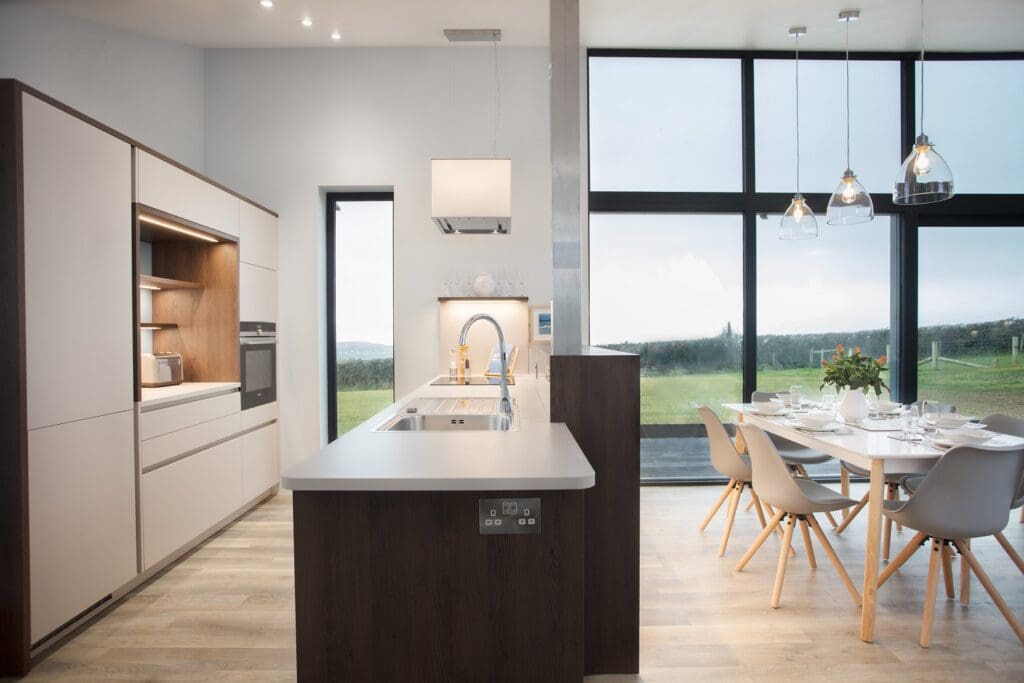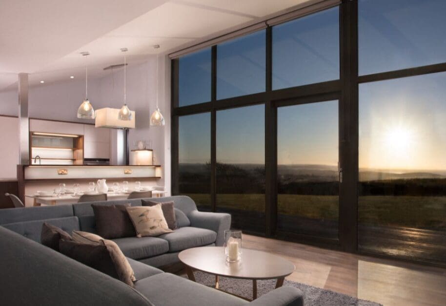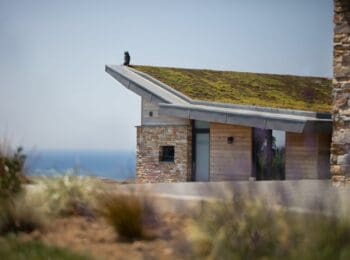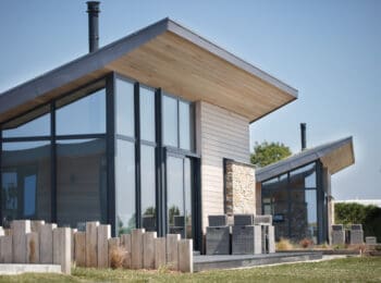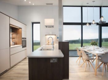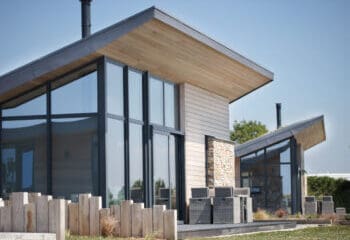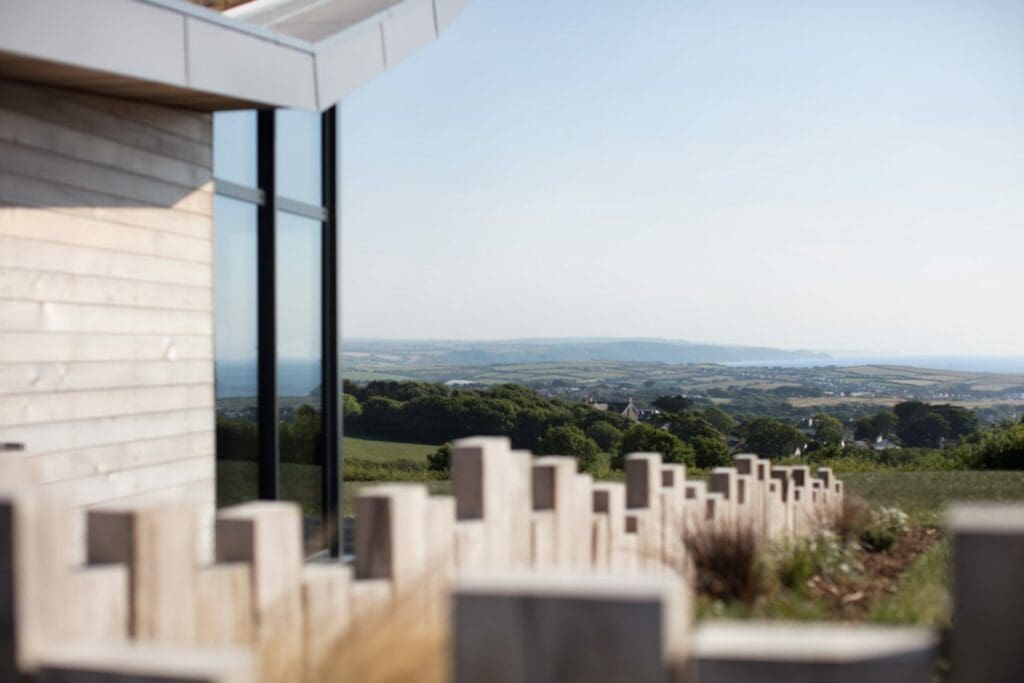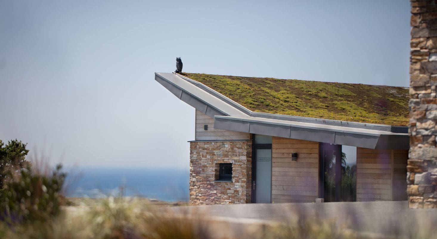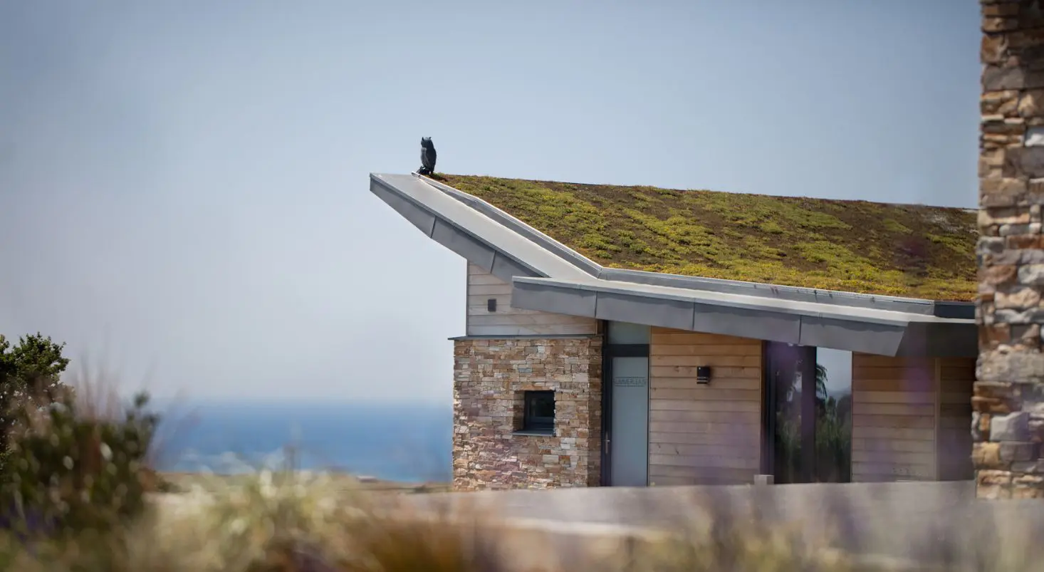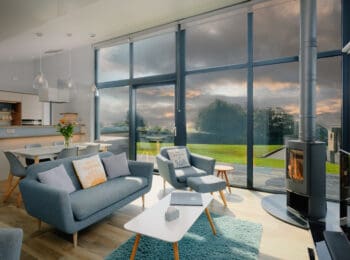 The eco-friendly rooftops sprinkled with wild-flowers, the bleached oak cladding and the beautiful reflective glass windows allow the landscape to echo throughout and blend the properties perfectly into their countryside setting.