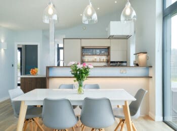 The spacious open-plan sitting, dining and kitchen area means you will never miss out on a moment with friends and family. The log burner and modern, contemporary sofas make for a cosy place to spend winter days snuggled with loved ones. During the summer months, it’s all about the outside decking with woven cubed furniture, BBQs and glasses of ice-cold G&Ts – all you need to decide is who’s on drinks duty!