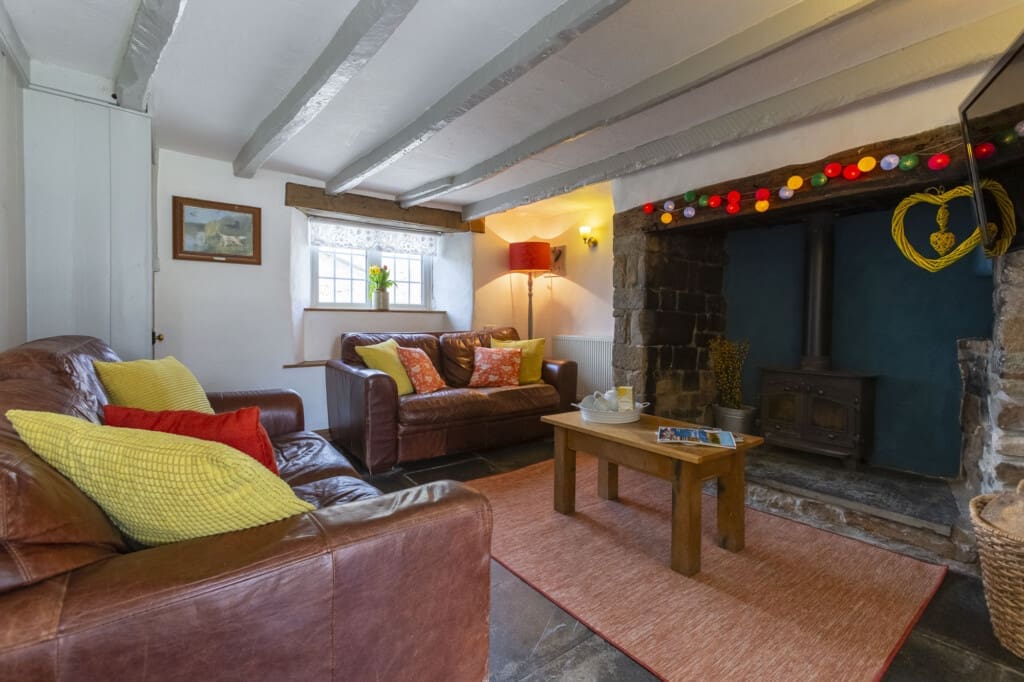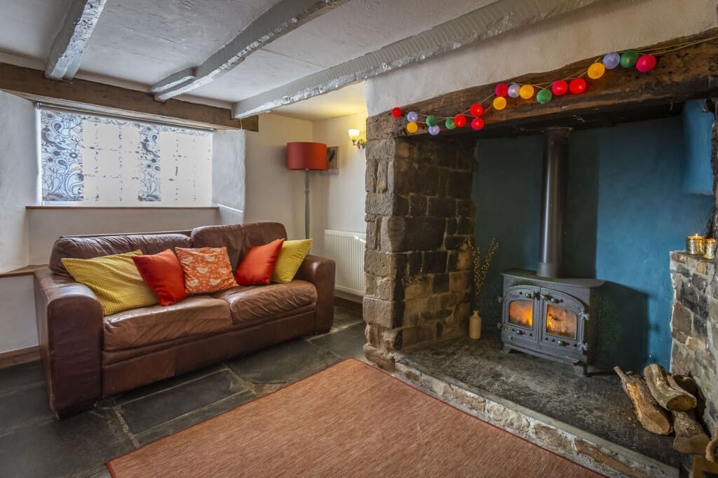As you step through the door, you’re greeted by the timeless charm of wobbly walls, twisted oak beams, and deep-set windows, evoking a sense of nostalgia and warmth. The slate flooring and wood-burning stove nestled within the original inglenook fireplace add to the cottage’s rustic appeal, inviting you to unwind and embrace the serene ambiance.