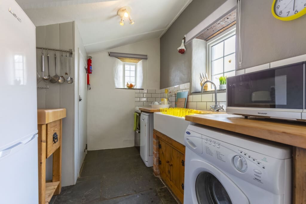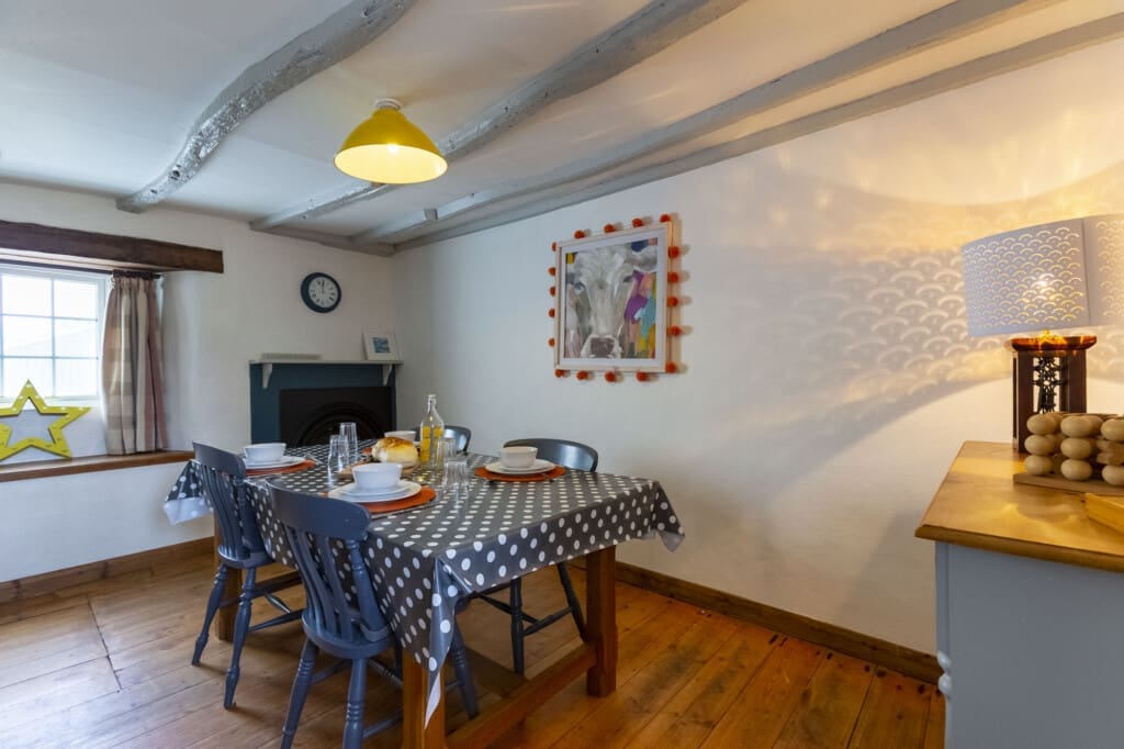 On the ground floor, the cottage unfolds its welcoming spaces. To the left of the entrance, the cosy lounge beckons, adorned with beamed ceilings, slate flooring, and plush sofas—perfect for sinking into after a day of exploration. A wall-mounted TV with a DVD player provides entertainment, while the wood-burner, complete with a complimentary log supply, offers warmth and ambiance on chilly evenings. Next to the lounge lies the dining room, featuring a large country-style table and an ornamental fireplace, creating a charming setting for shared meals and laughter. The compact yet fully equipped kitchen awaits, with a backdoor leading directly to the enclosed private garden and patio area—a tranquil retreat for al fresco dining or simply soaking up the sunshine.