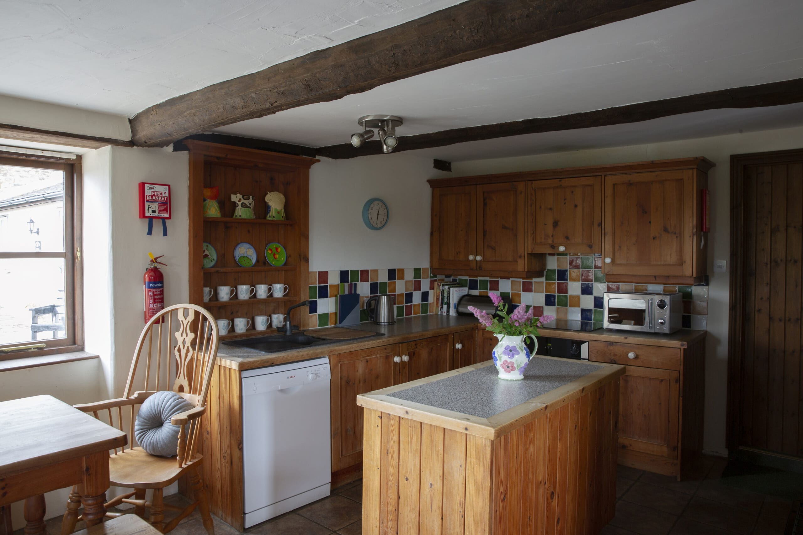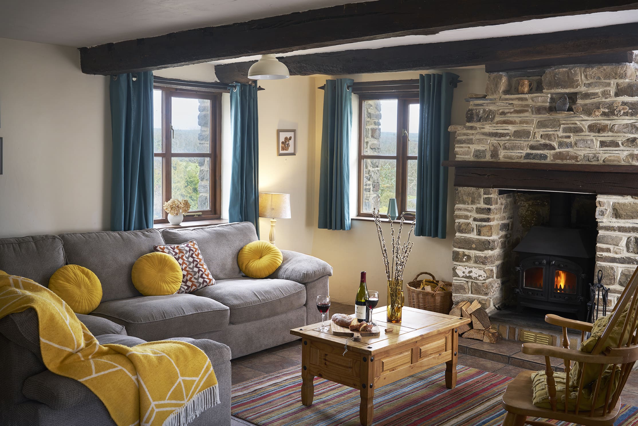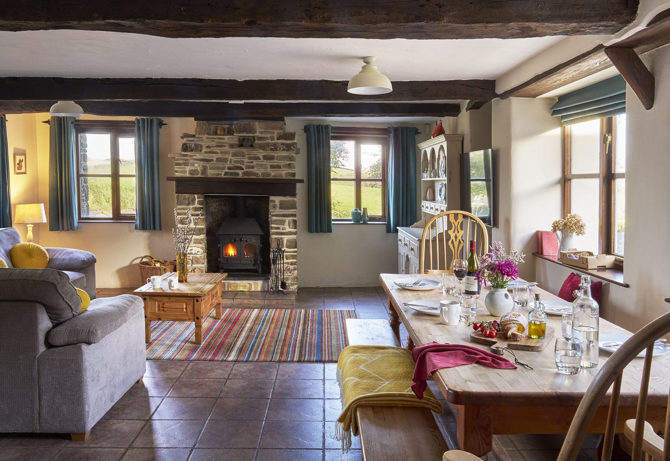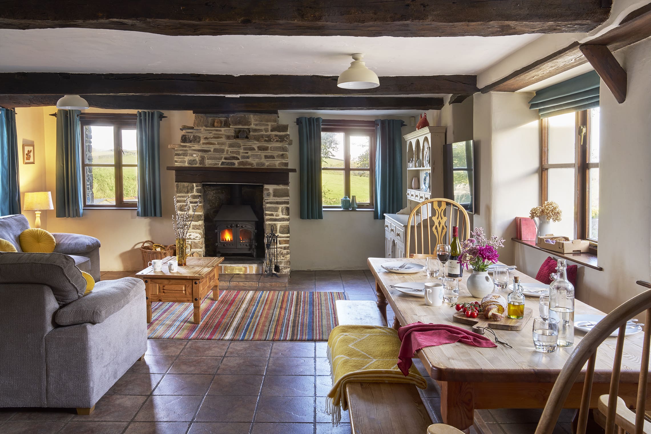 - Open plan kitchen/diner and lounge with stone wood burner, two fridges/freezers, washing machine, and dishwasher.