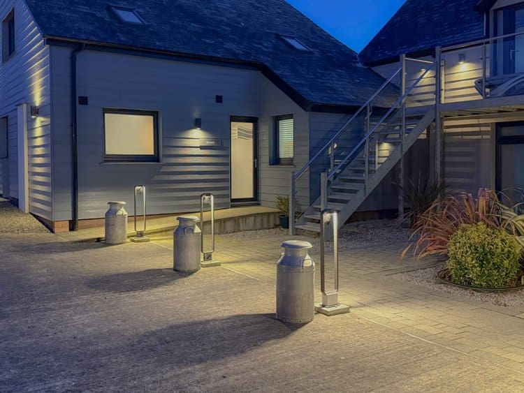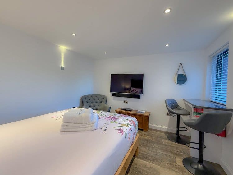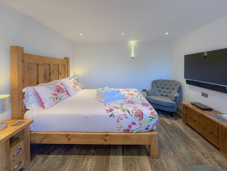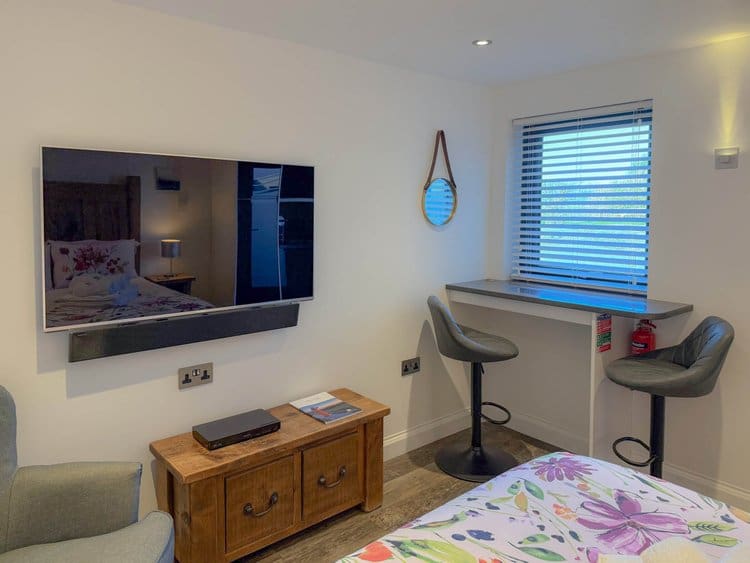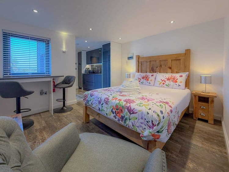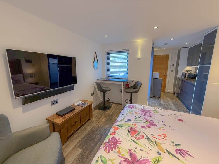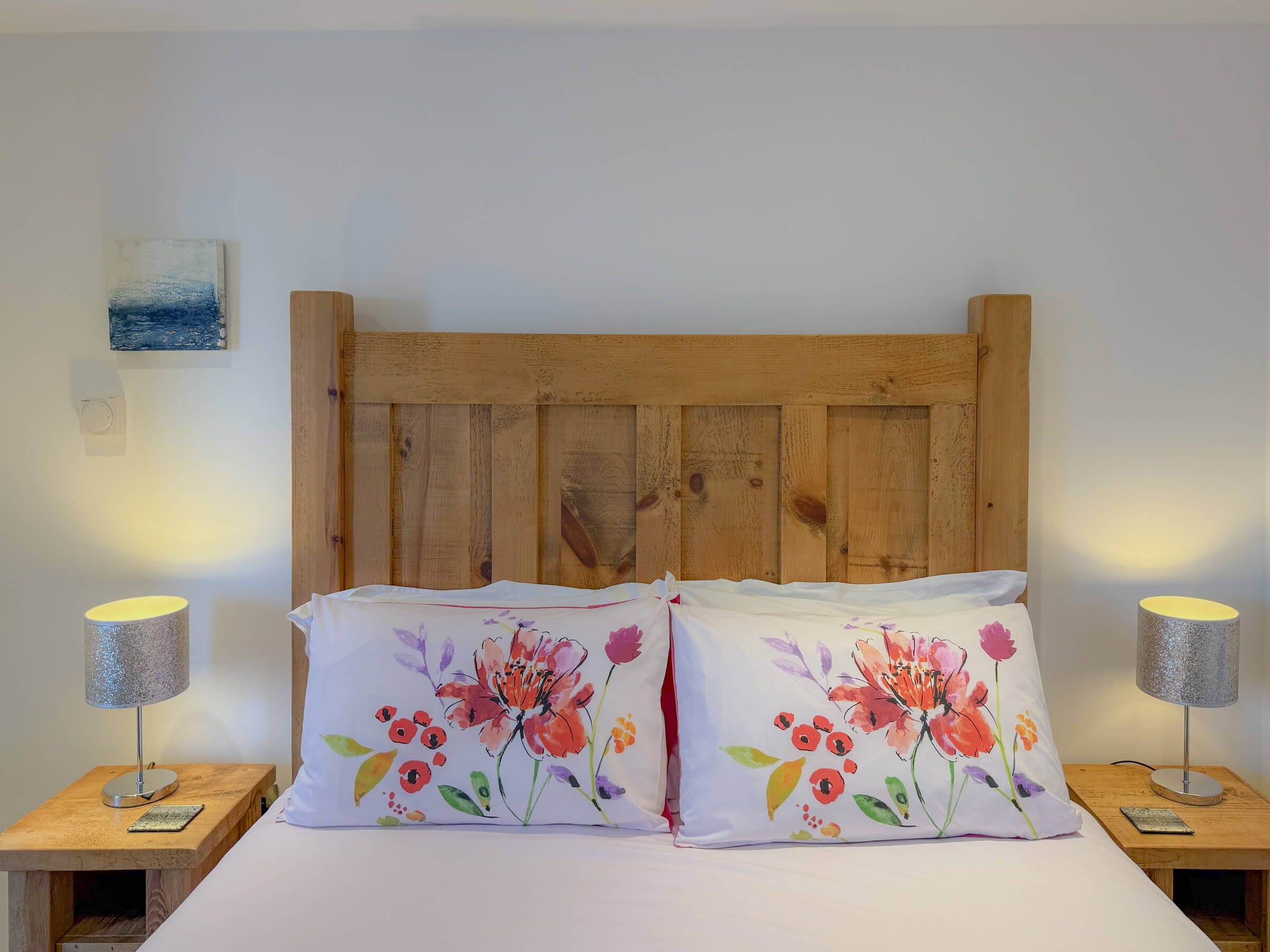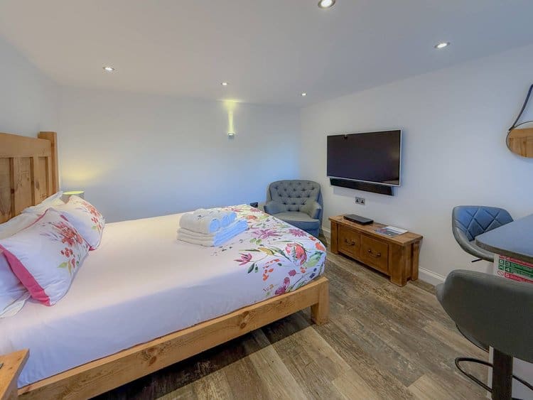 While there is no private patio, guests have access to a shared picnic and BBQ area, offering spectacular views across the Cornish countryside and out to the sea.
