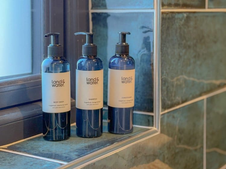 The bathroom is fitted with a walk-in rainfall shower, with locally made toiletries and bath foam provided.