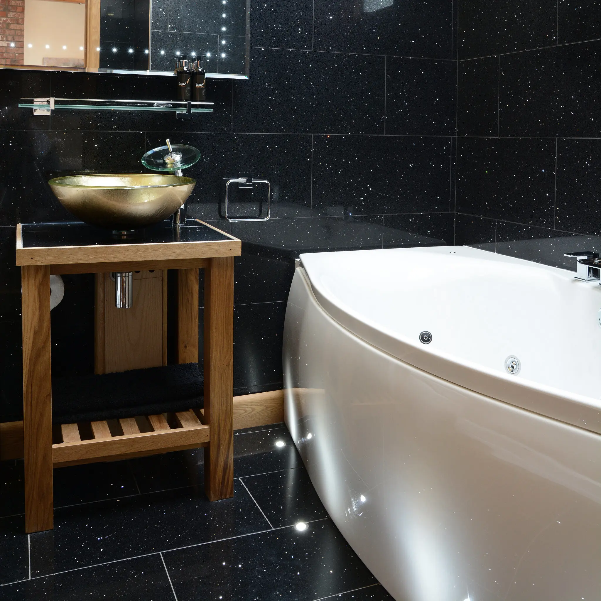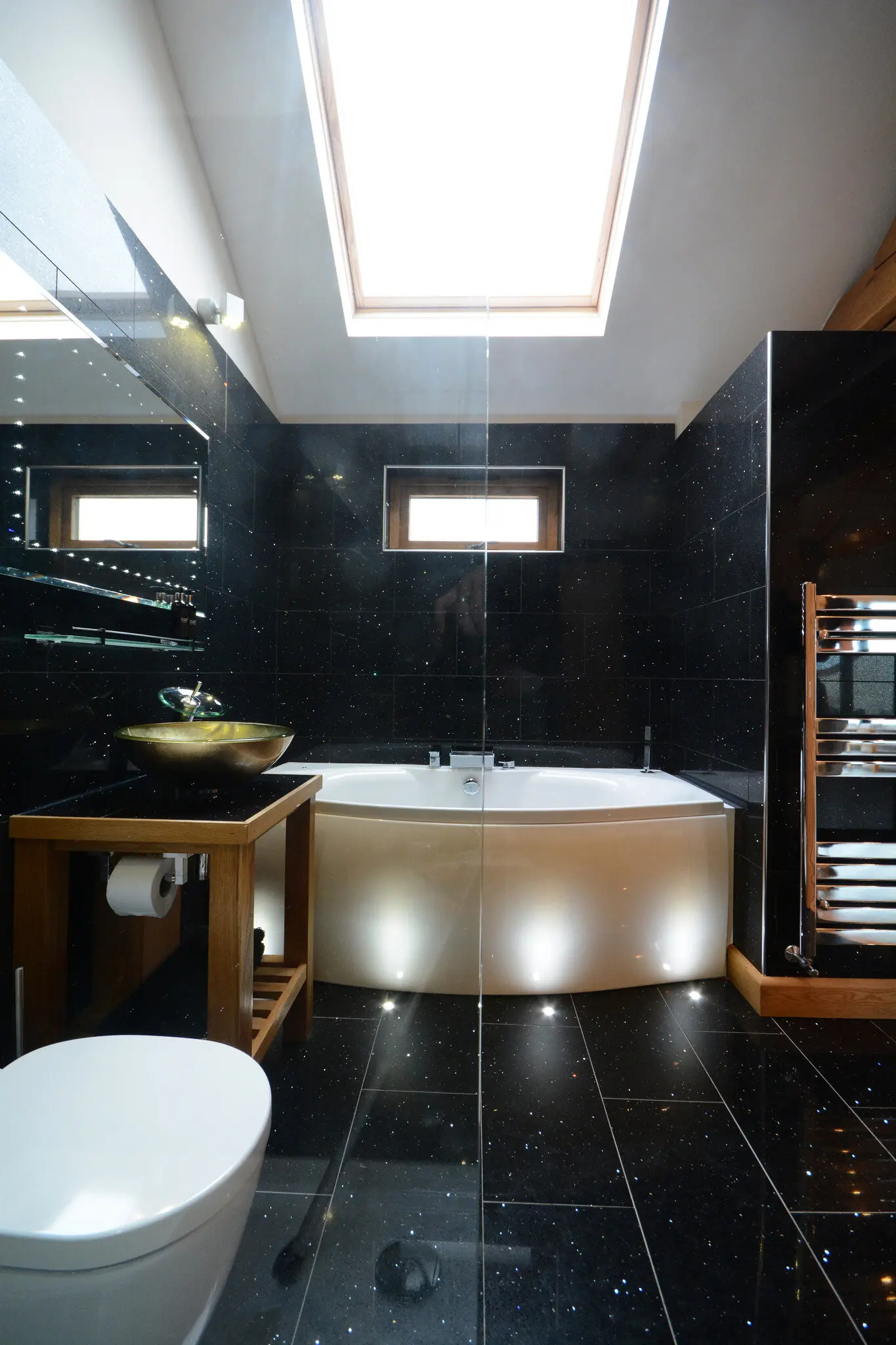 The en-suite bathroom combines bold design with indulgent touches. Enjoy a long soak in the spa bath, or refresh under the walk-in rainfall shower. Finished with black sparkling tiles, a waterfall tap, and a round basin, it’s a stylish space to unwind. Locally made toiletries and bath foam are provided.