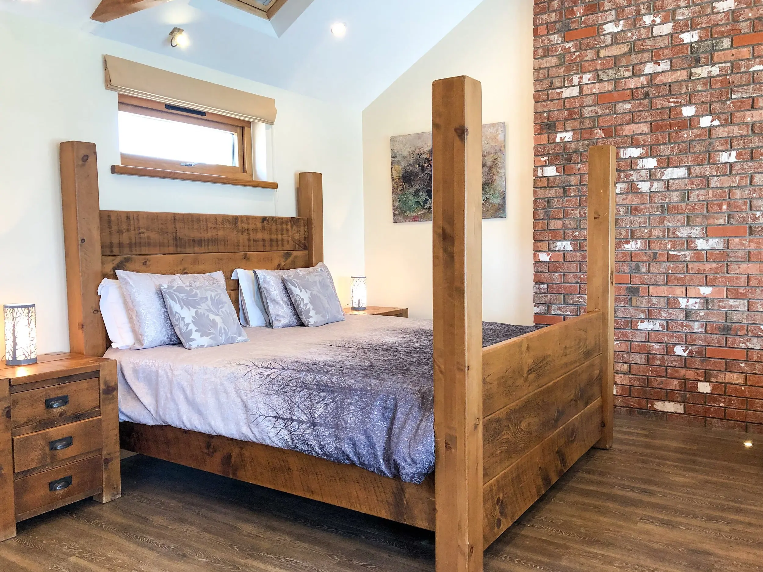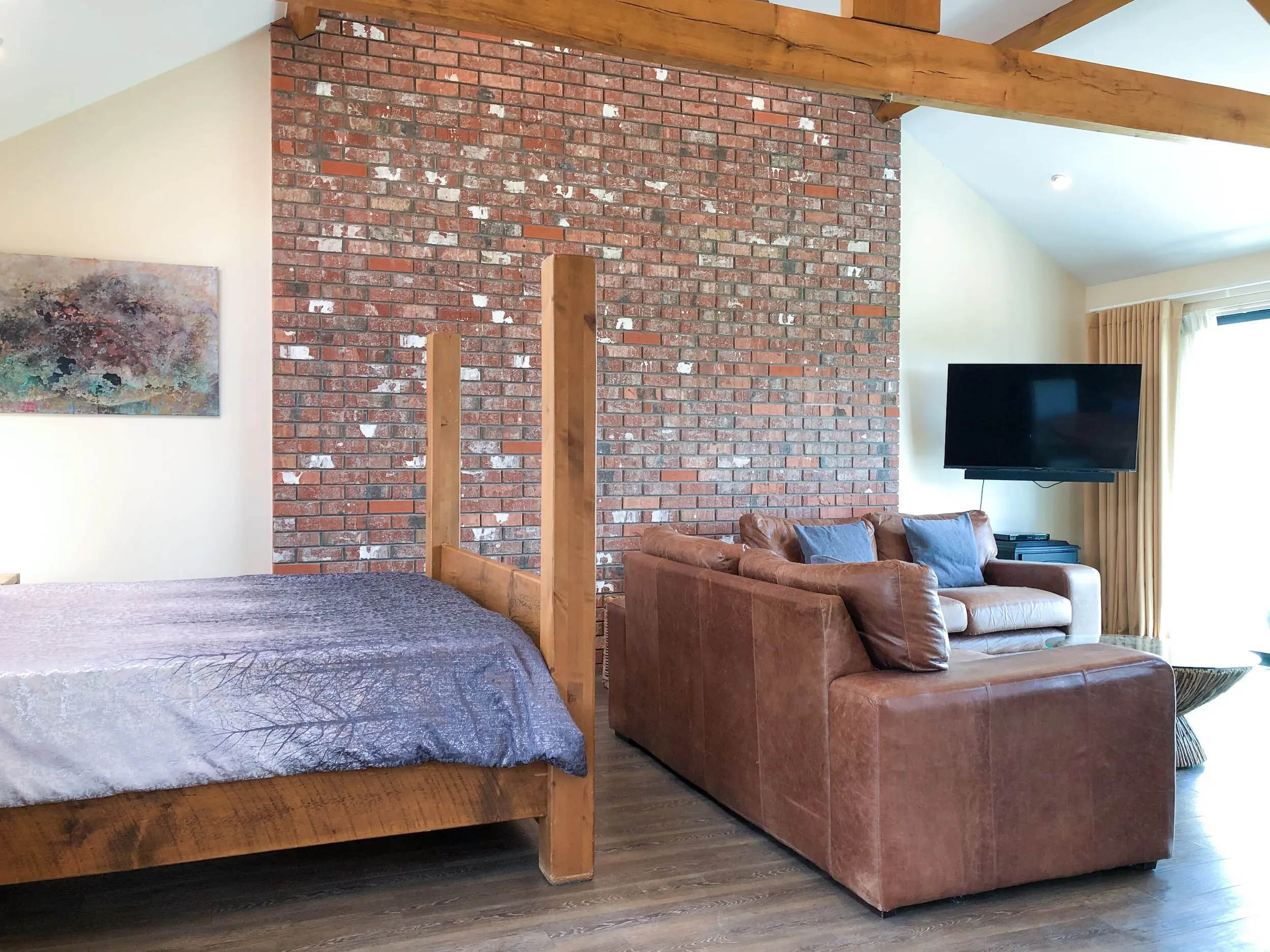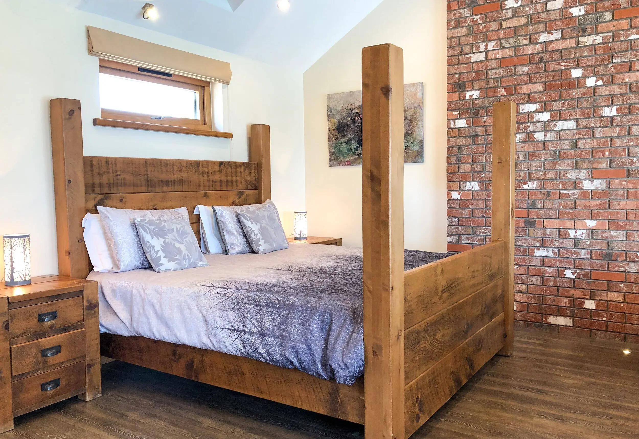 At the heart of this open-plan apartment is a handcrafted four-poster super-king bed, made from slow-grown Canadian pine and finished with natural beeswax to highlight the beautiful texture and grain. A memory foam mattress ensures a restful night’s sleep.