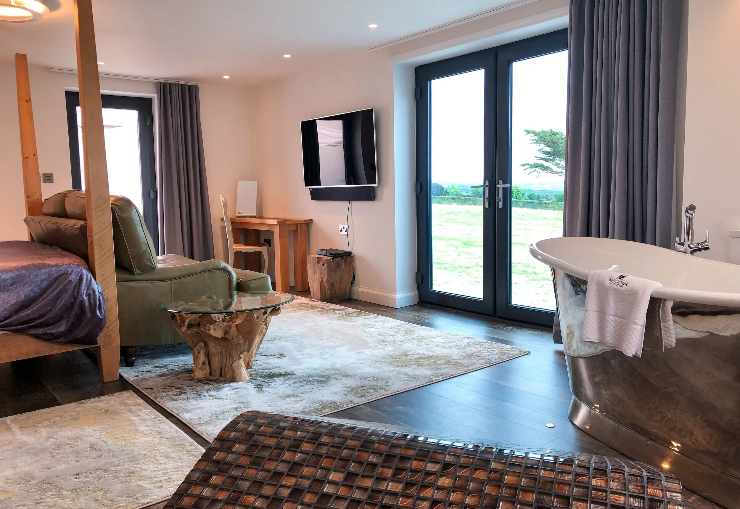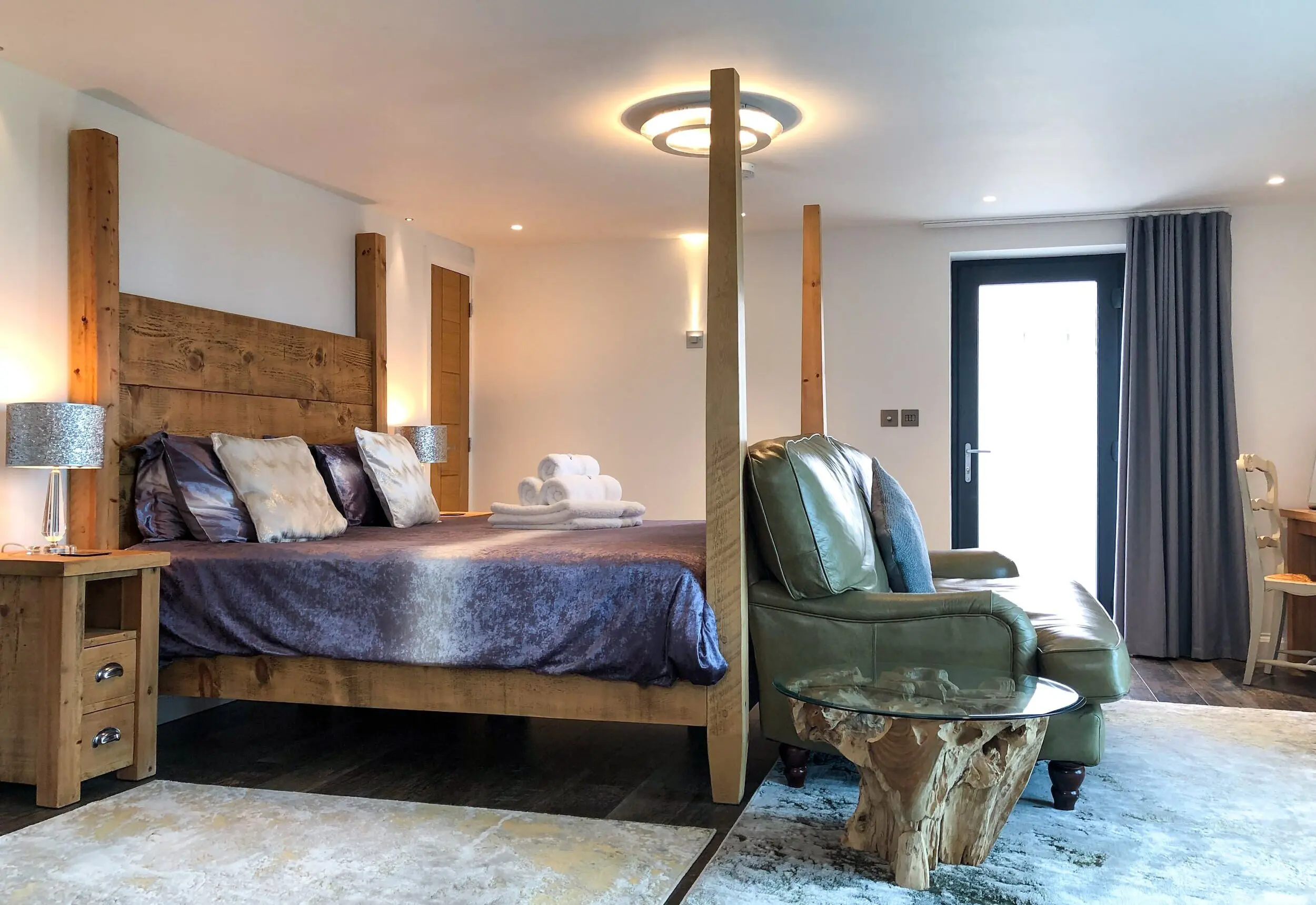 Located on the first floor, Moonraker combines contemporary design with indulgent comfort. The open-plan bedroom features a four-poster super-king bed with a sumptuous memory foam mattress, while the sitting area includes a cosy sofa — perfect for unwinding.