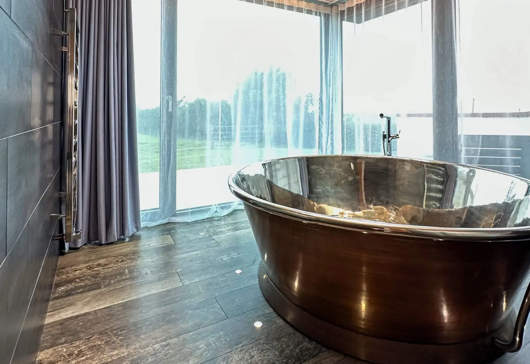 The centrepiece of the apartment is the free-standing bateau spa bath, featuring a polished nickel exterior and enameled interior. Meticulously hand-finished by master craftsmen at the world’s leading copper bath specialists, it offers a luxurious bathing experience.
