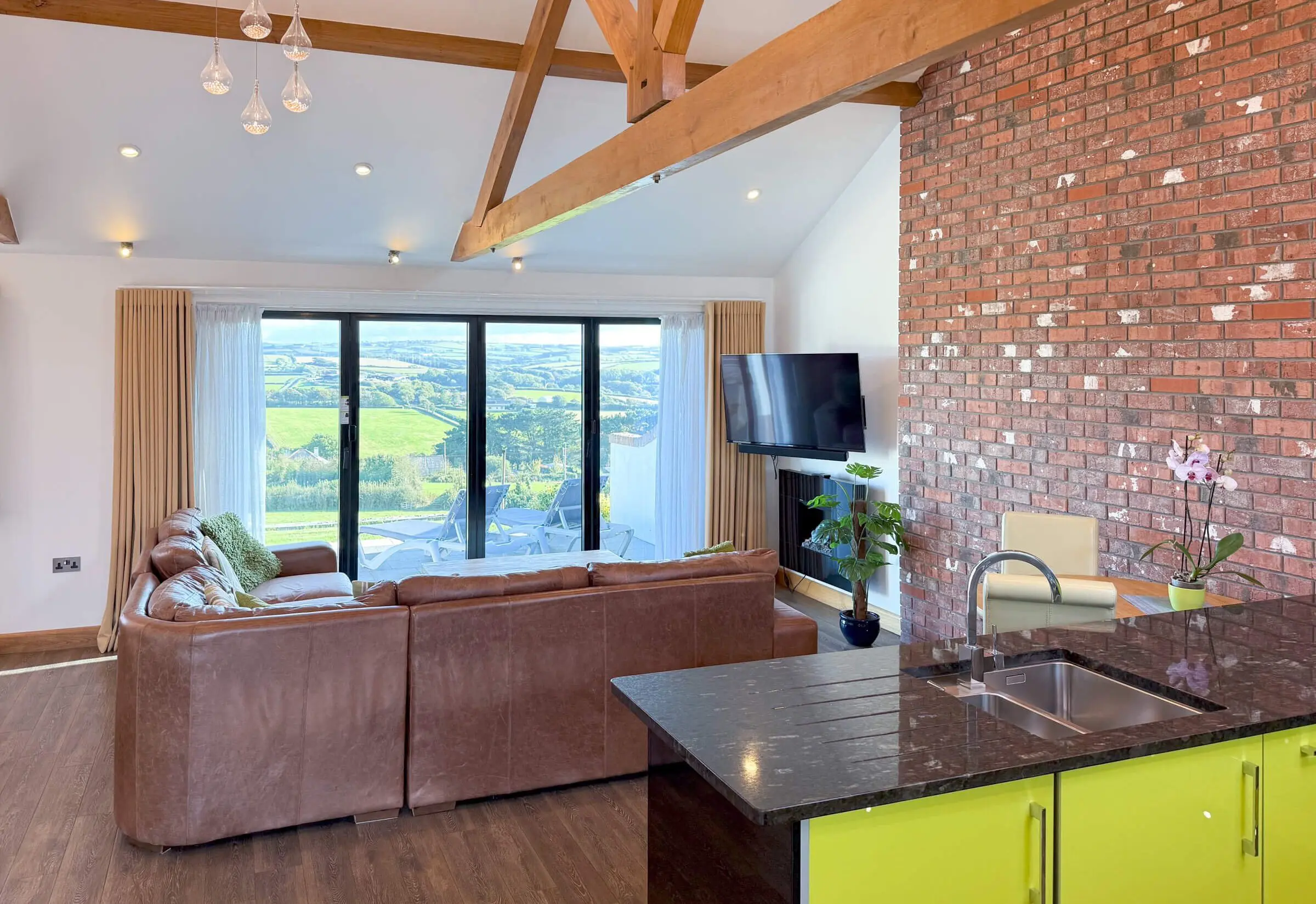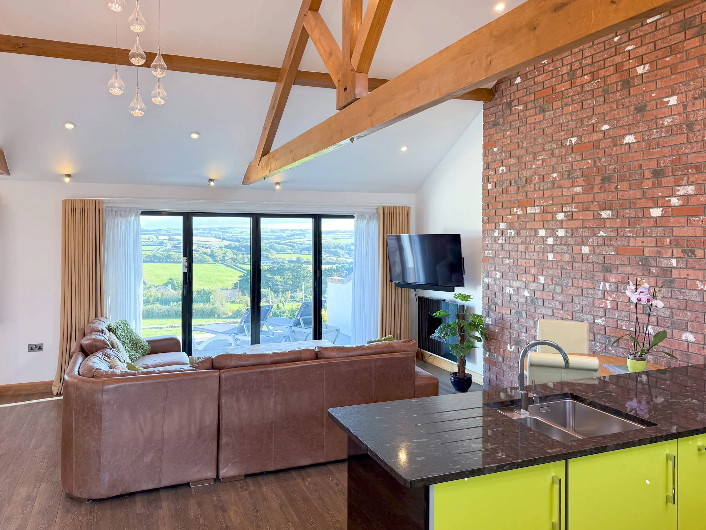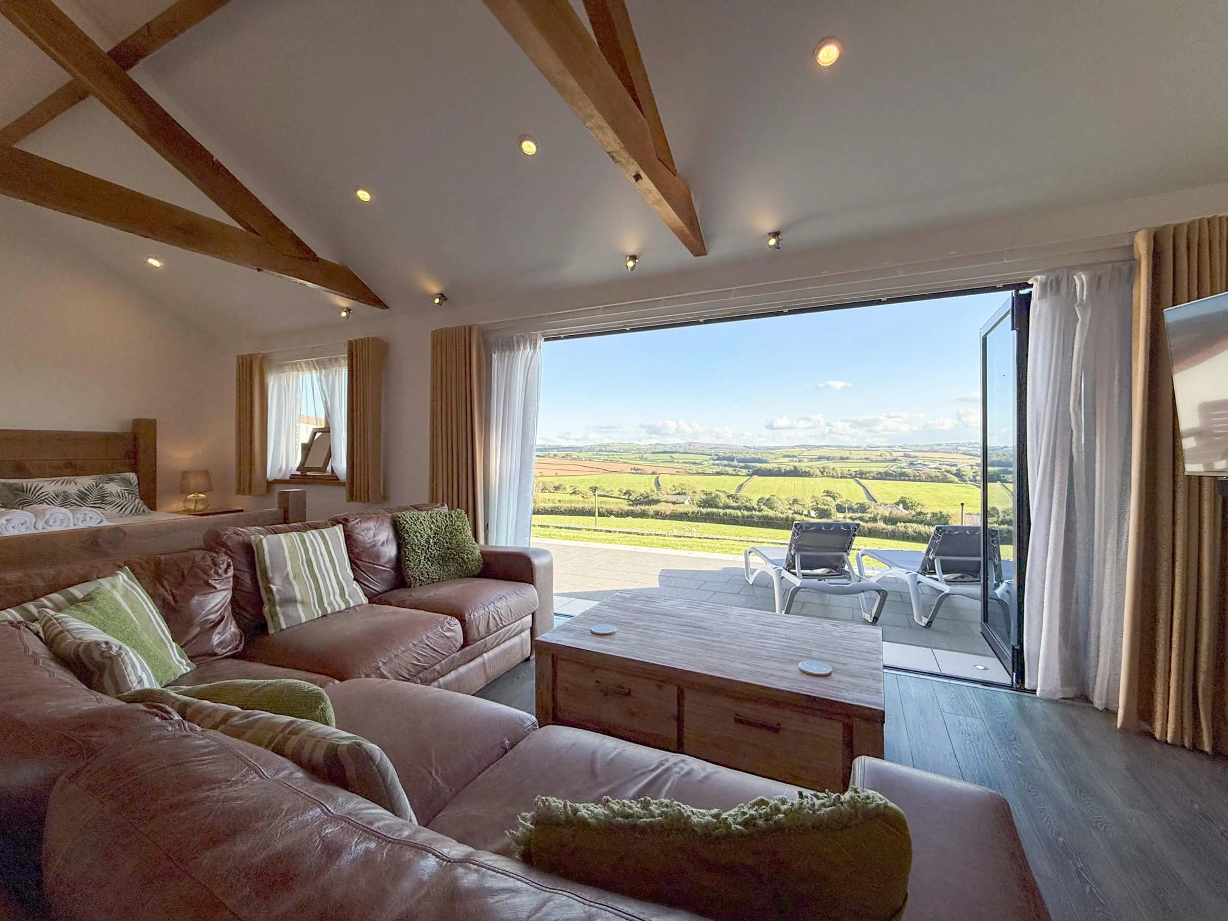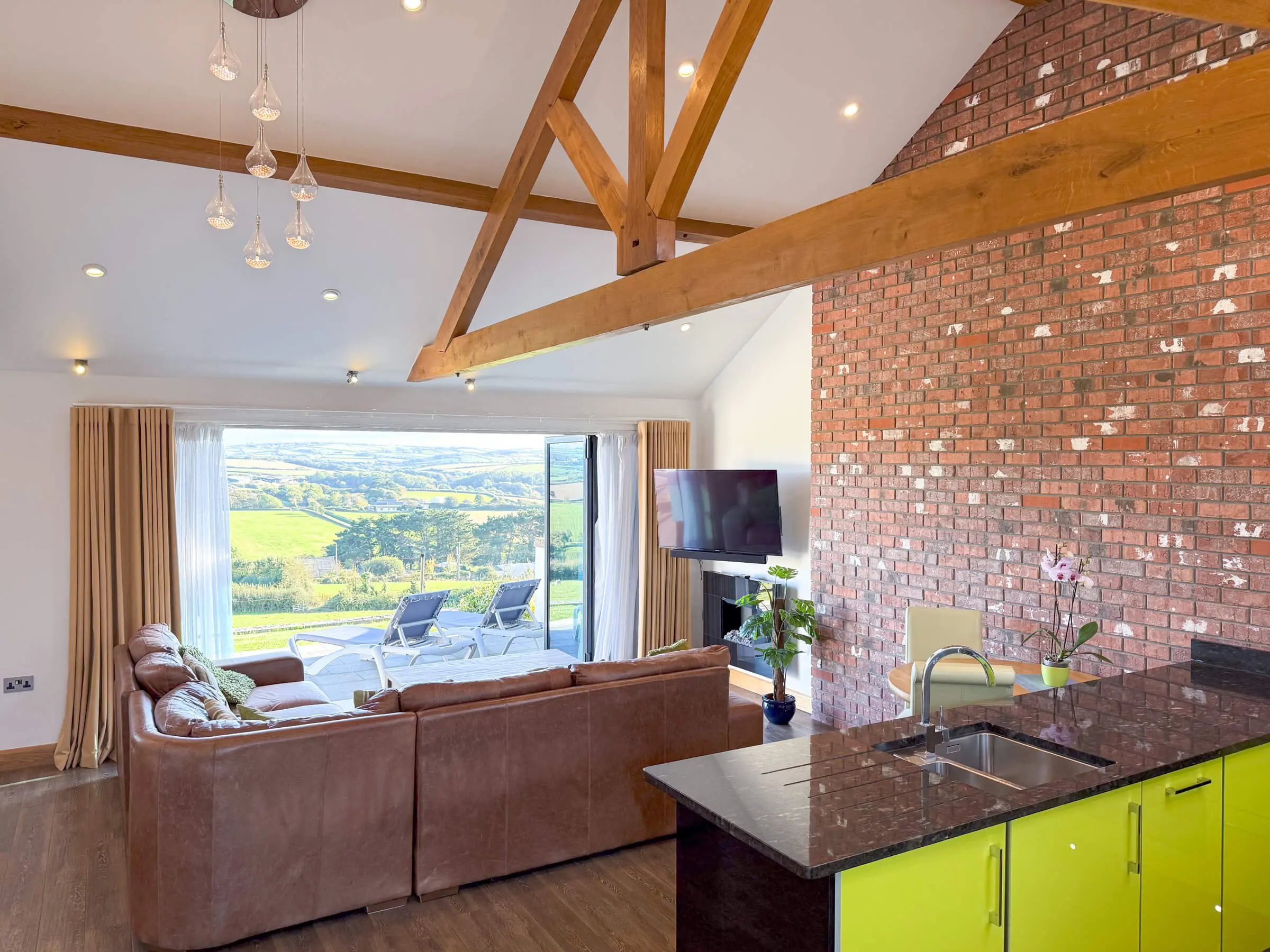 Relax on the spacious corner sofa and take in far-reaching countryside views. The characterful oak beams add a traditional touch to the otherwise contemporary design, while large bi-fold doors open wide to frame the Cornish landscape.