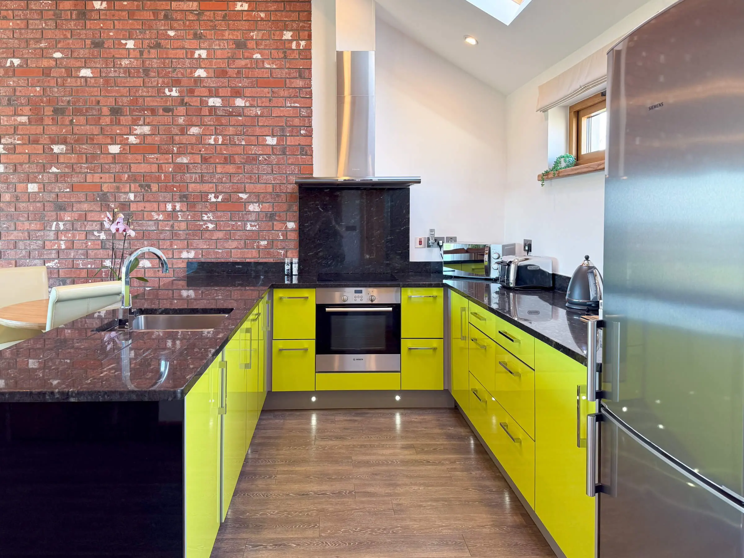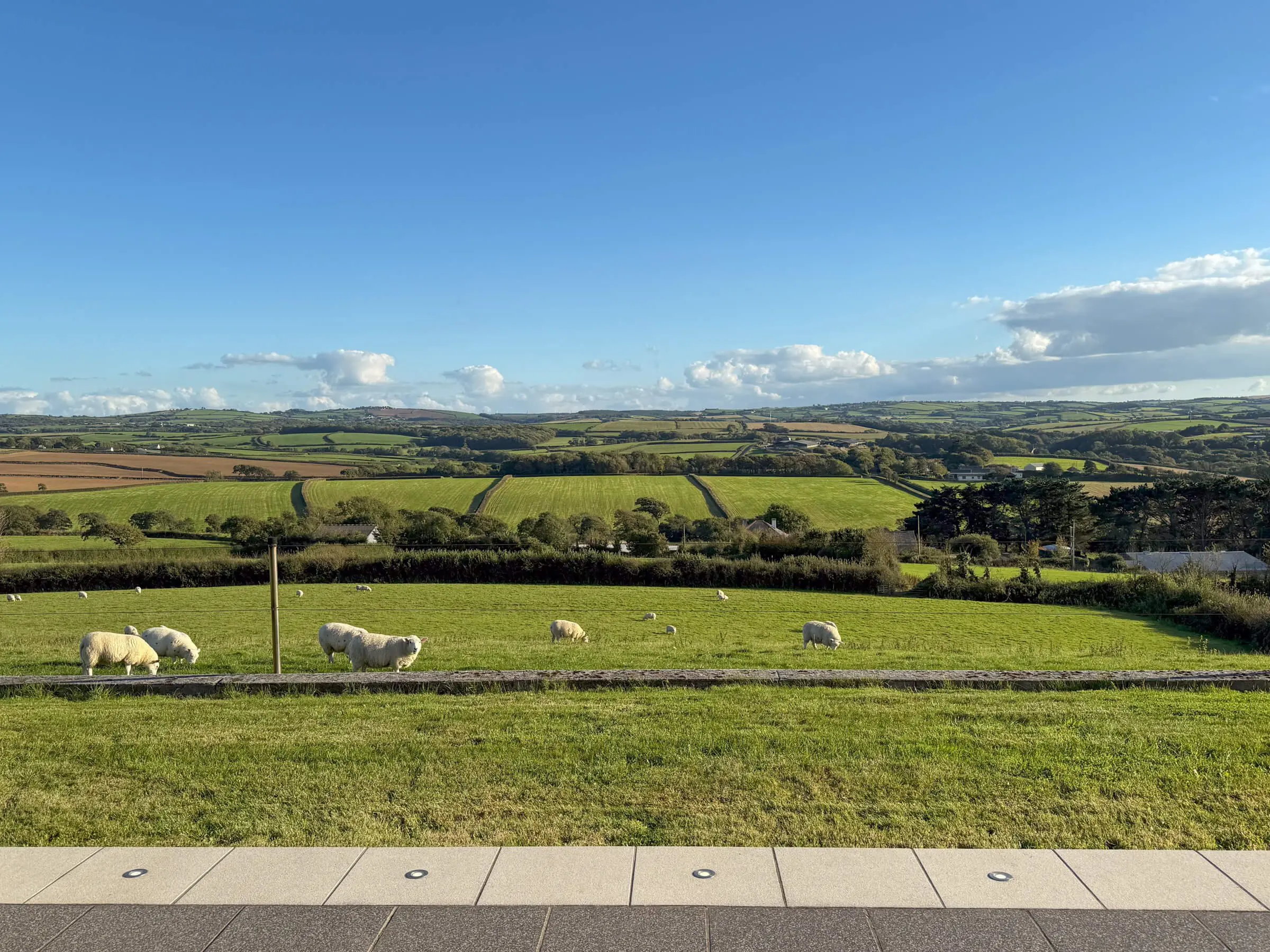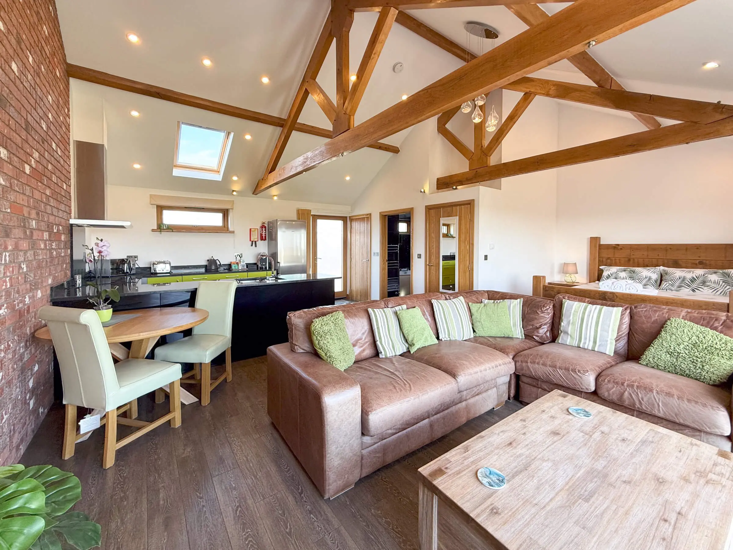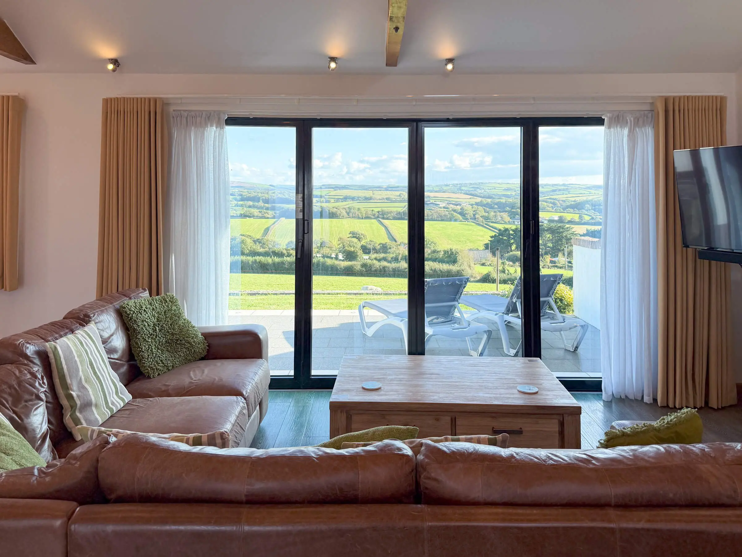 Relax on the spacious corner sofa and take in far-reaching countryside views. The characterful oak beams add a traditional touch to the otherwise contemporary design, while large bi-fold doors open wide to frame the Cornish landscape.