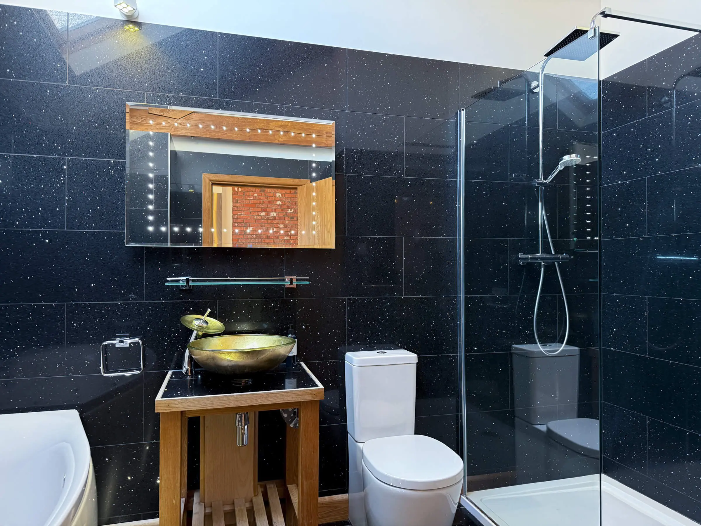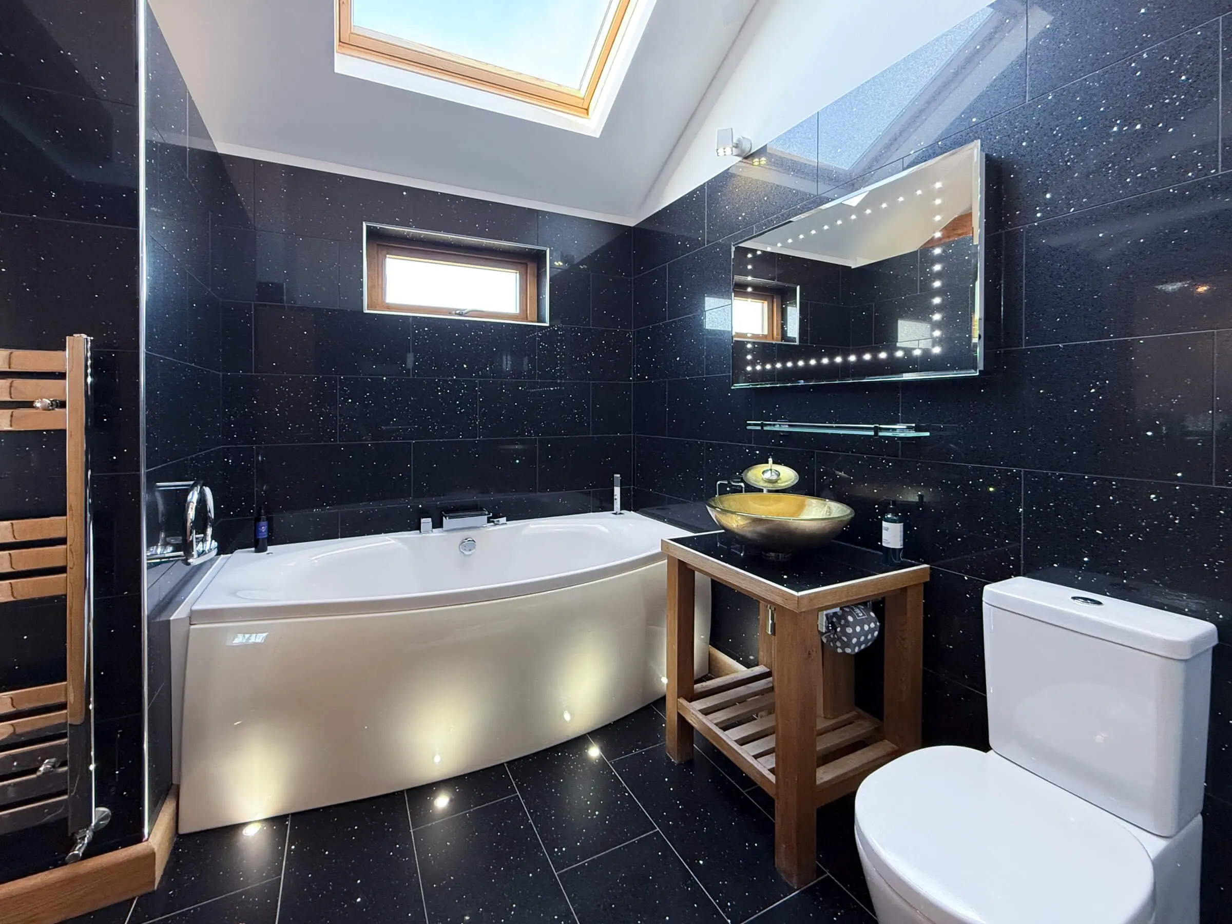 The en-suite bathroom combines style and luxury, with bold black sparkling tiles, a spa bath, a walk-in rainfall shower, and a waterfall tap with a round basin. Locally made toiletries and bath foam are provided for an added touch of indulgence.