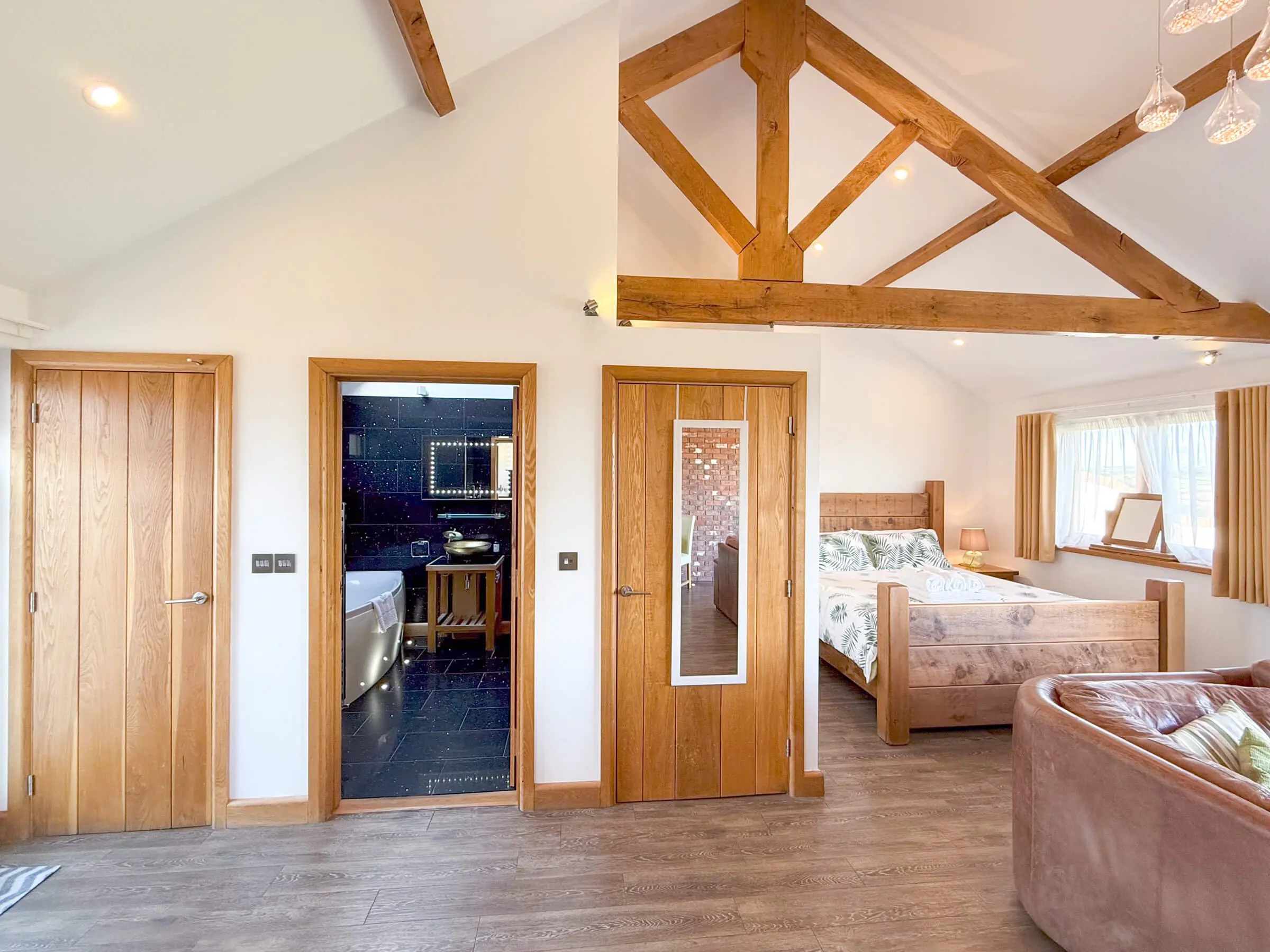 The open-plan apartment features a super-king bed positioned beside the living area. Handcrafted from slow-grown Canadian pine and finished with natural beeswax to highlight its grain and texture, the bed is paired with a memory foam mattress for restful comfort.