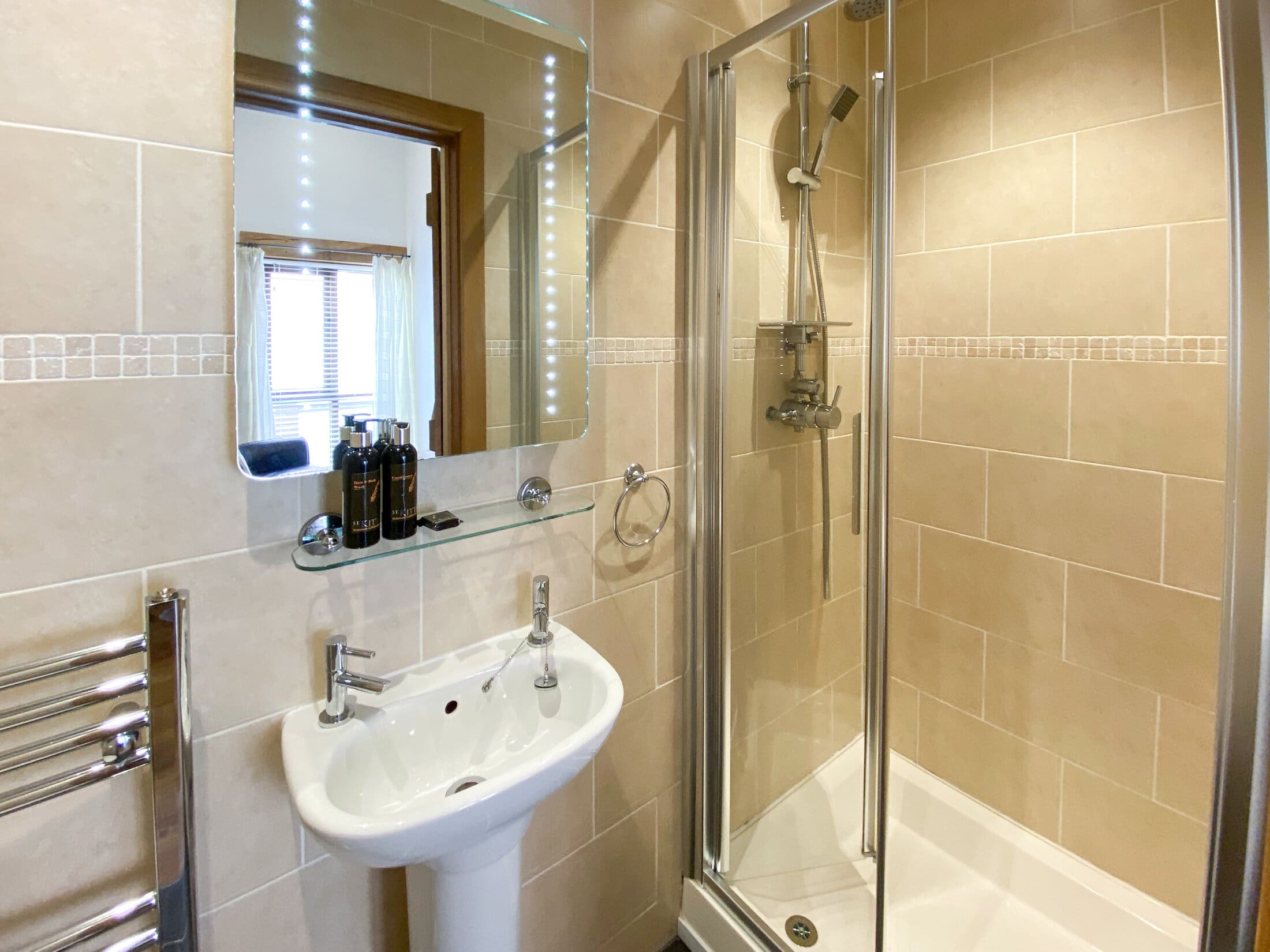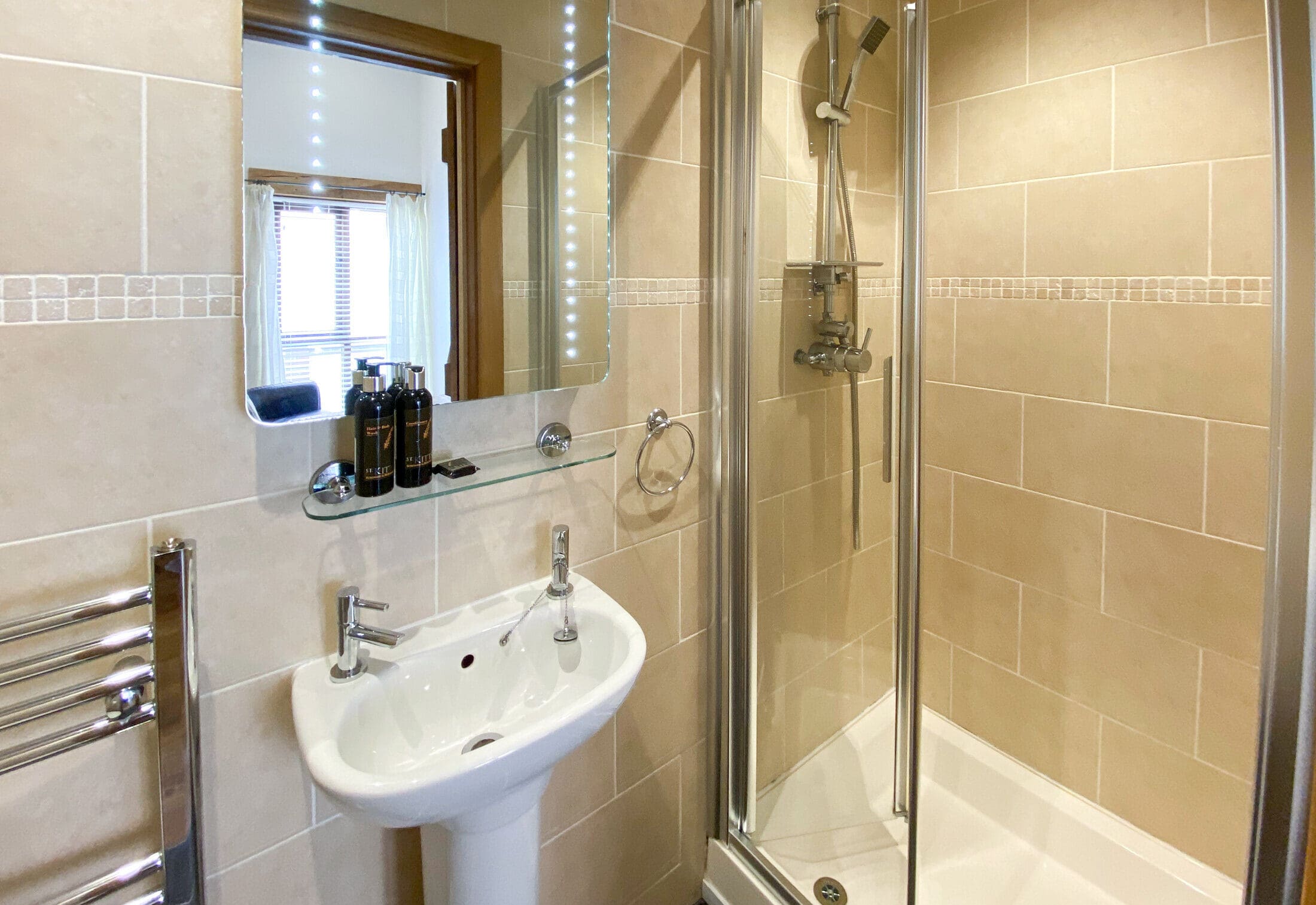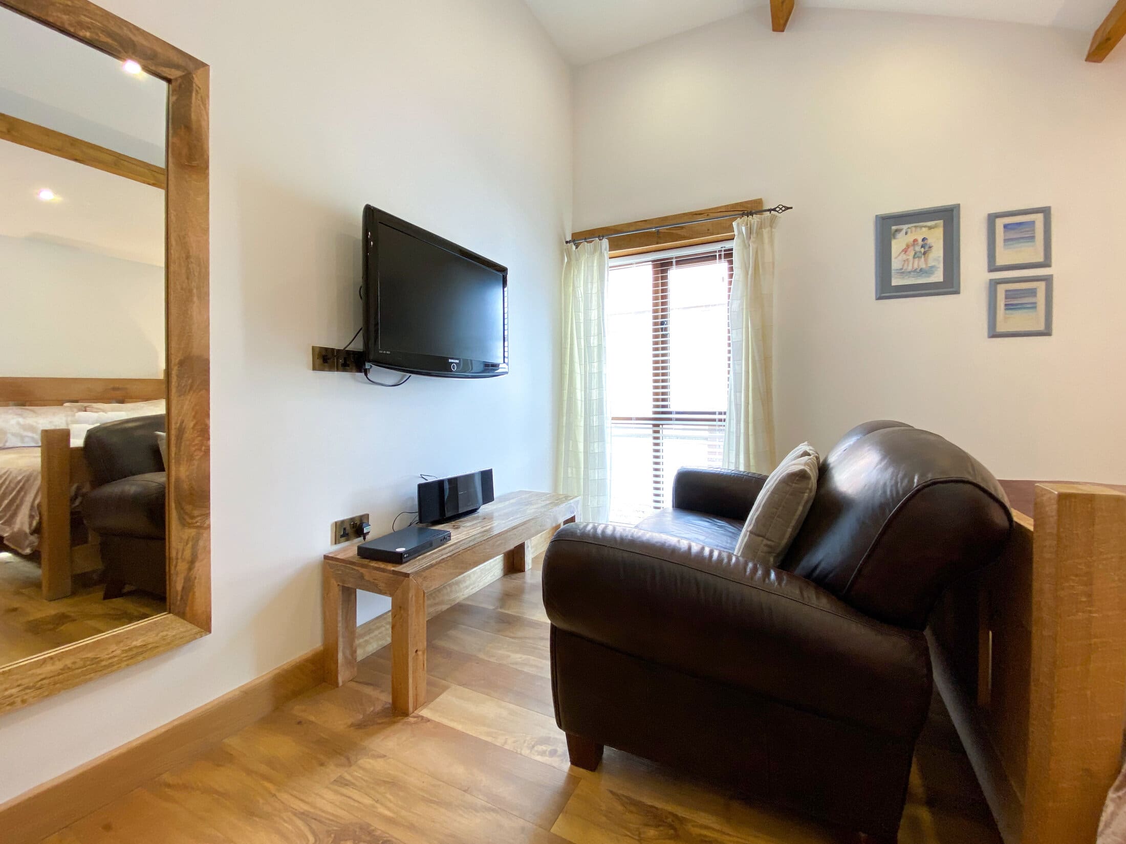 Thoughtful touches include chunky handmade oak furnishings, underfloor heating for cosy comfort during cooler months, a 43” Smart TV, and a Blu-Ray/DVD player.