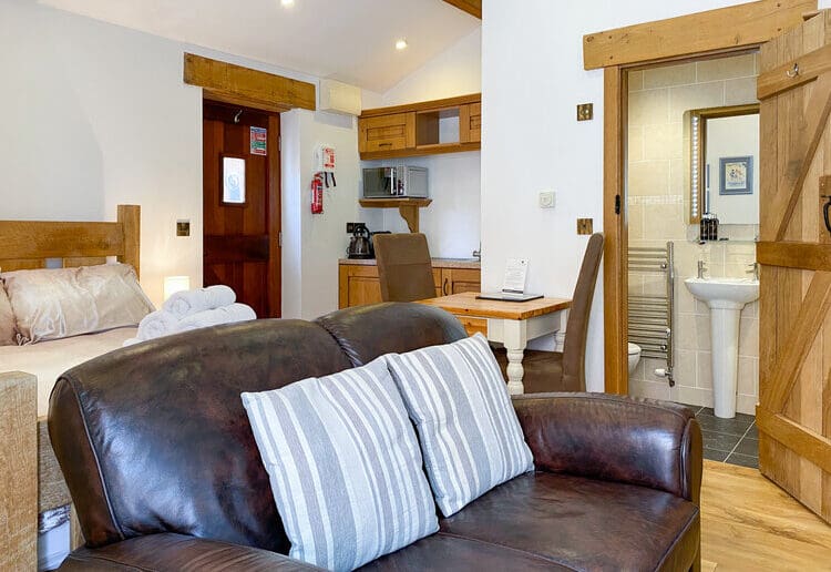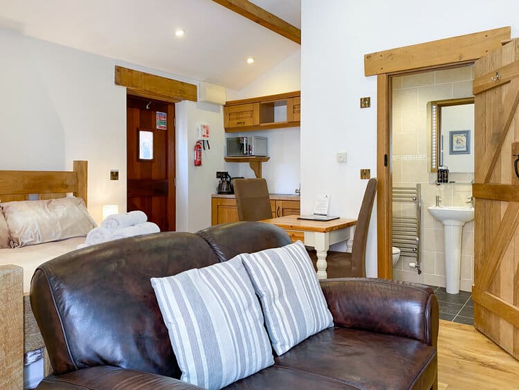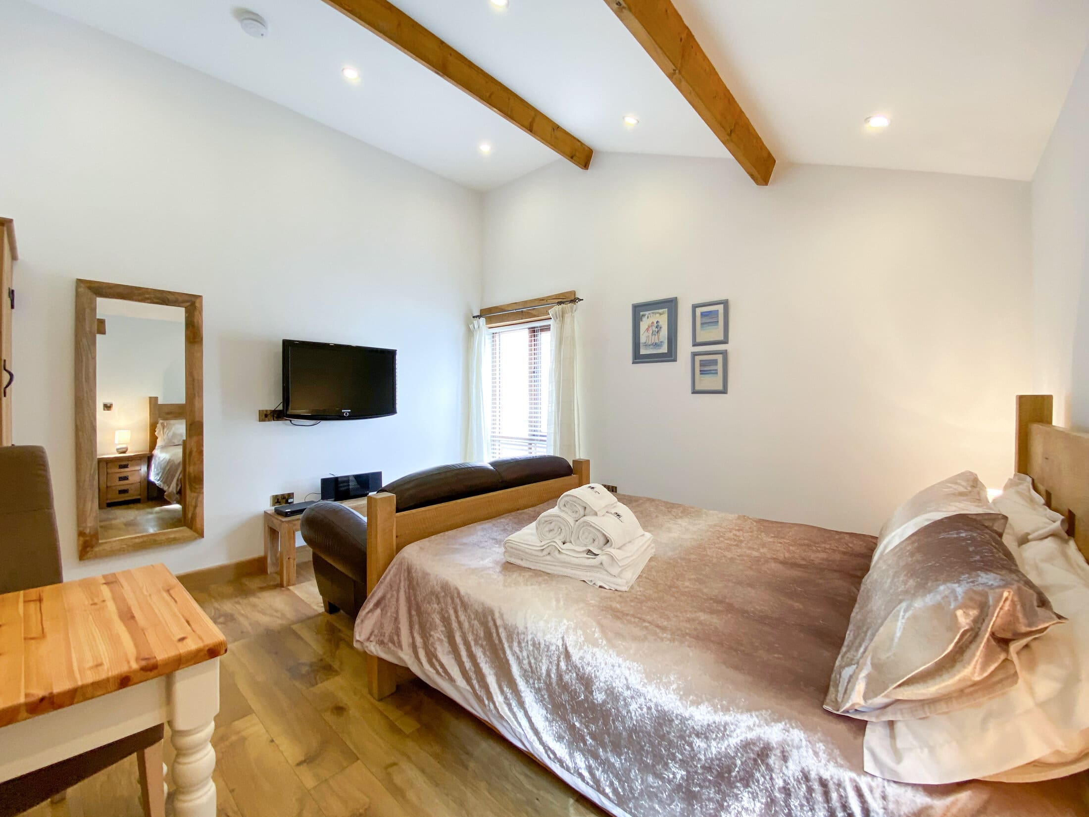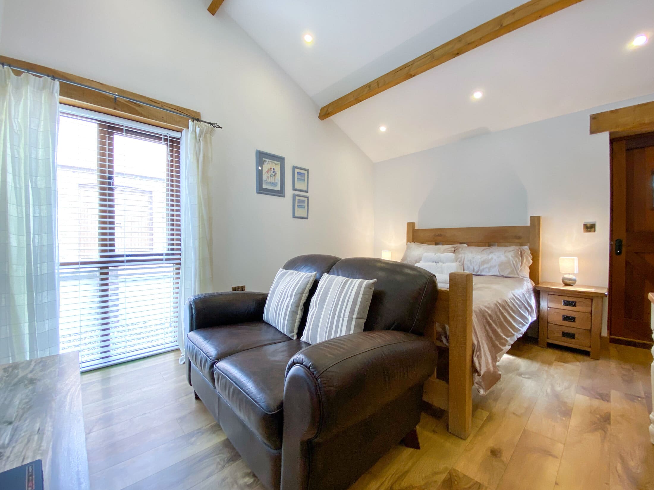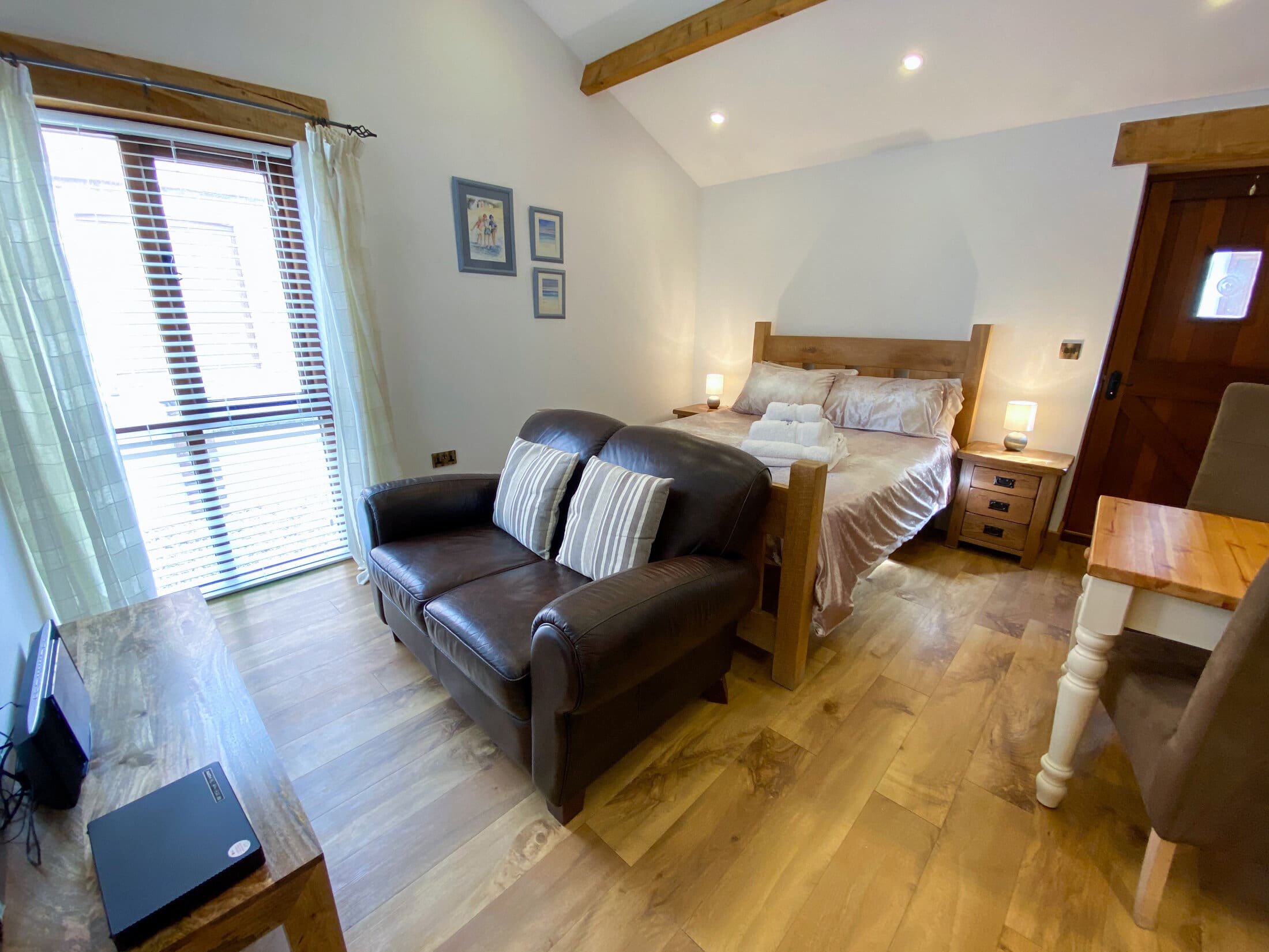 An open-plan hideaway featuring a king-size bed, compact kitchenette, and small shower room – ideal for walkers or cyclists exploring the nearby South West Coast Path.