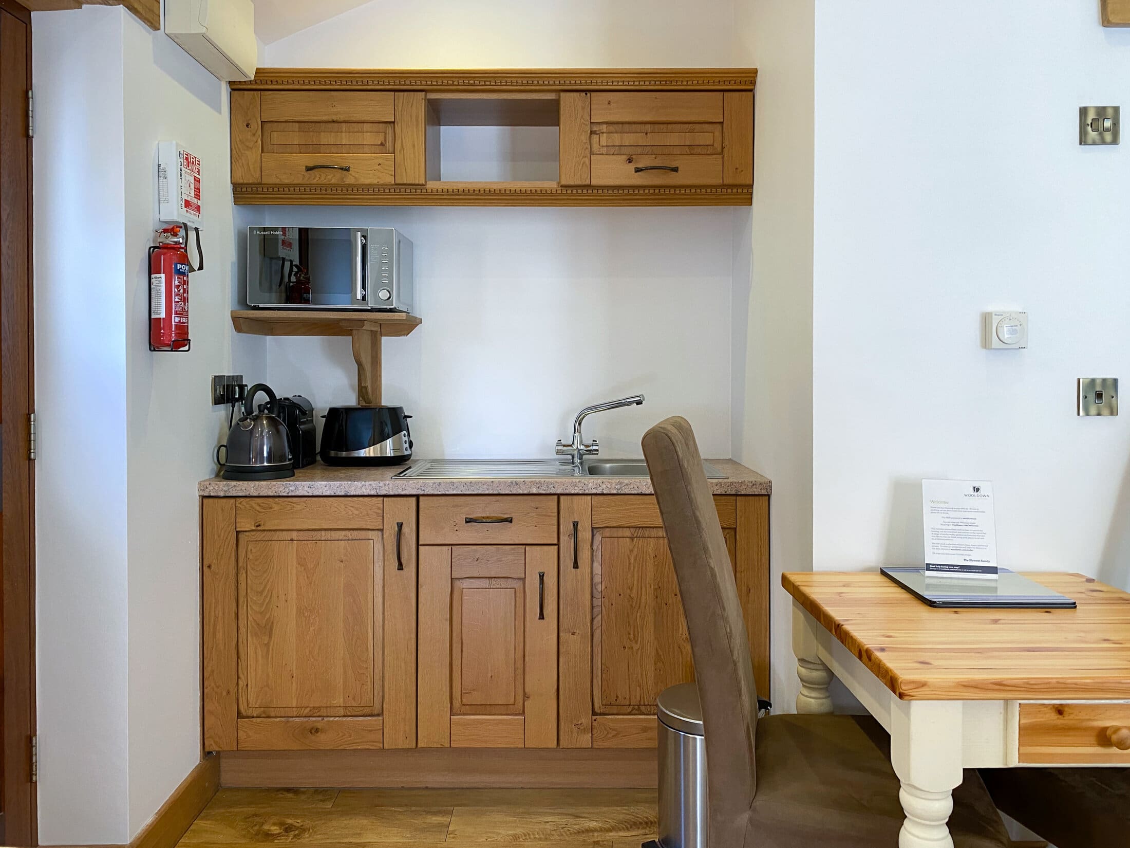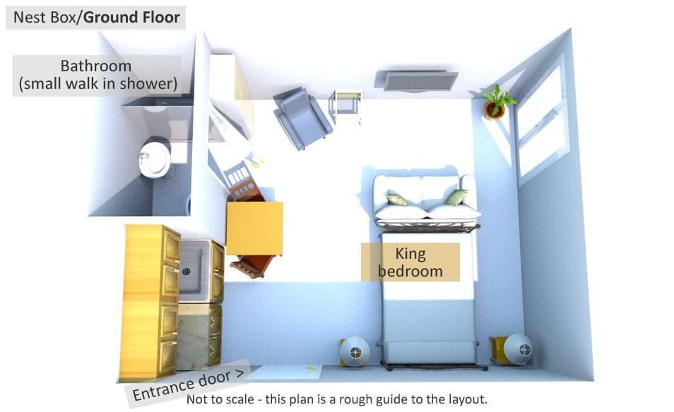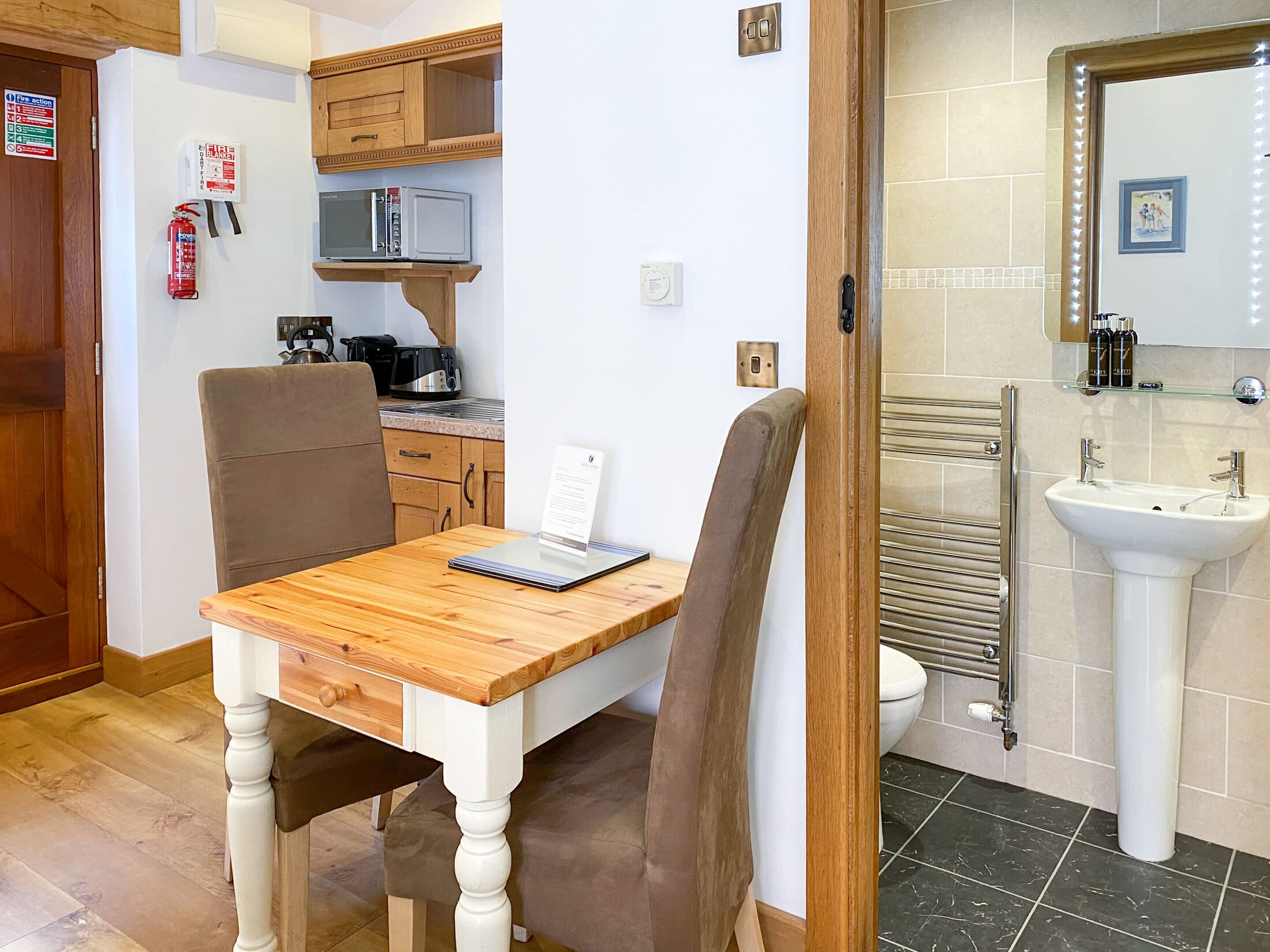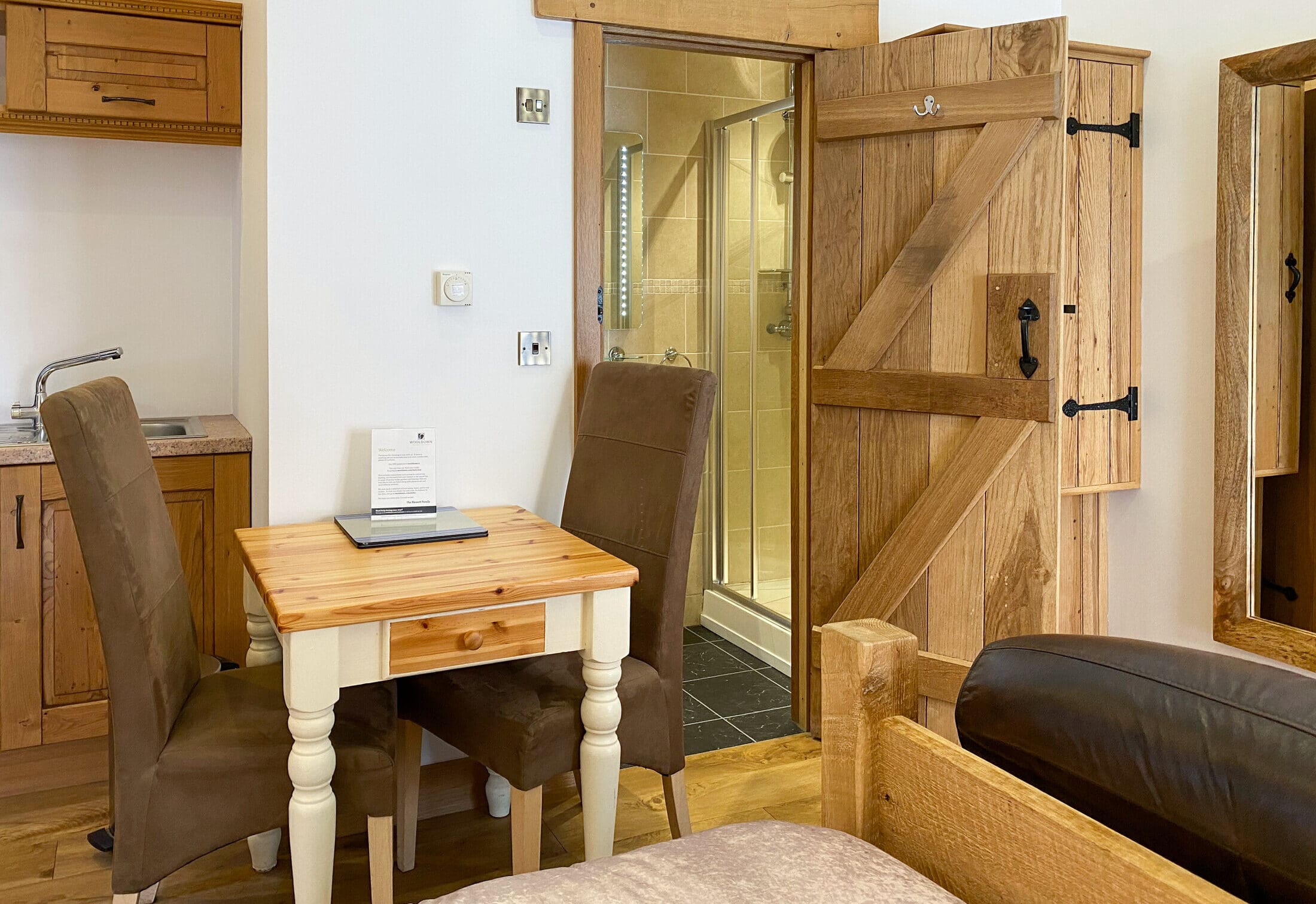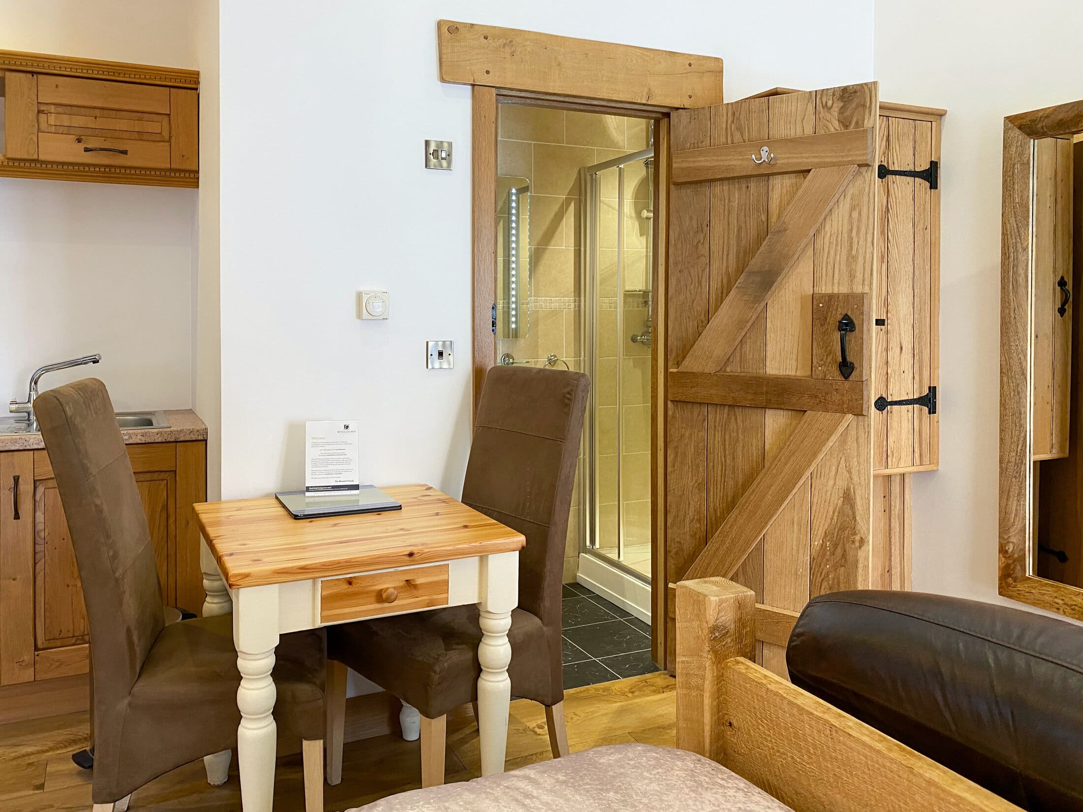 An open-plan hideaway featuring a king-size bed, compact kitchenette, and small shower room – ideal for walkers or cyclists exploring the nearby South West Coast Path.