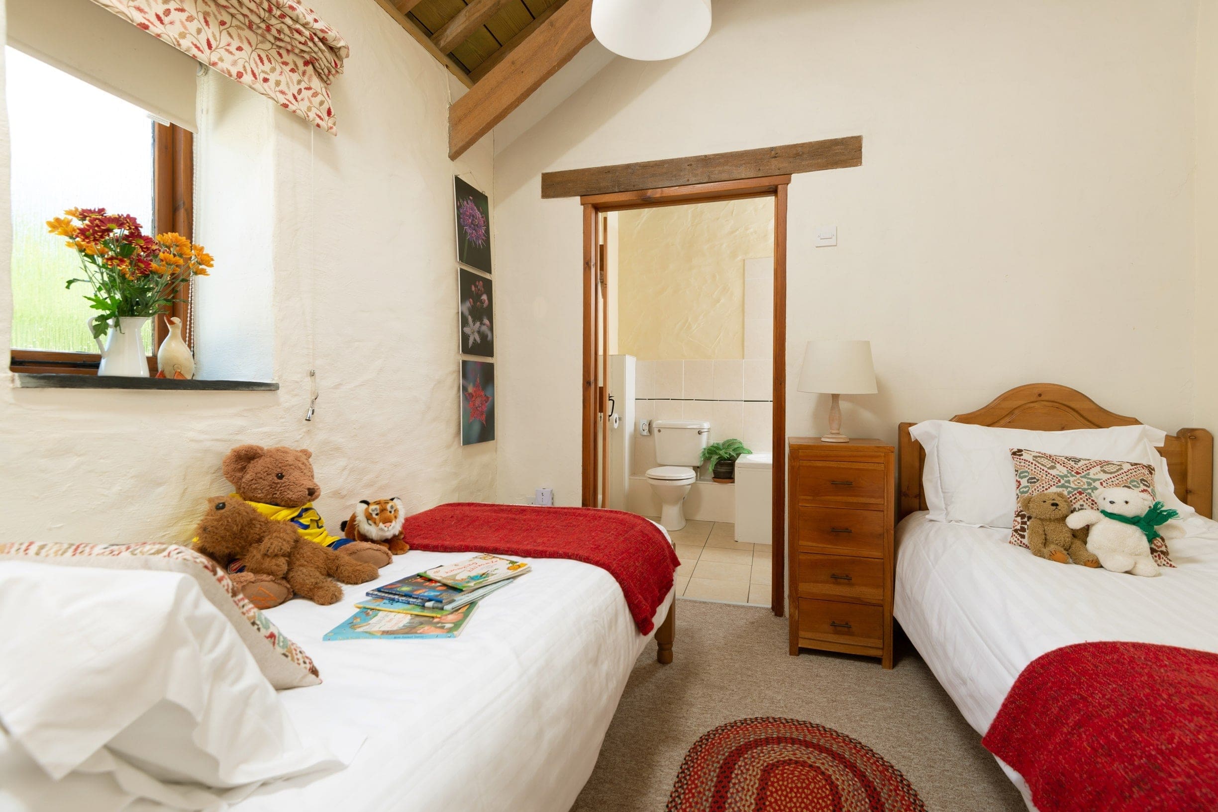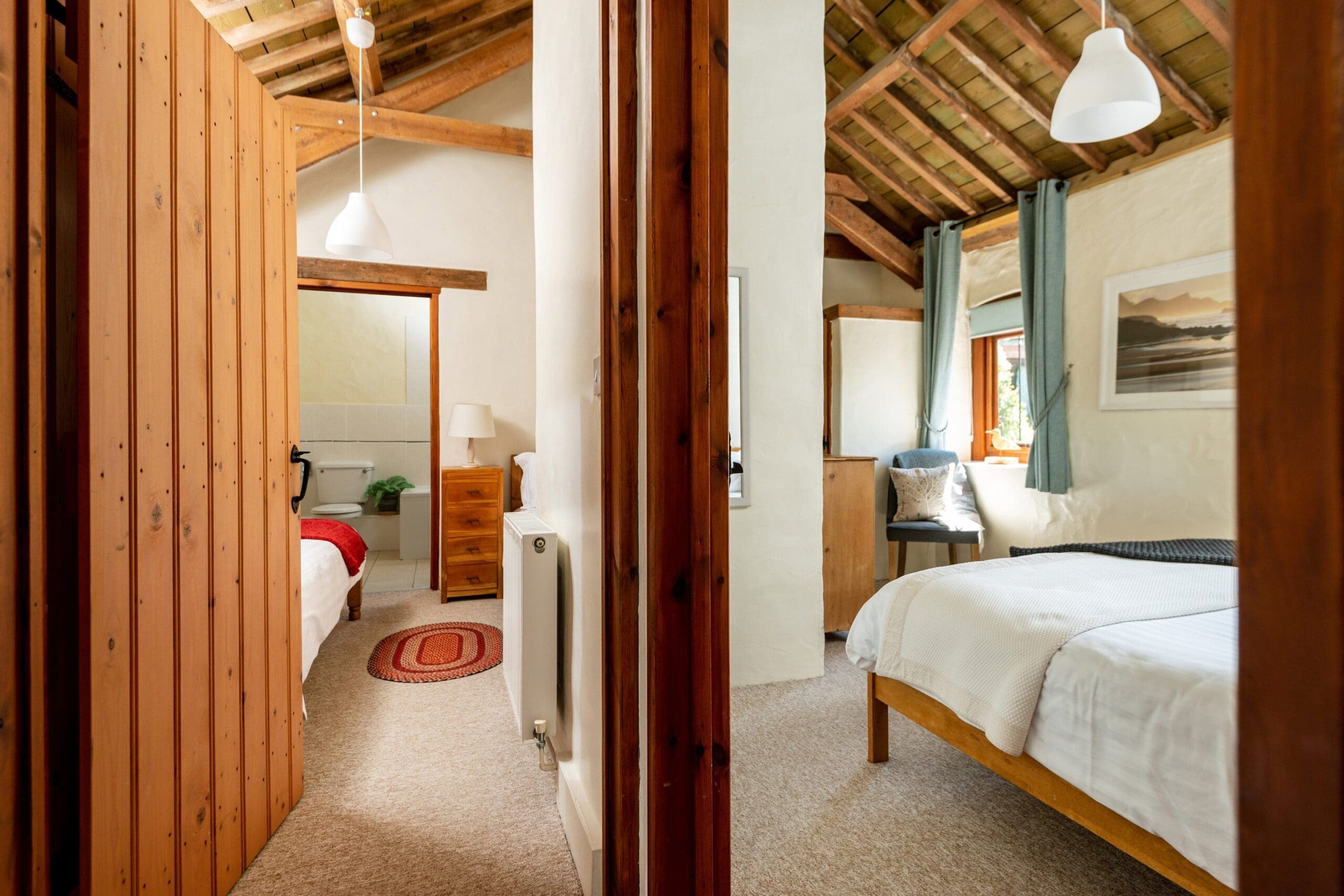There are two bedrooms, a double with an en-suite shower room, and one with two single beds and an en-suite family bathroom.