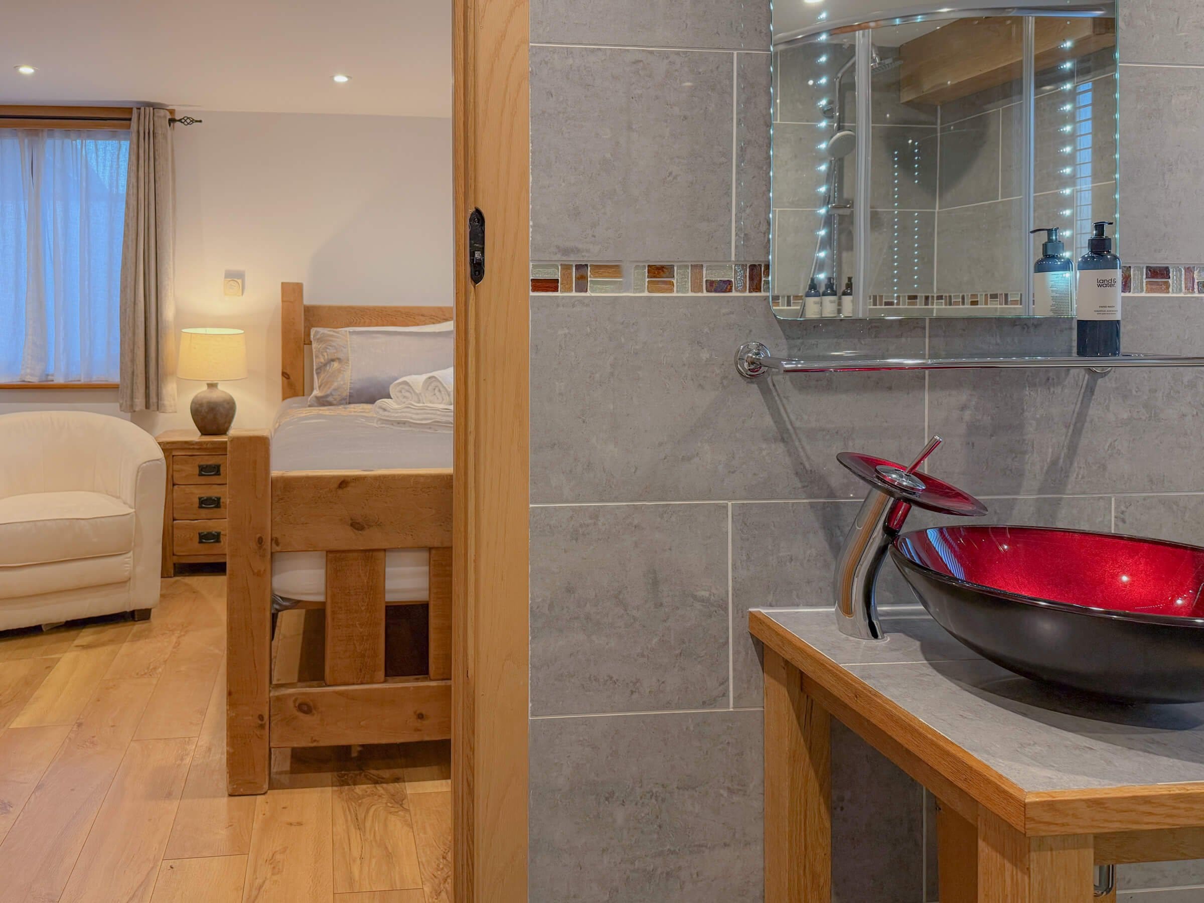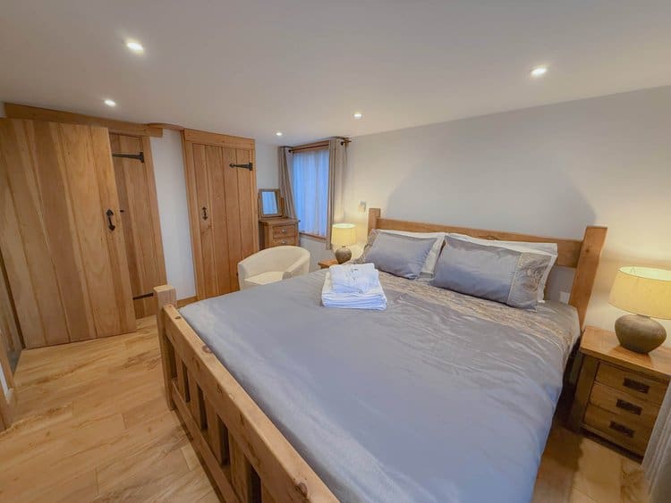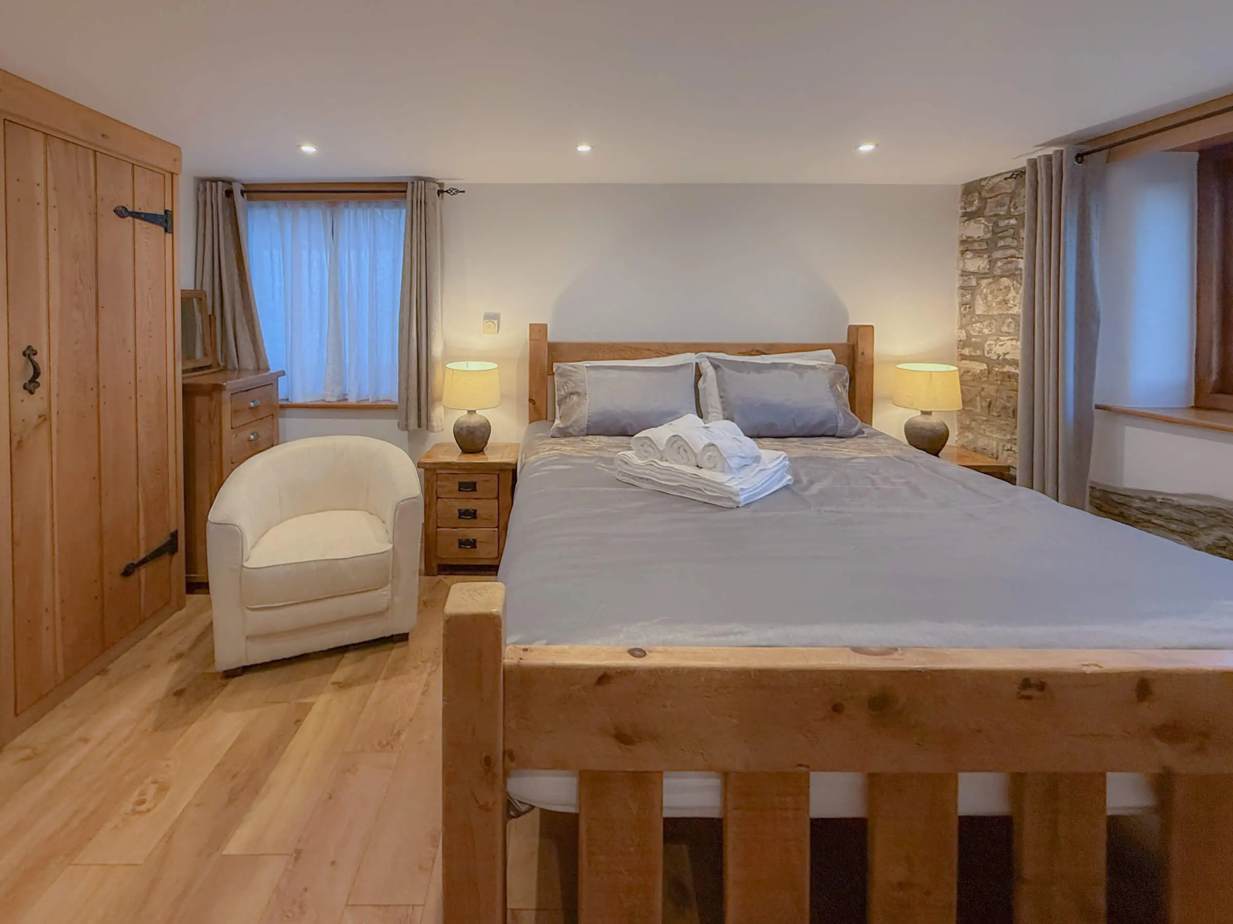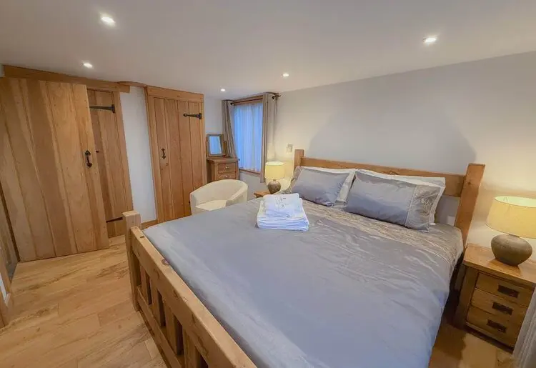 The bedroom features a handcrafted Canadian pine plank-slat super king-size bed with a memory foam mattress, offering both rustic charm and luxurious comfort.