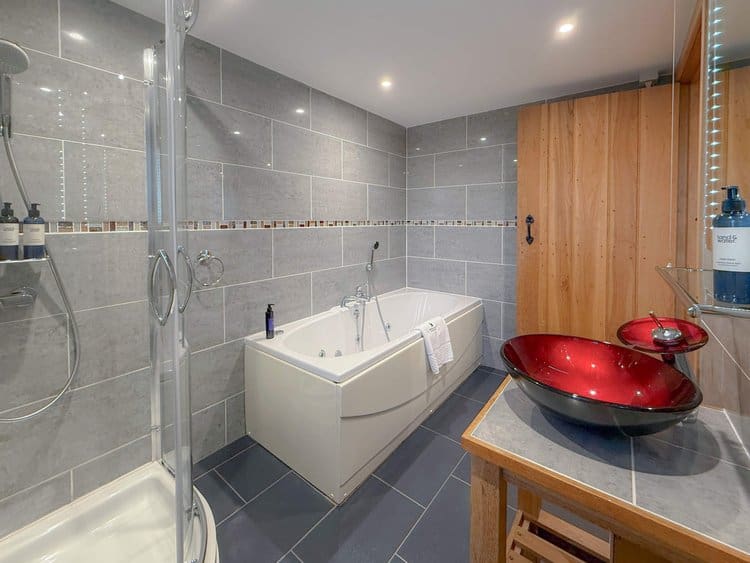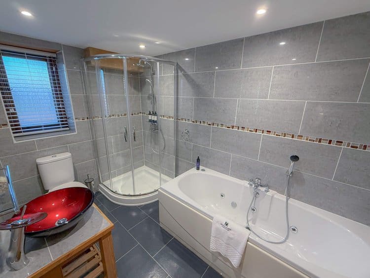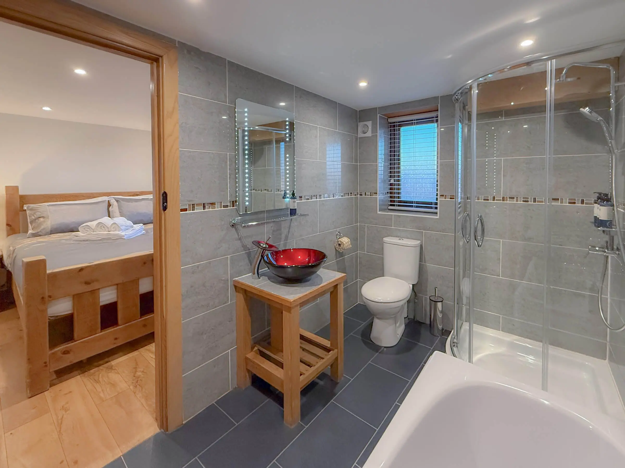 The en-suite bathroom offers modern indulgence, with bold styling and luxurious fittings. Relax in the spa bath or refresh under the walk-in rainfall shower. Locally made toiletries and bath foam are provided.