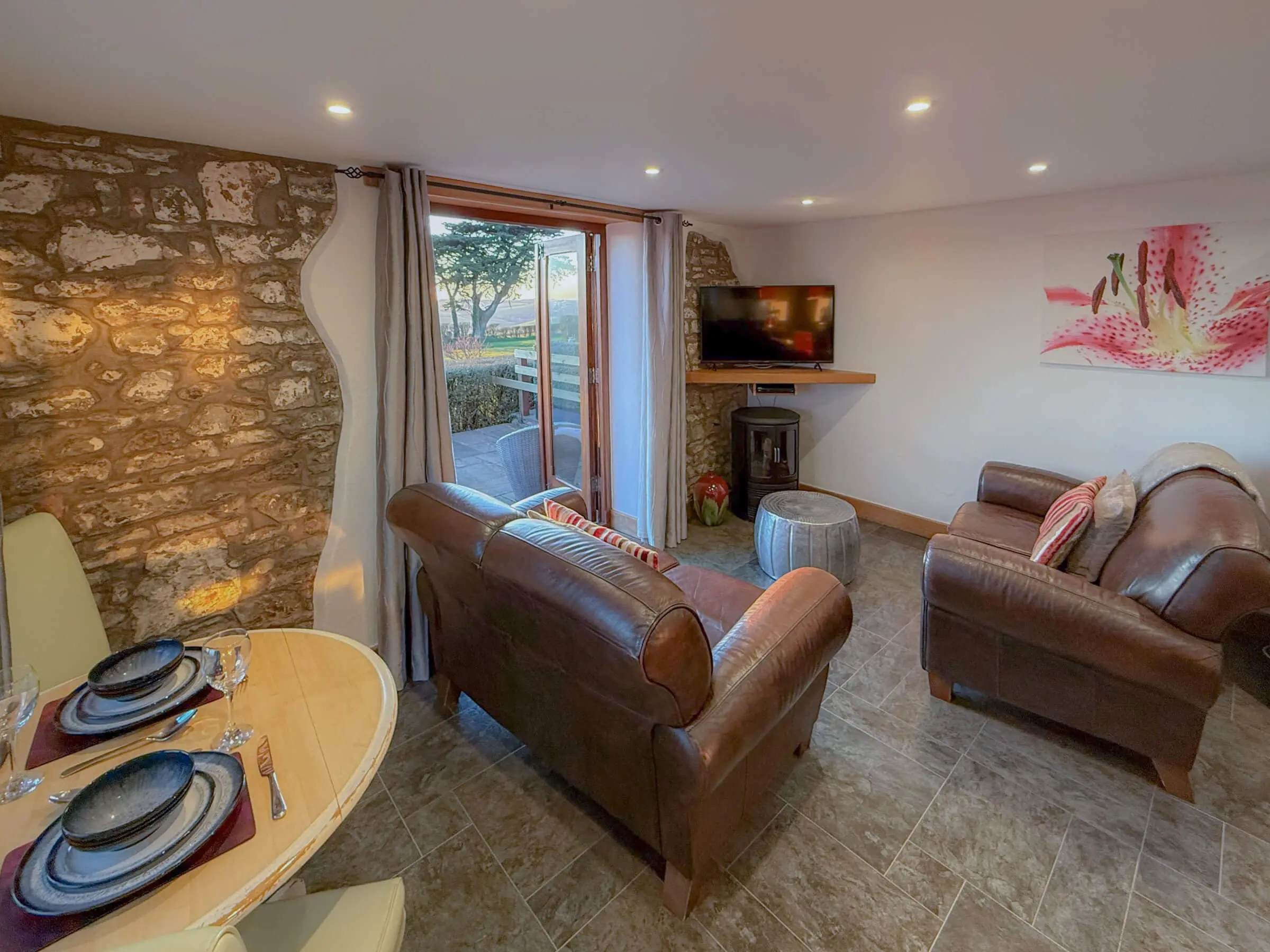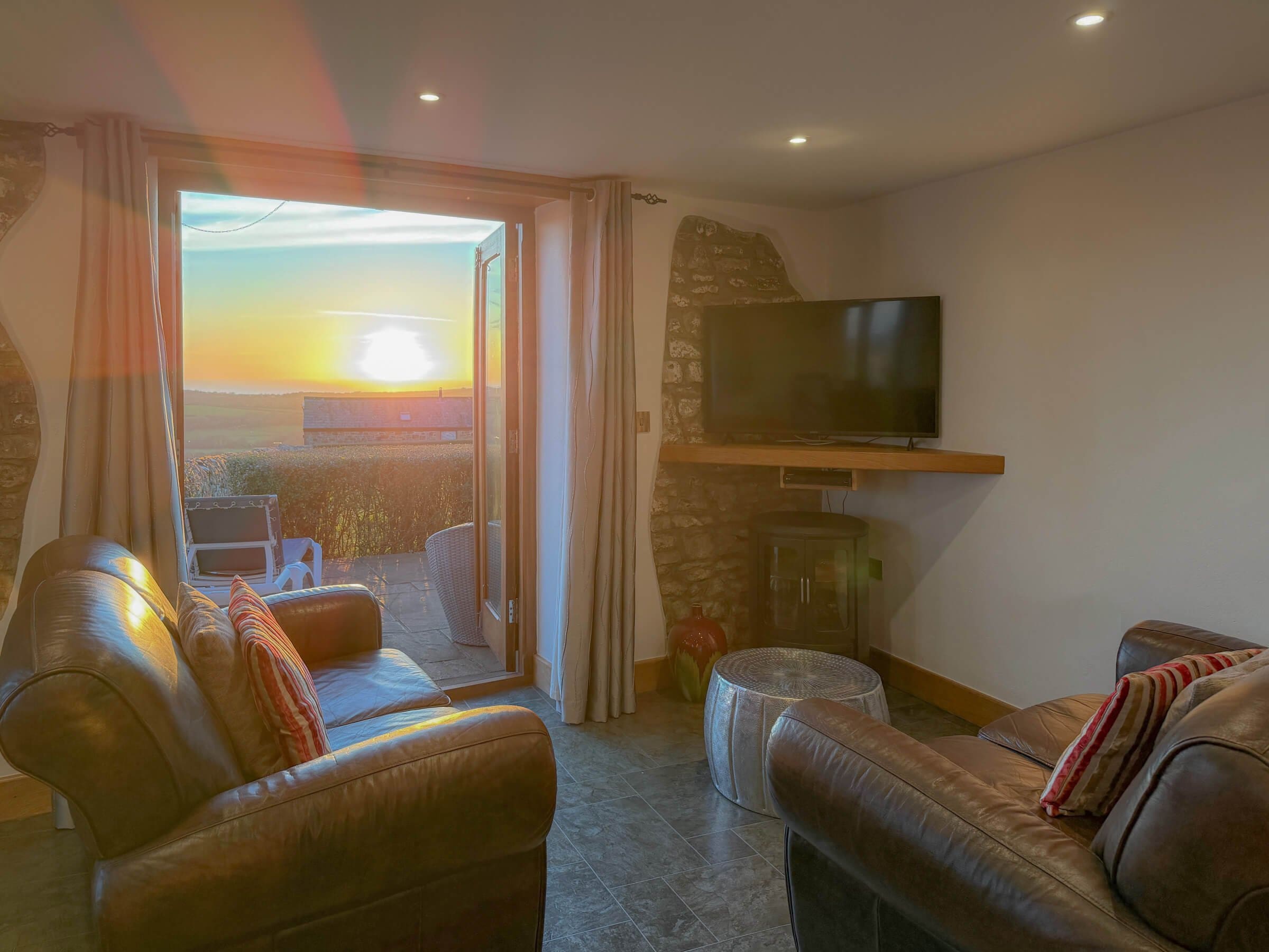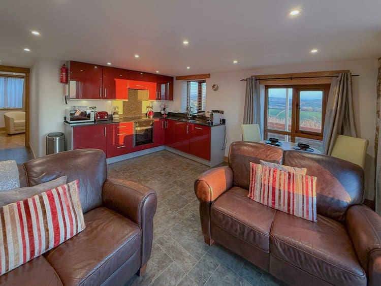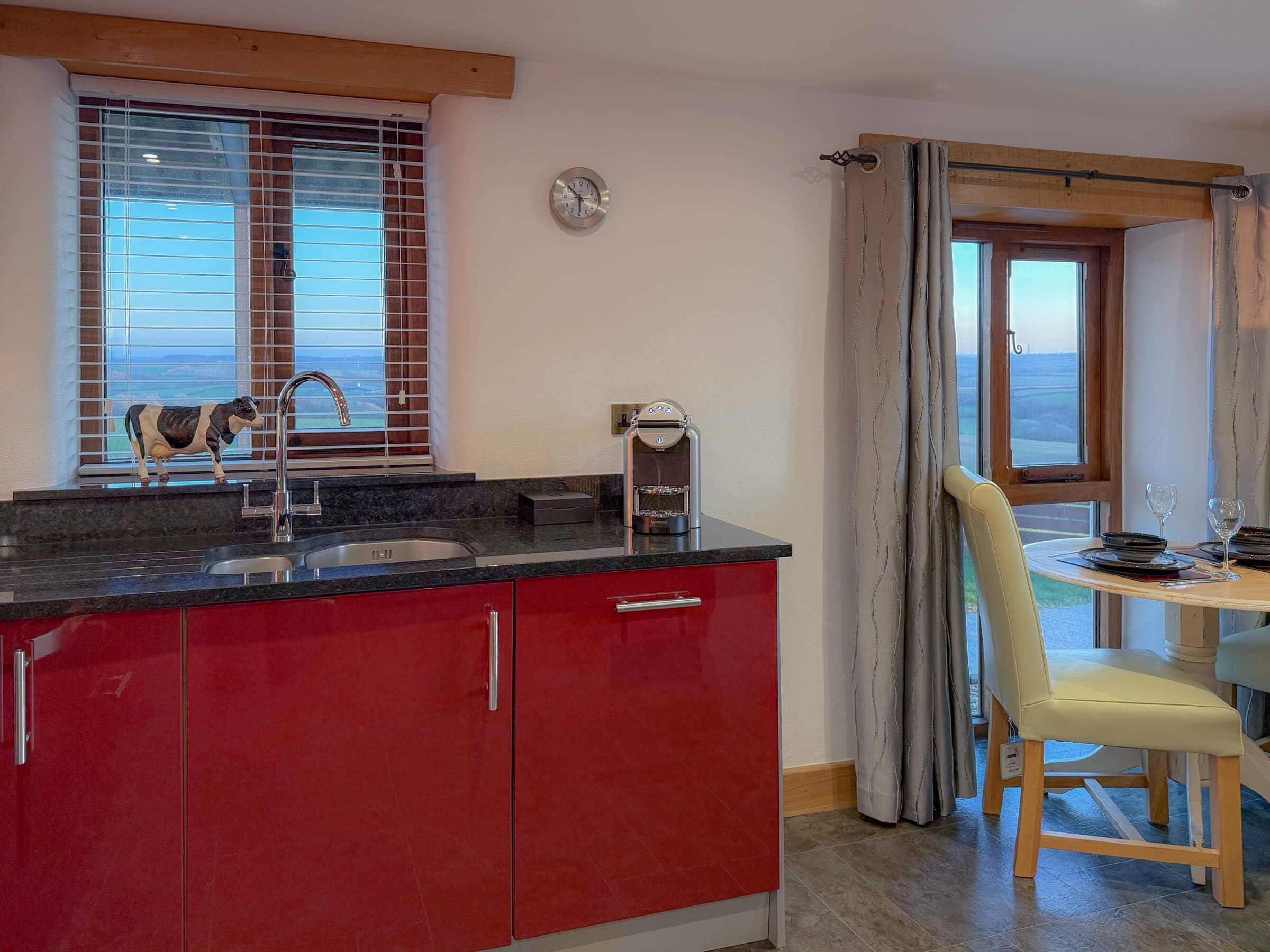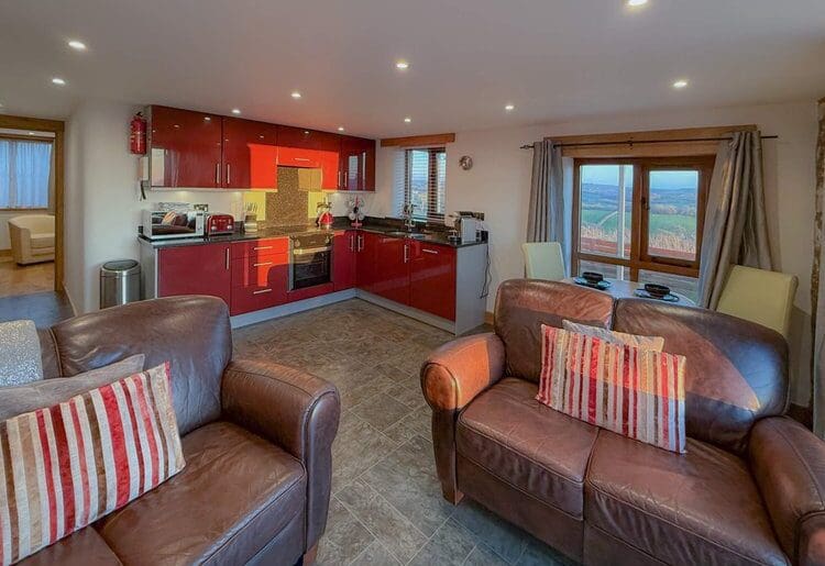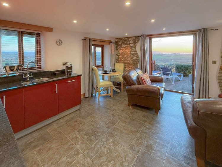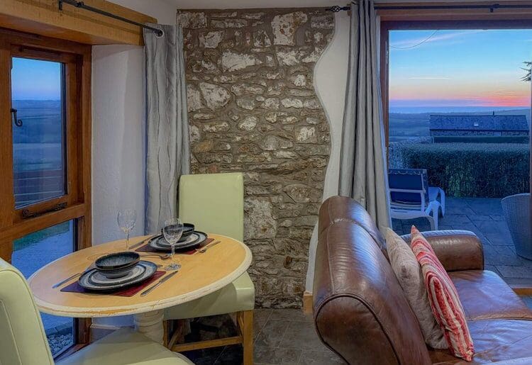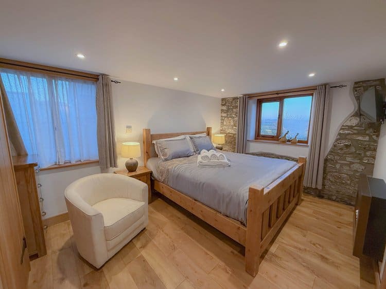 The open-plan living and dining space makes the most of its south- and west-facing position, showcasing sweeping countryside and sea views. Quality handmade chunky oak doors and underfloor heating add warmth and character, keeping the space cosy in cooler months.