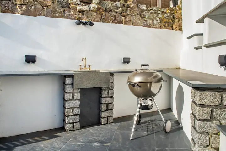 Bifold doors open onto a serene slate terrace overlooking a lush lawn, providing the perfect setting for outdoor relaxation and al fresco dining. The BBQ area, designed in an outdoor kitchen fashion with slate worktops, invites you to indulge in delicious grilled delights amidst the beauty of nature.