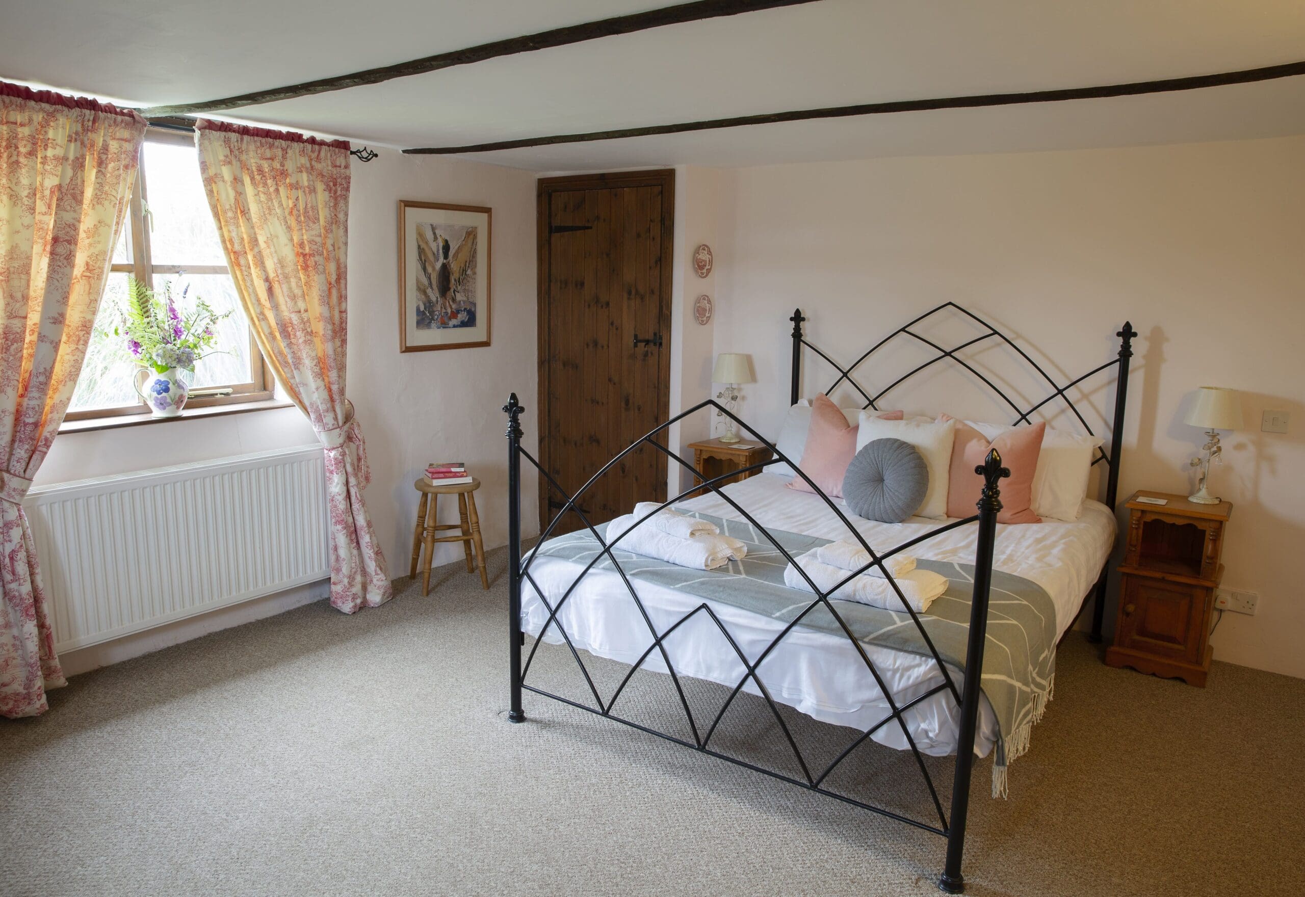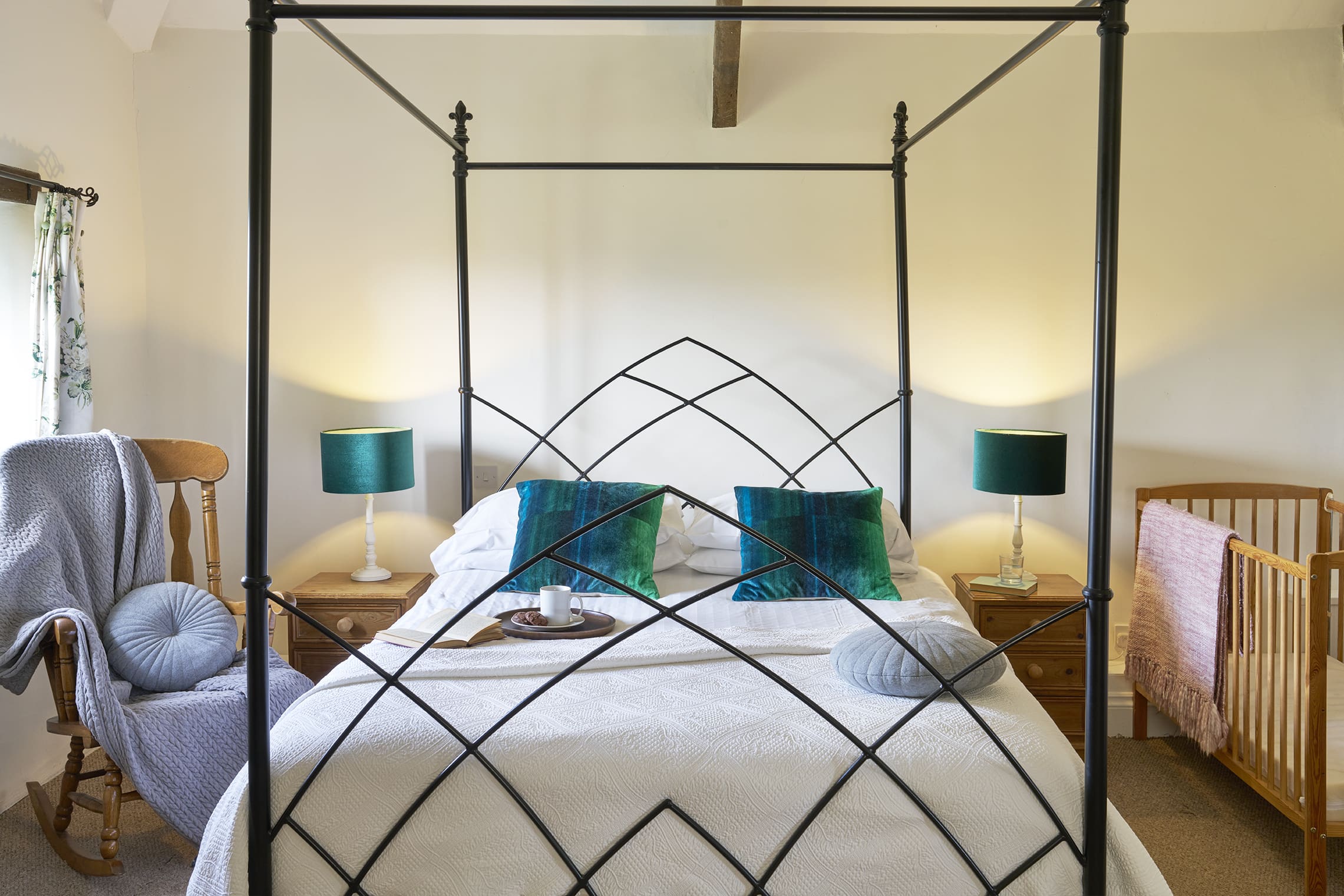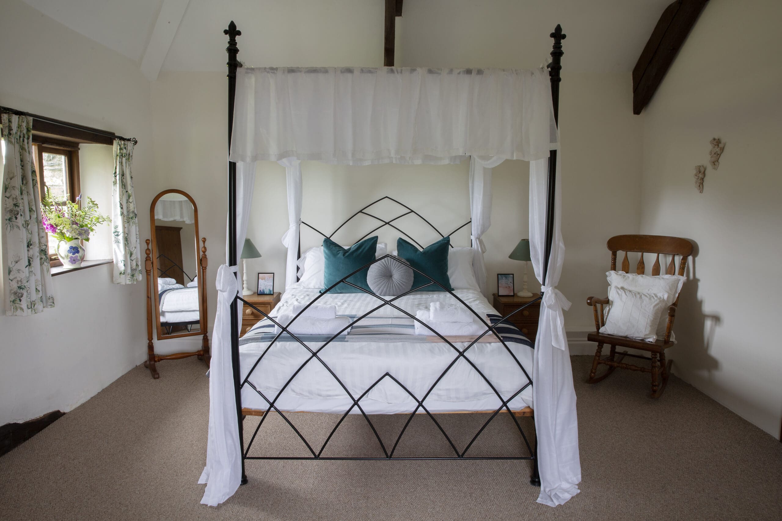 The expansive upstairs bedroom boasts a stunning wrought iron king-size four-poster bed. Two twin rooms are accessible from the main hallway.