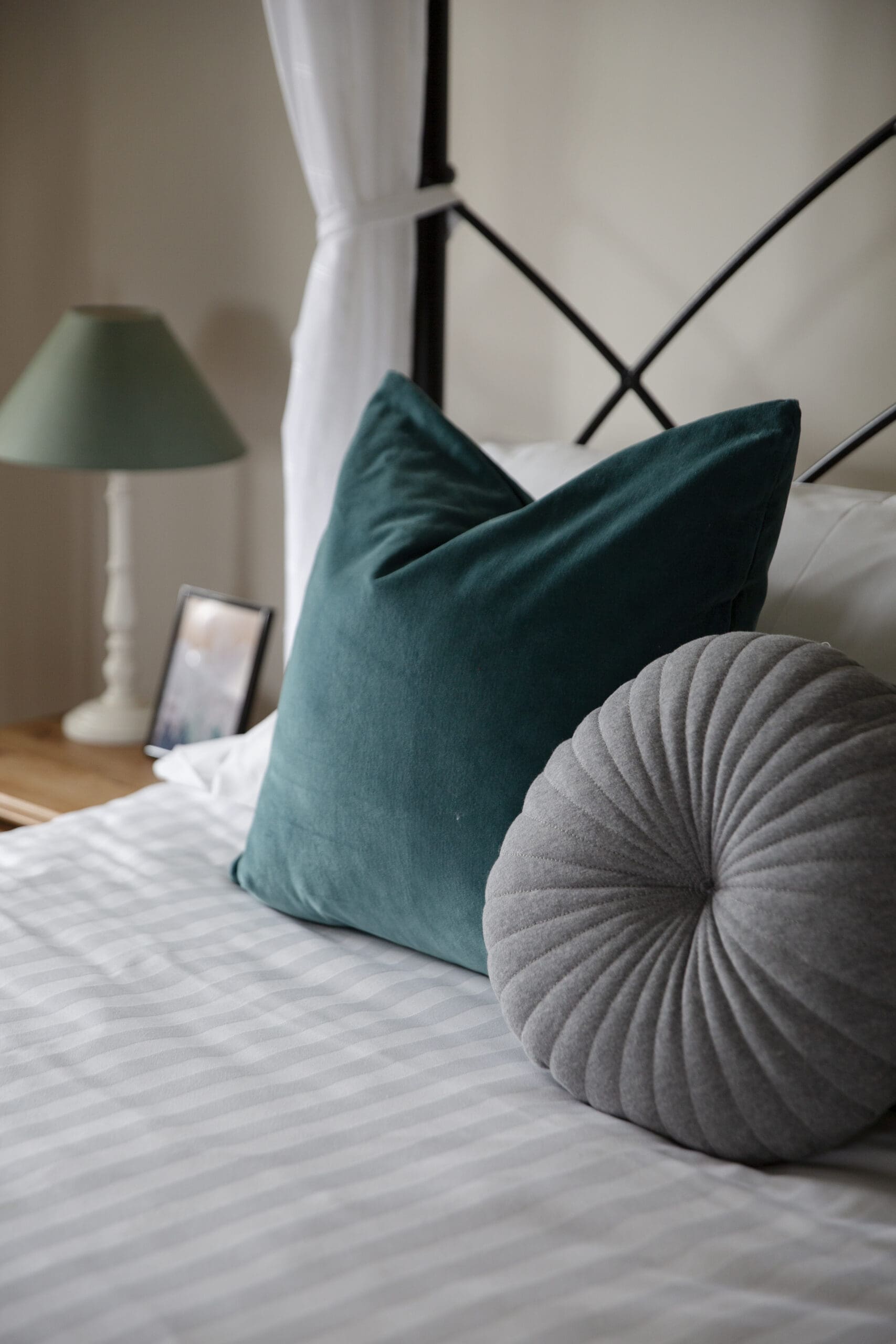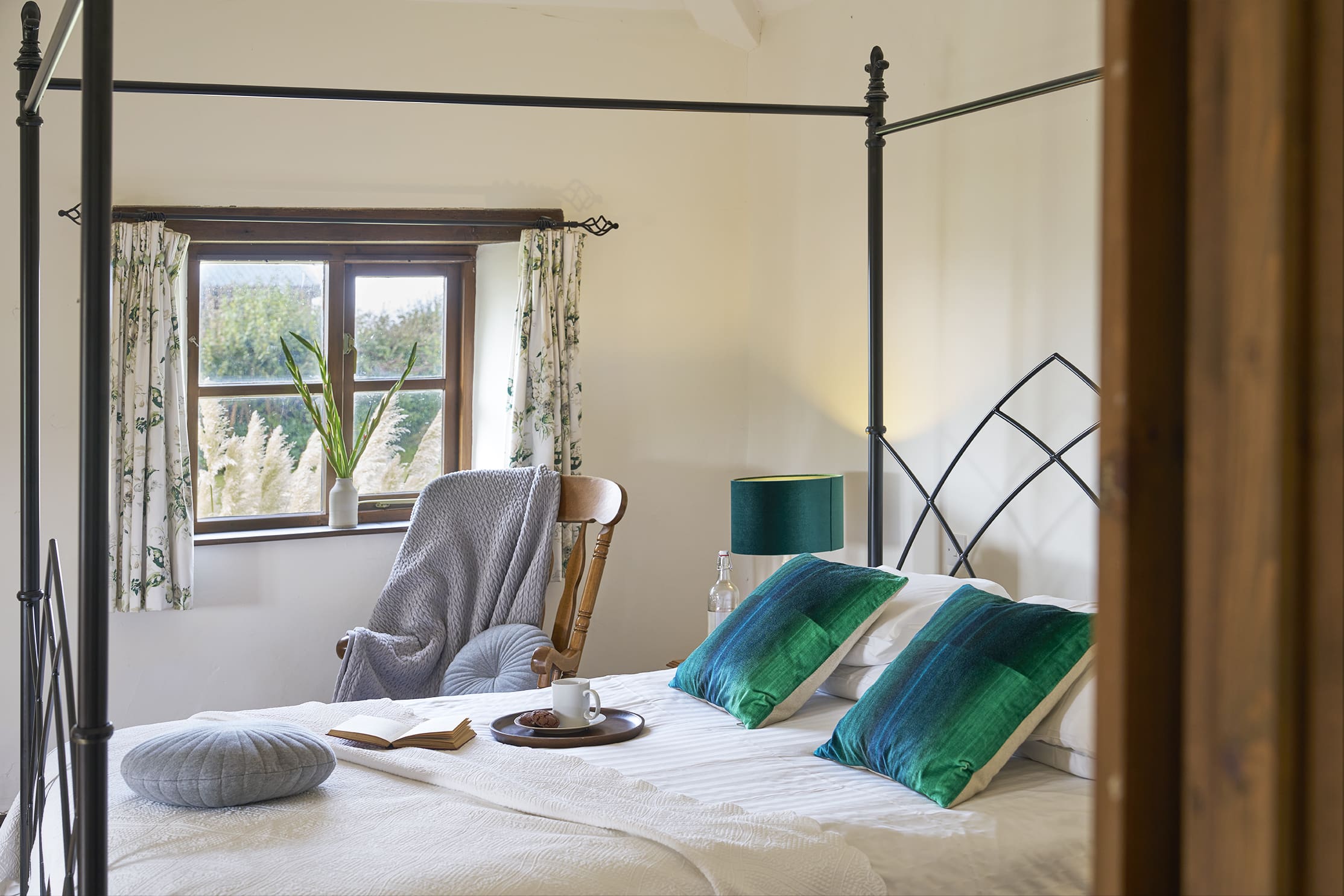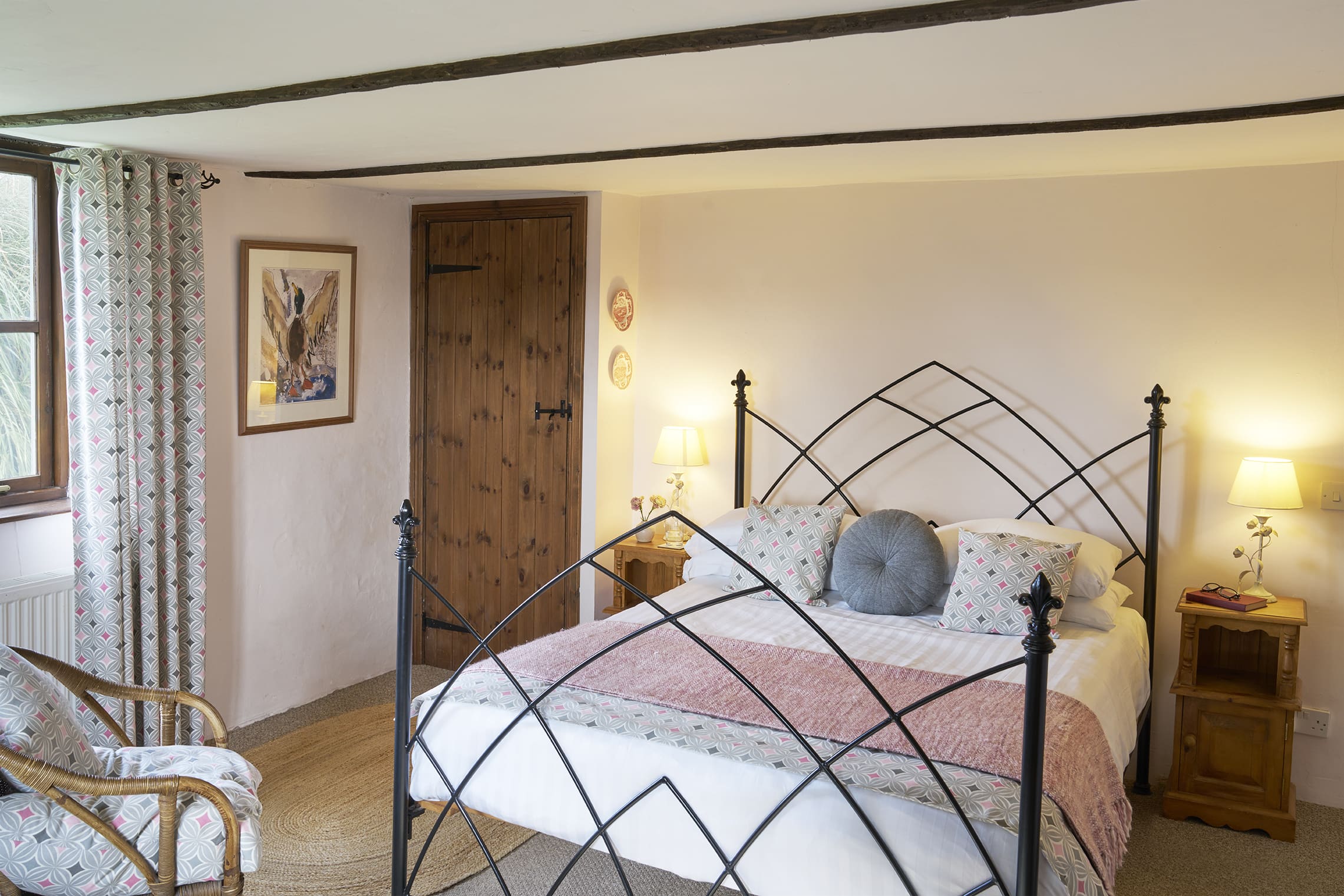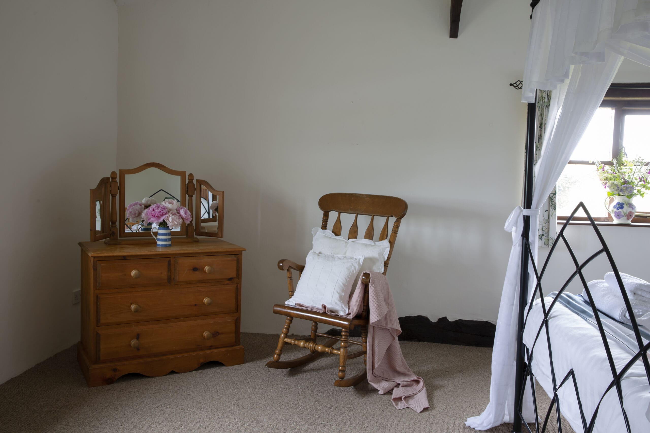 The expansive upstairs bedroom boasts a stunning wrought iron king-size four-poster bed. Two twin rooms are accessible from the main hallway.