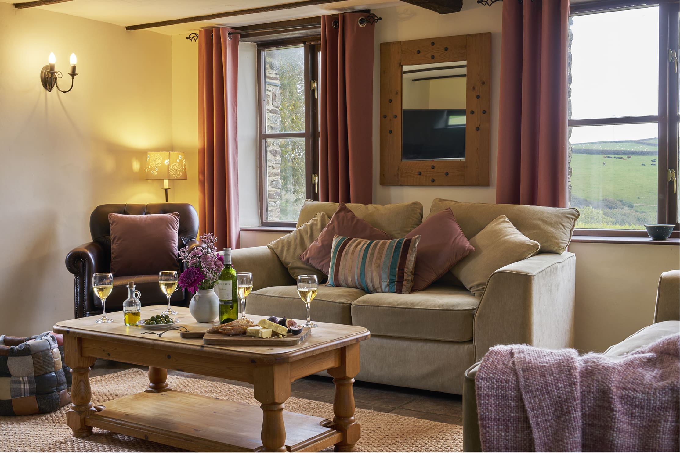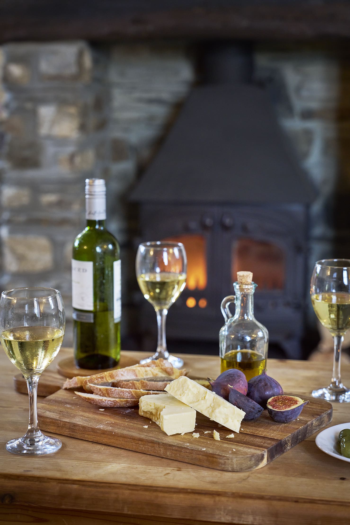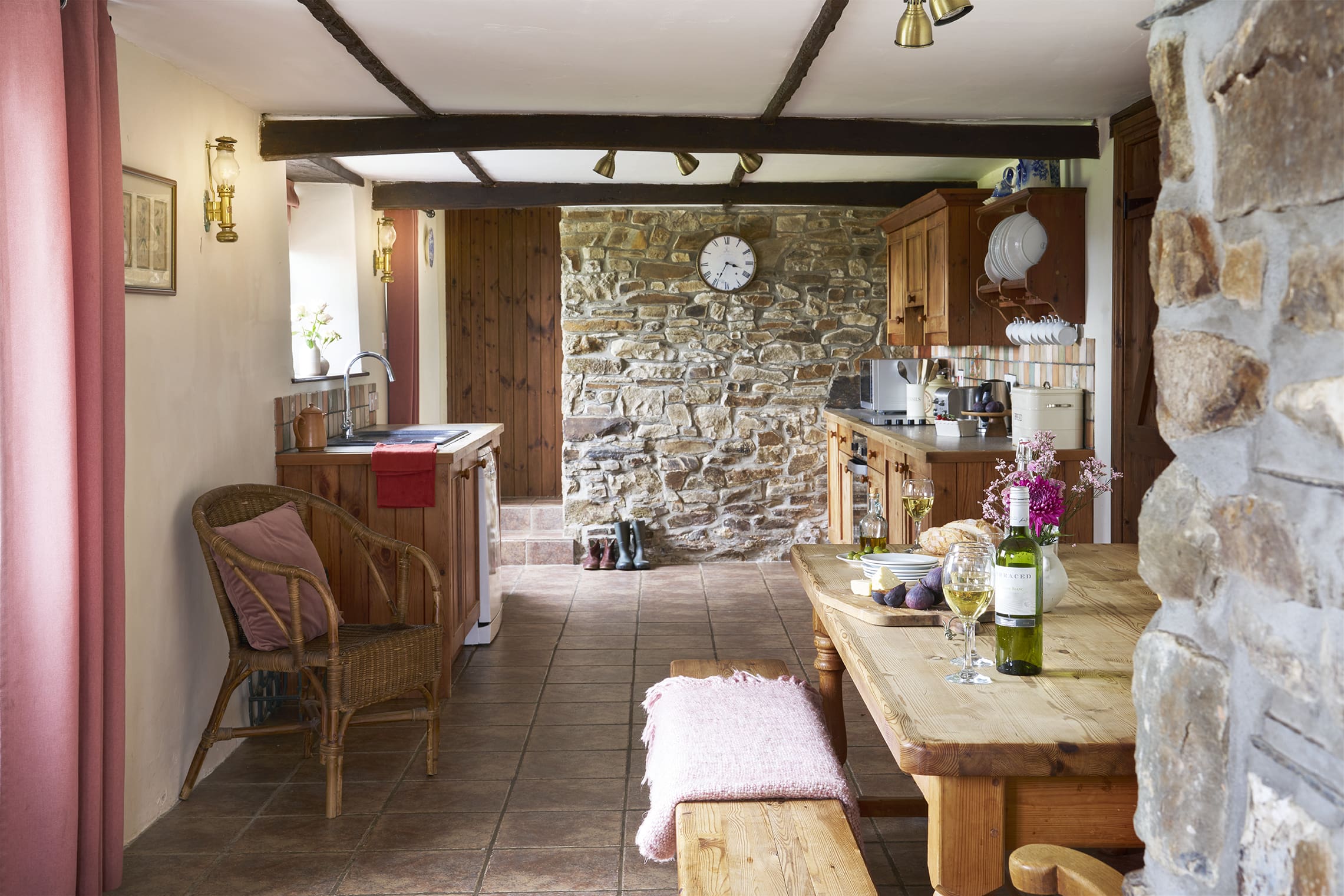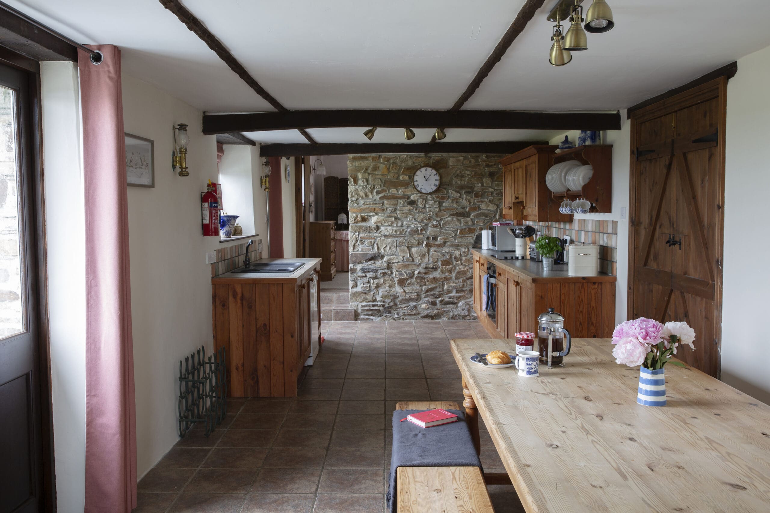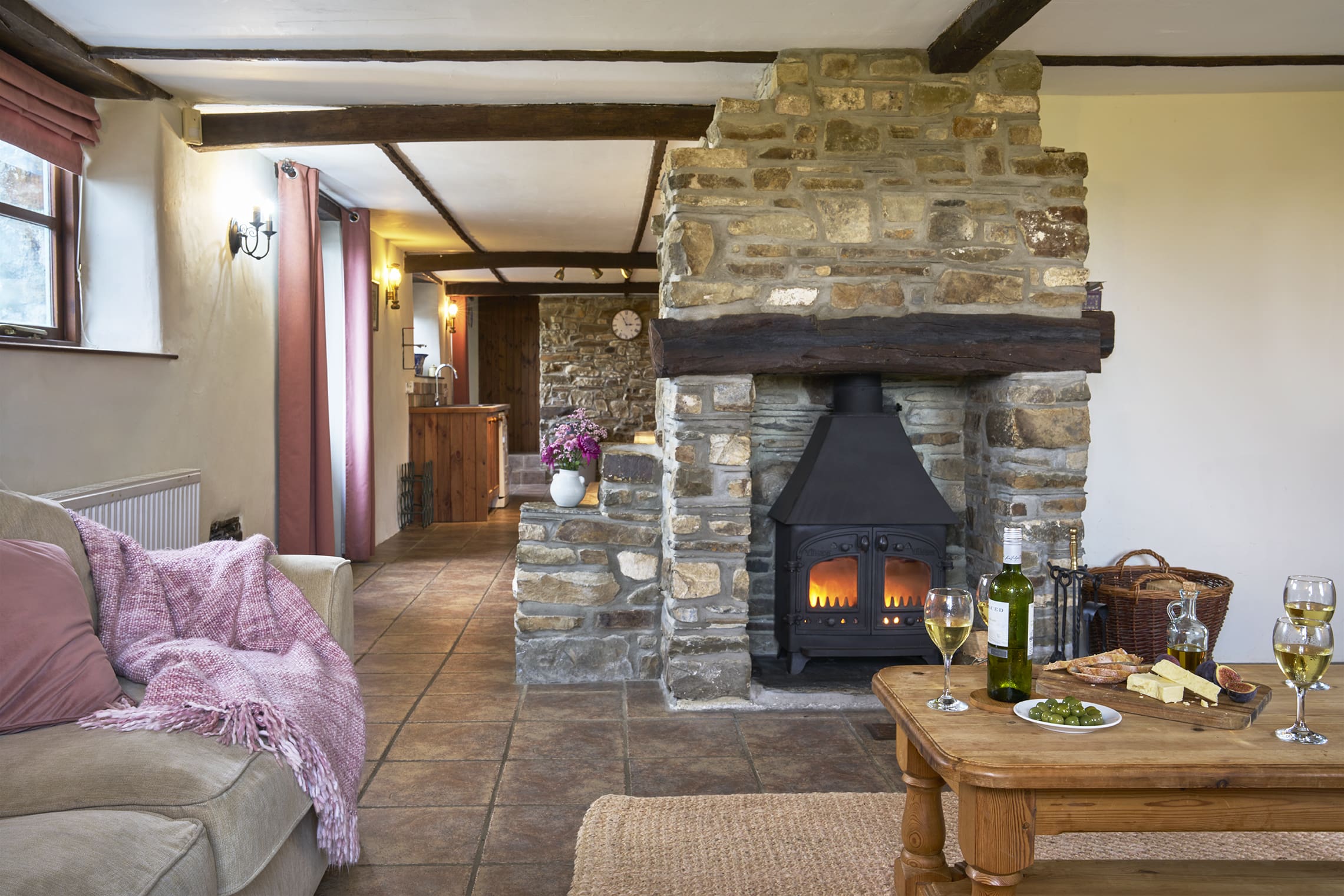 • Open plan living-room with large kitchen, 10 seat farm-house dining table, comfortable lounge around a stone fireplace with wood burner.