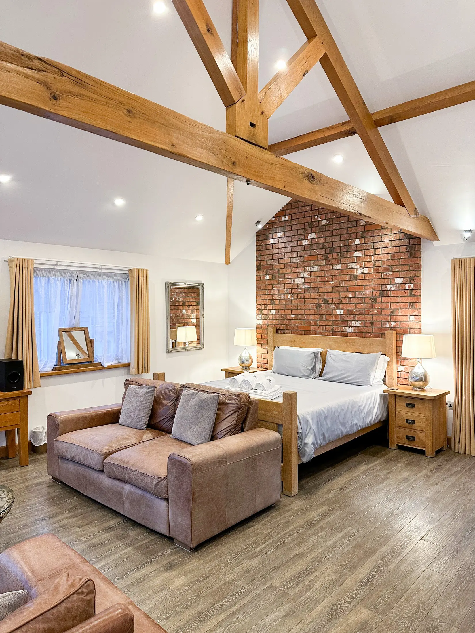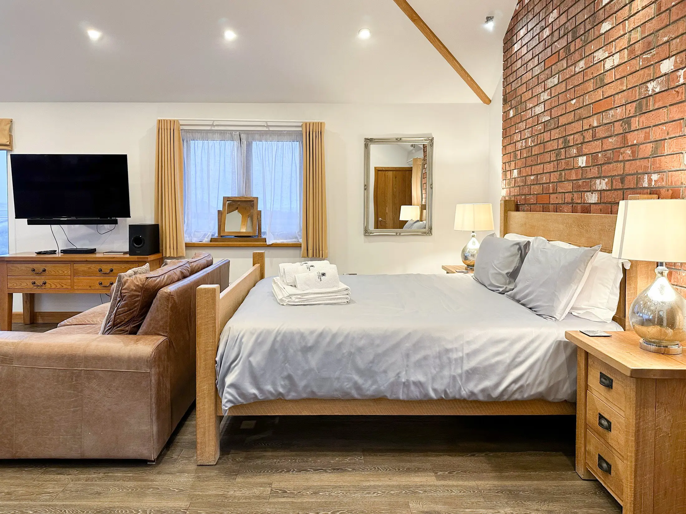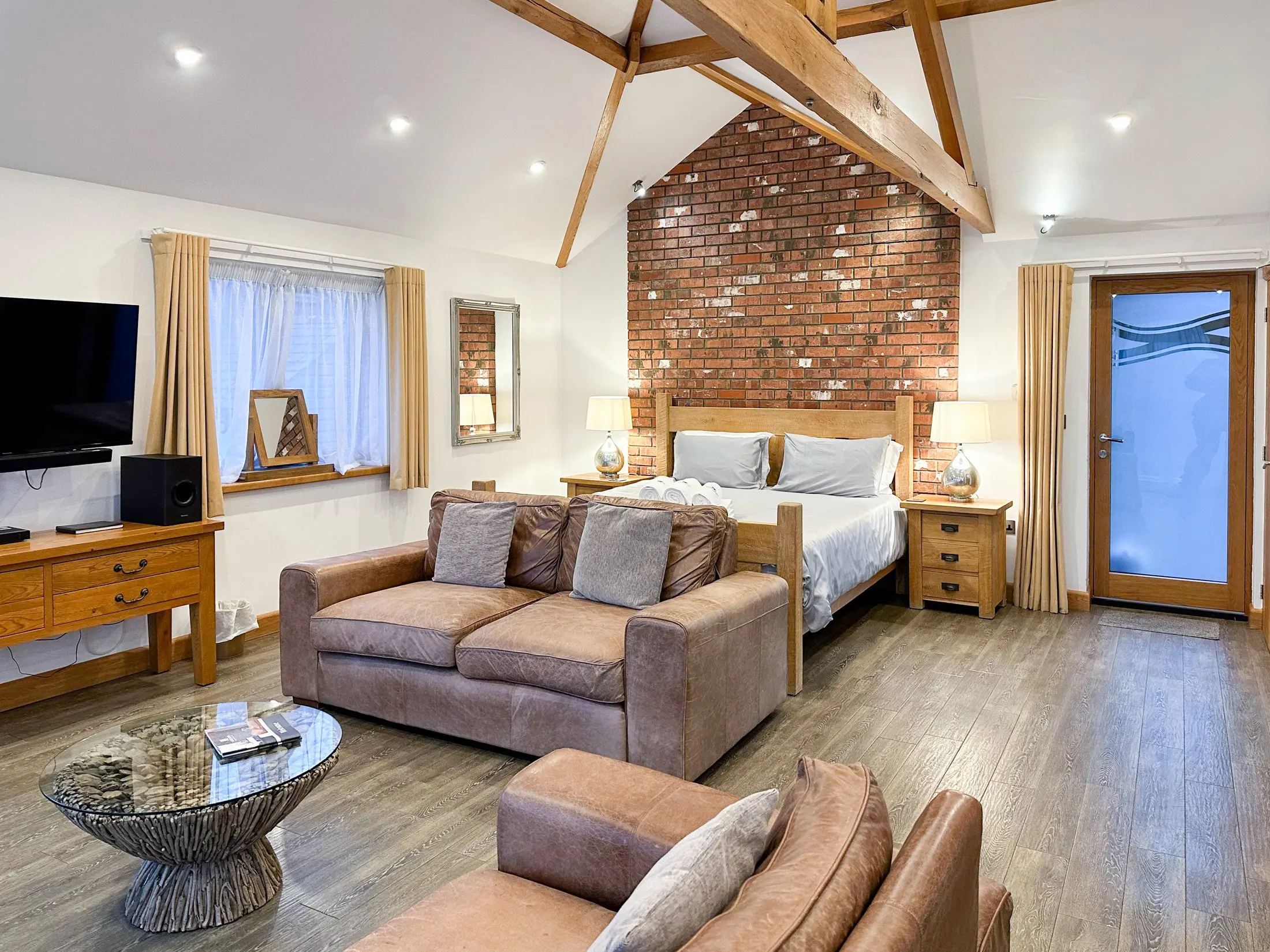 Chunky oak beams and solid oak doors bring traditional charm to the apartment’s contemporary design, complemented by underfloor heating for year-round cosiness. Expansive bi-fold doors open onto the patio, framing uninterrupted countryside views.