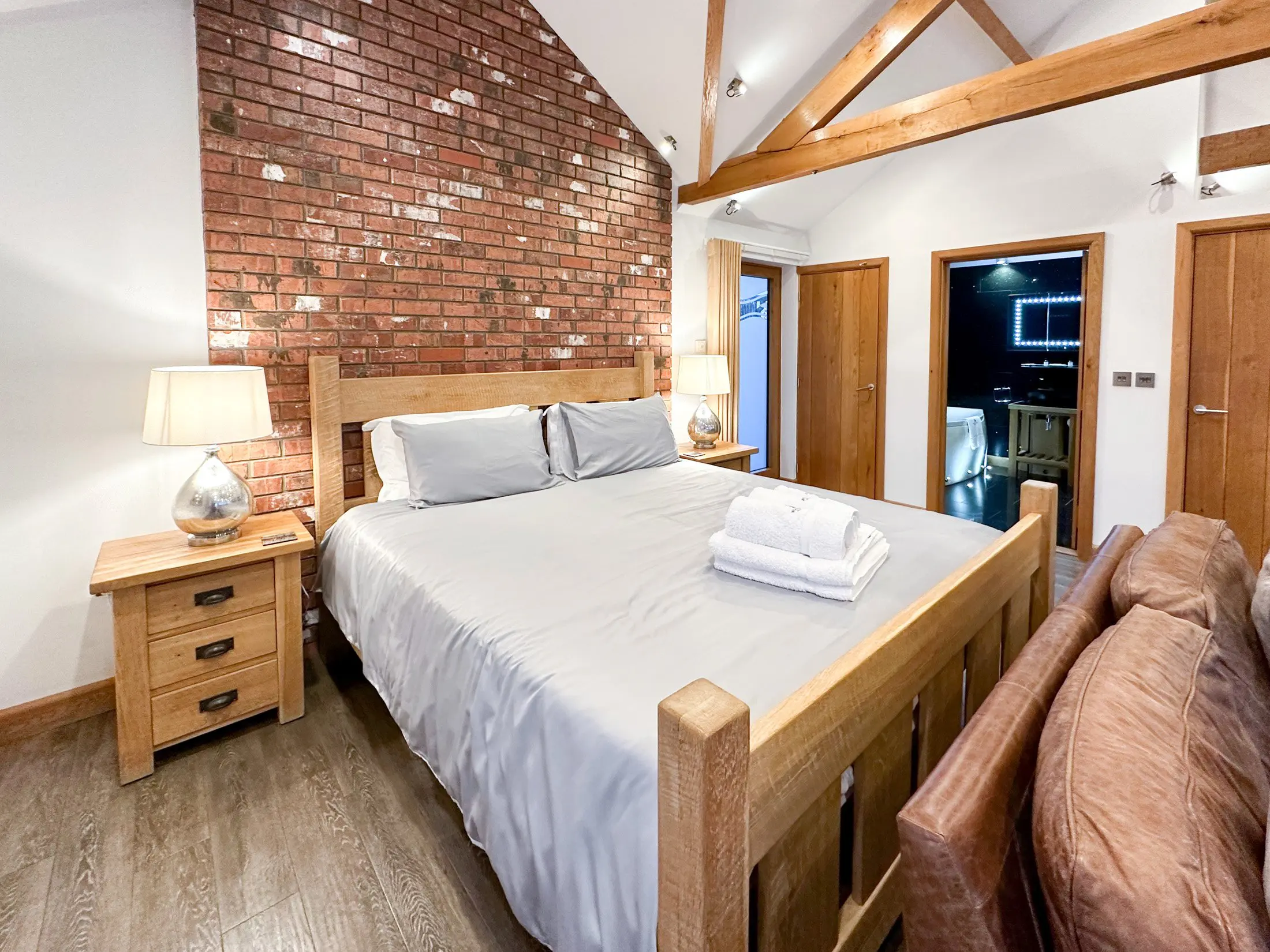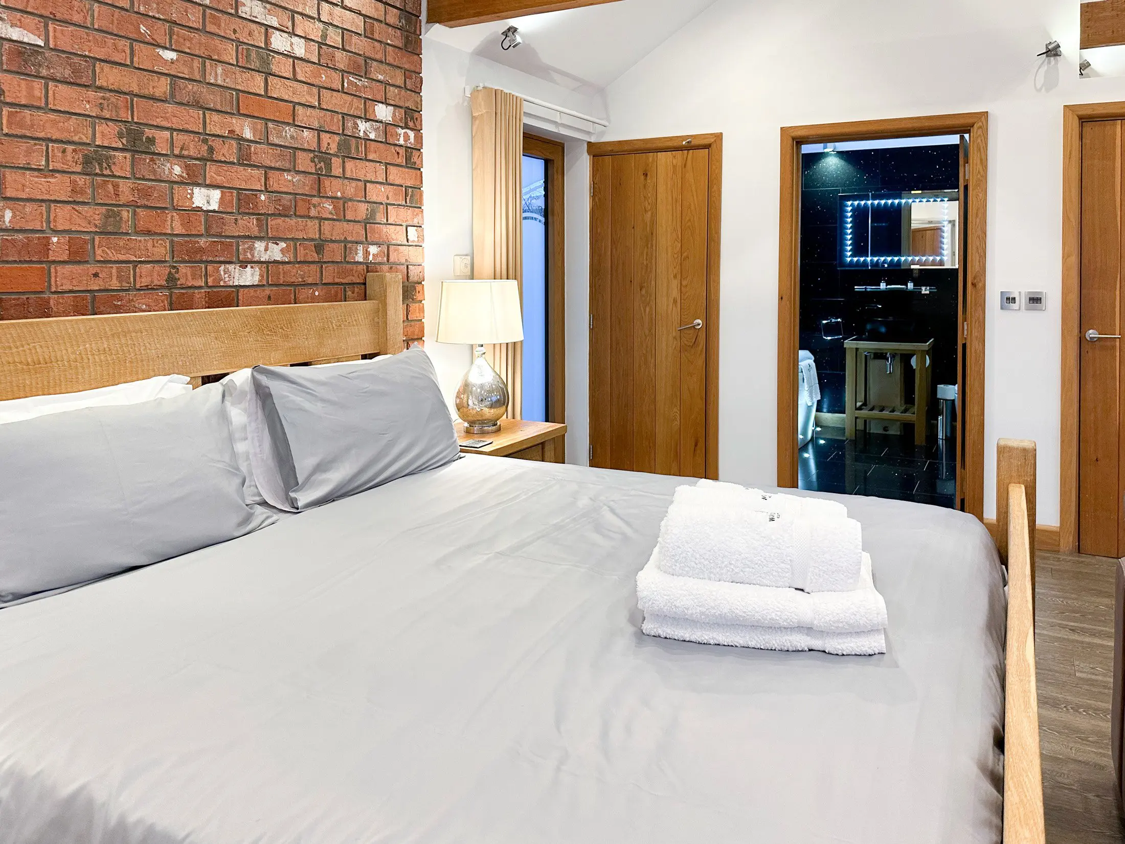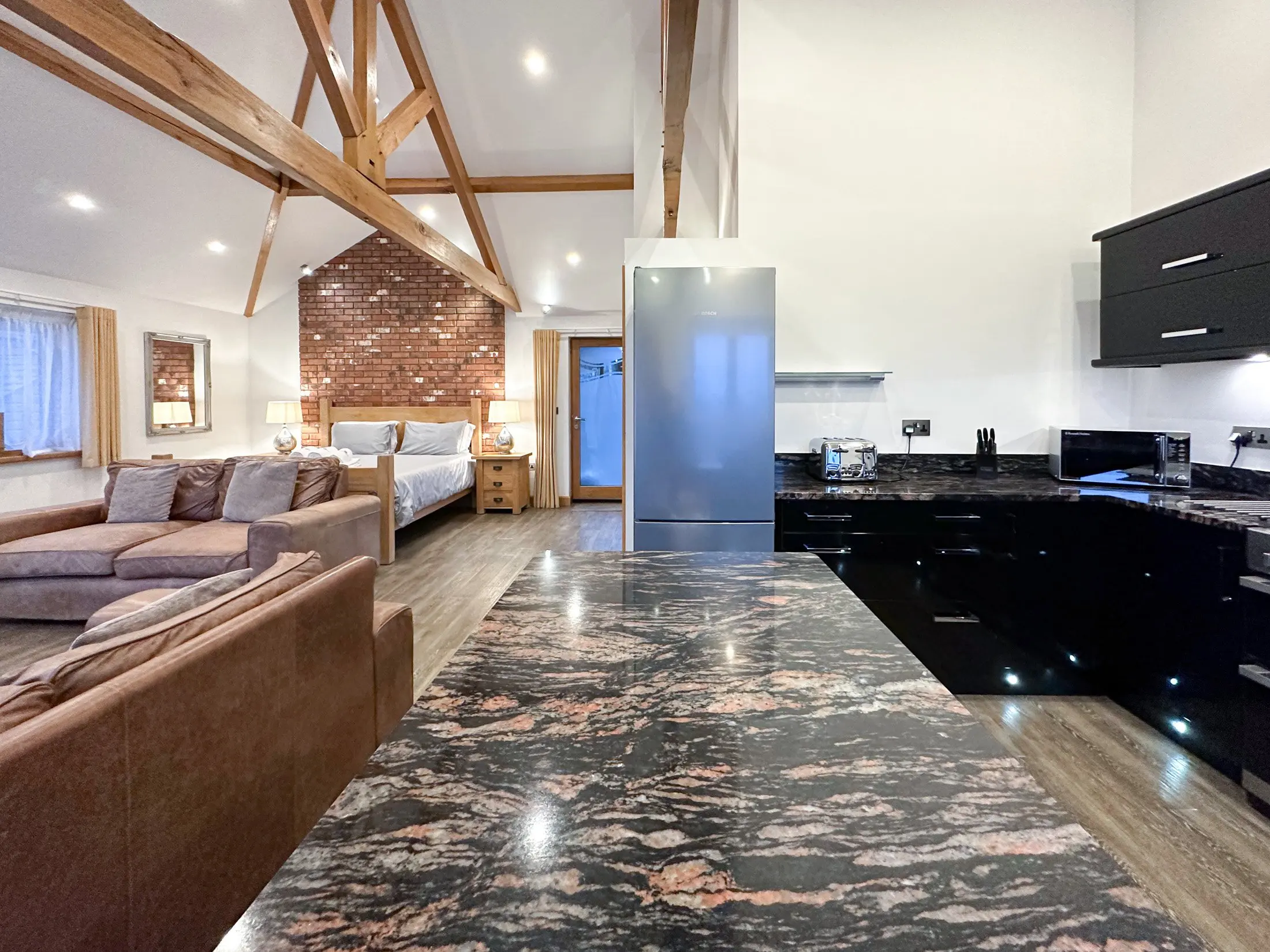 Chunky oak beams and solid oak doors bring traditional charm to the apartment’s contemporary design, complemented by underfloor heating for year-round cosiness. Expansive bi-fold doors open onto the patio, framing uninterrupted countryside views.