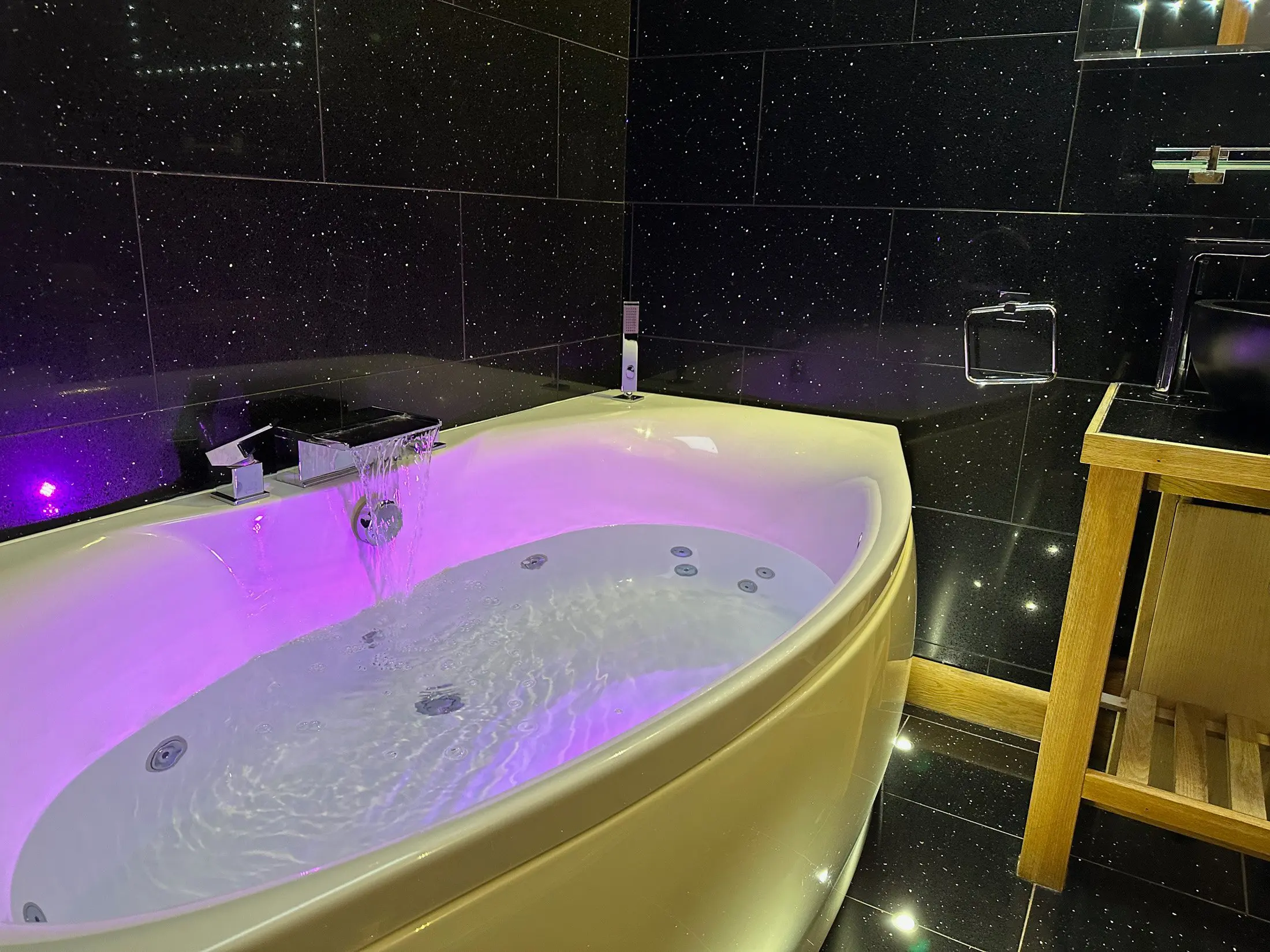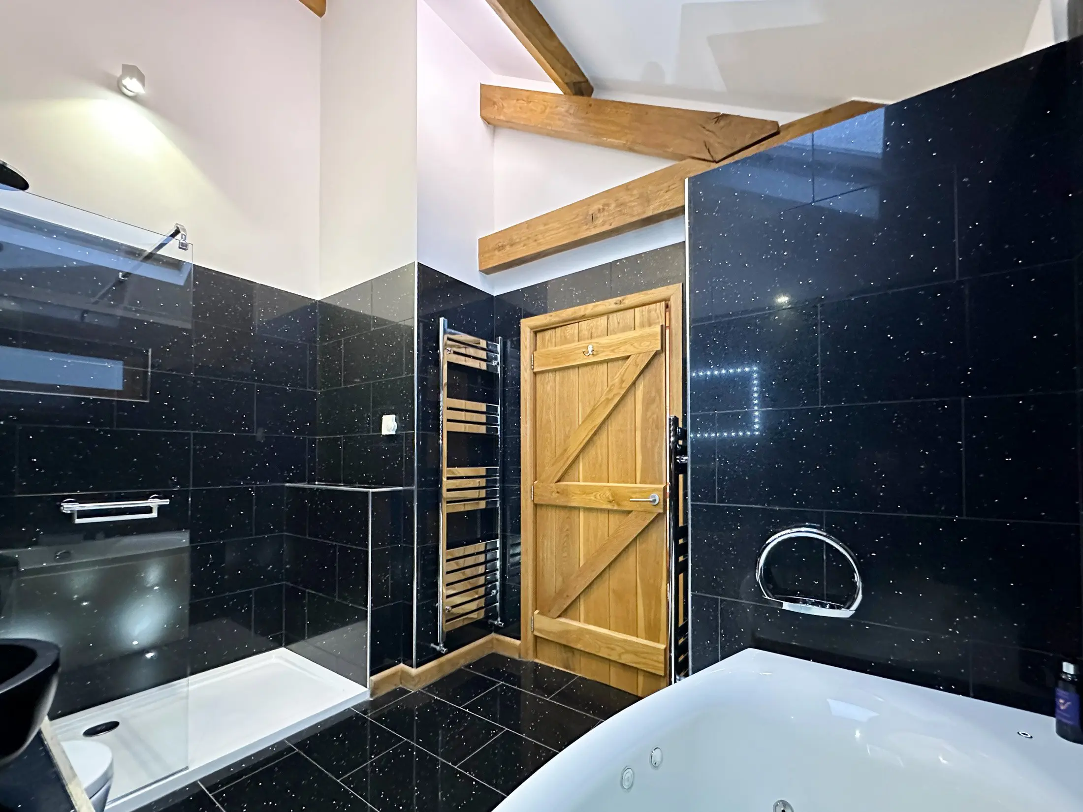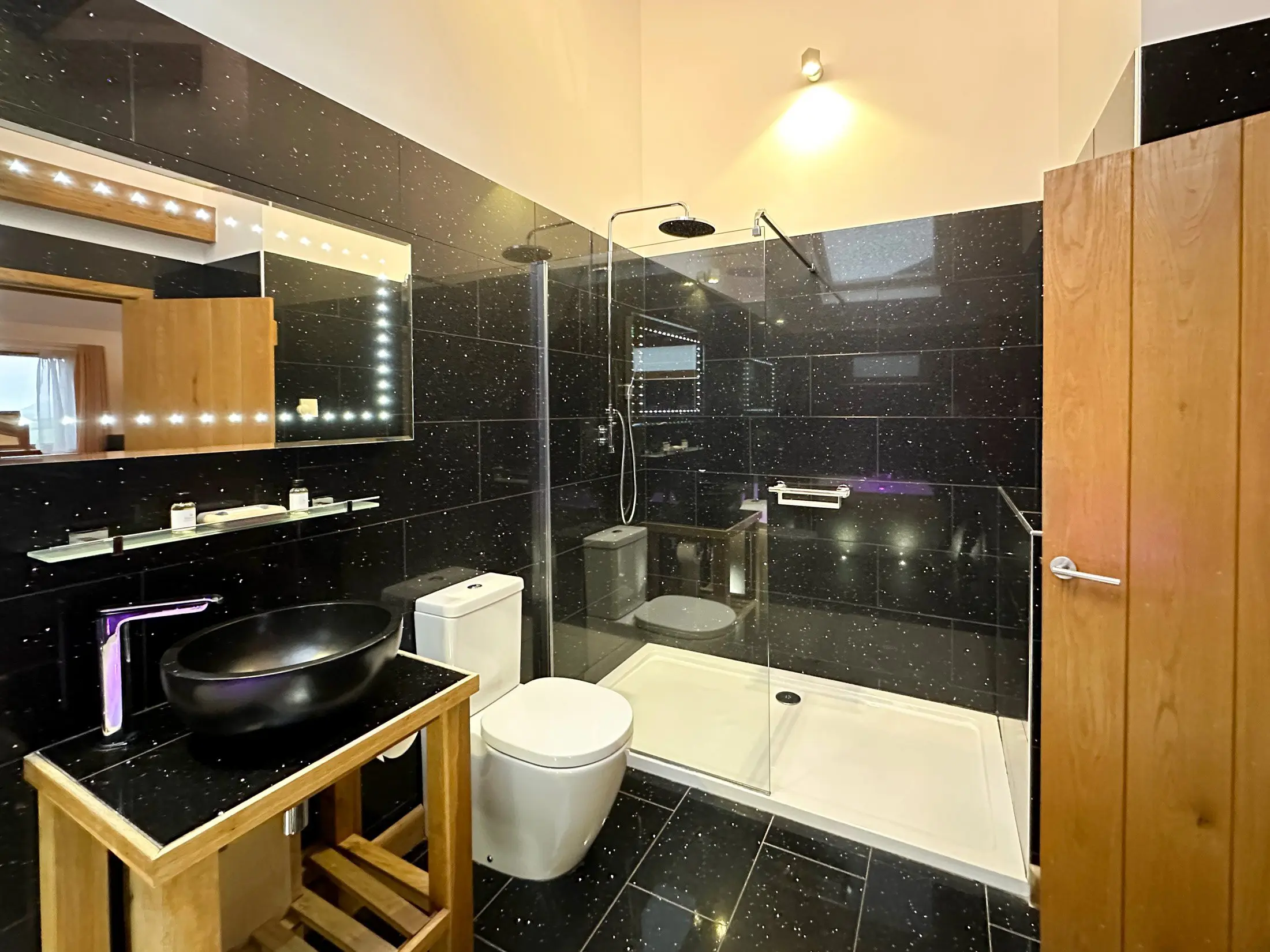 The en-suite bathroom is designed for indulgence, with bold black sparkling tiles, a spa bath for long soaks, and a spacious walk-in rainfall shower. Locally made toiletries and bath foam are provided for a special finishing touch.