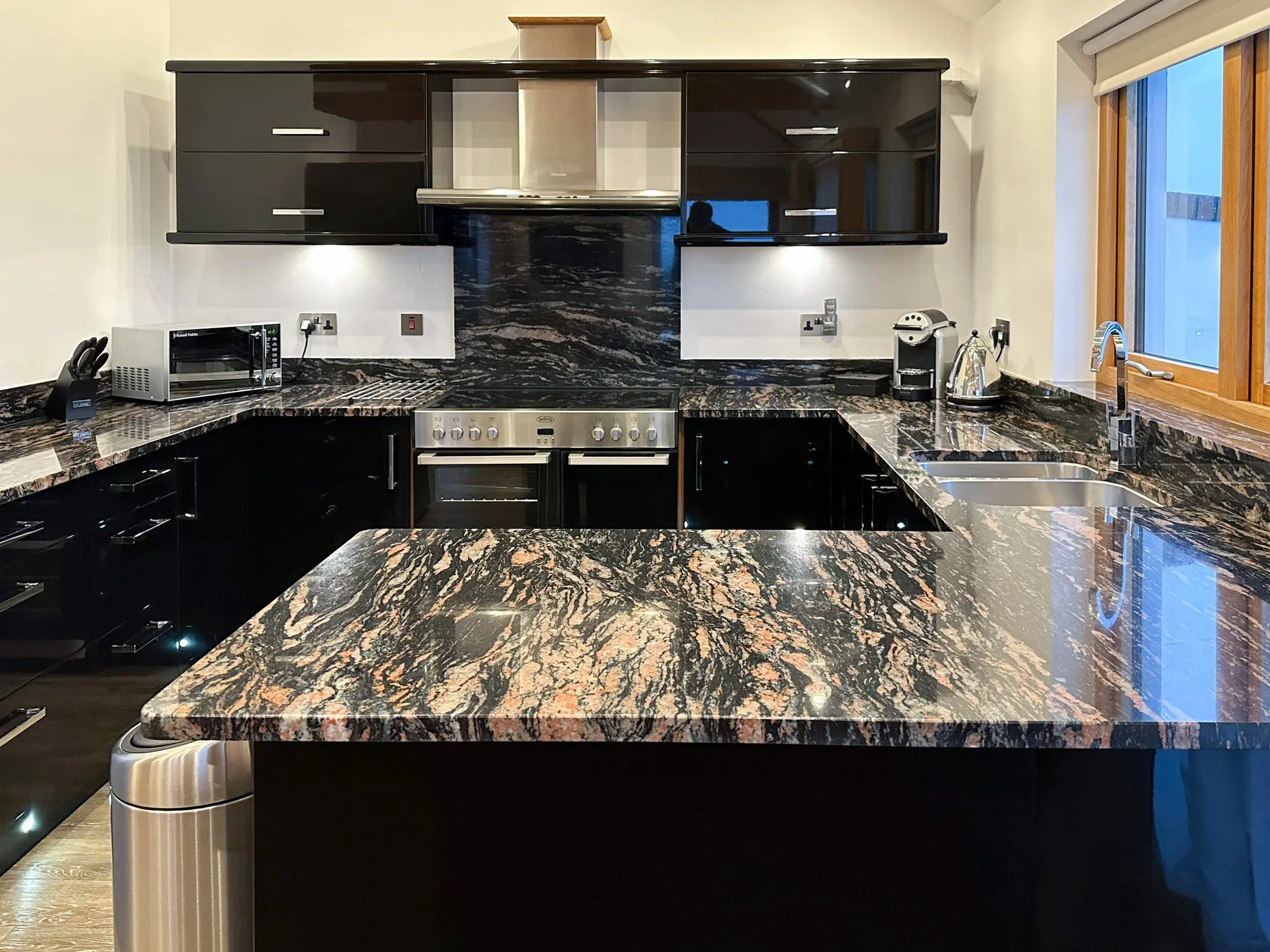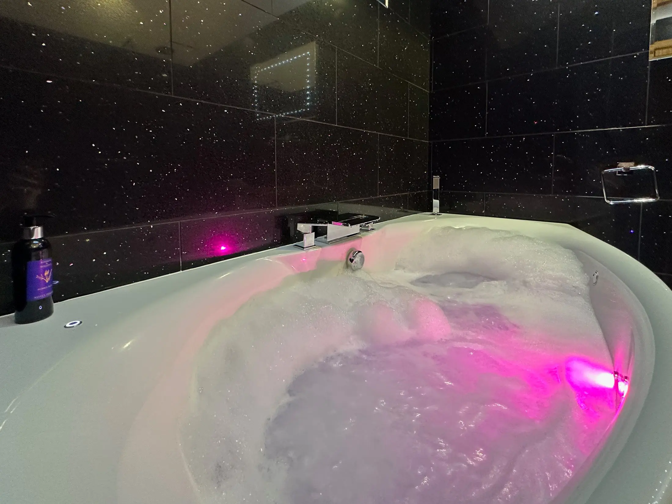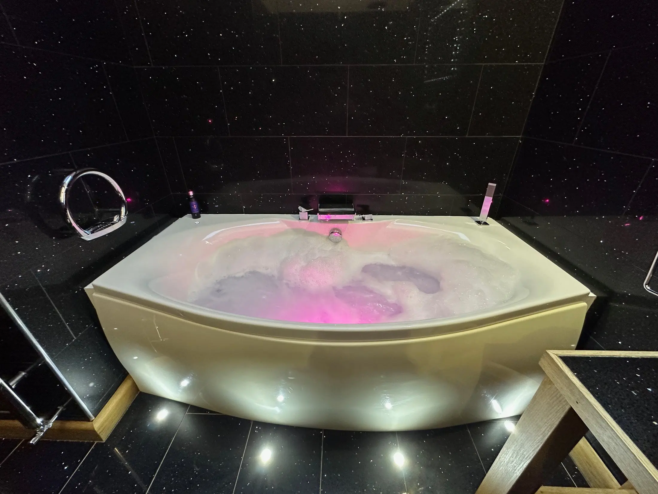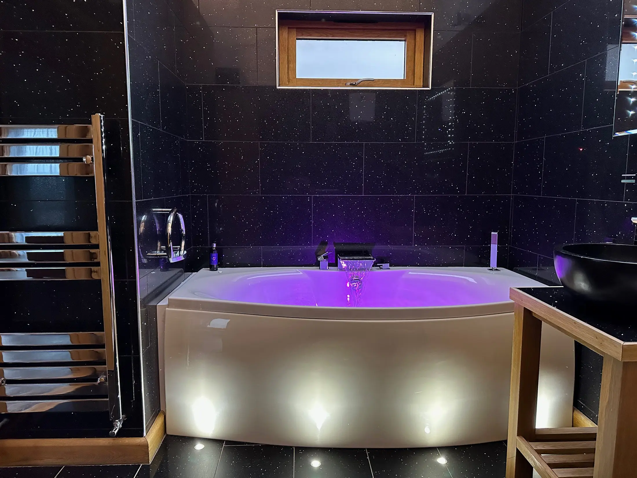 The en-suite bathroom is designed for indulgence, with bold black sparkling tiles, a spa bath for long soaks, and a spacious walk-in rainfall shower. Locally made toiletries and bath foam are provided for a special finishing touch.