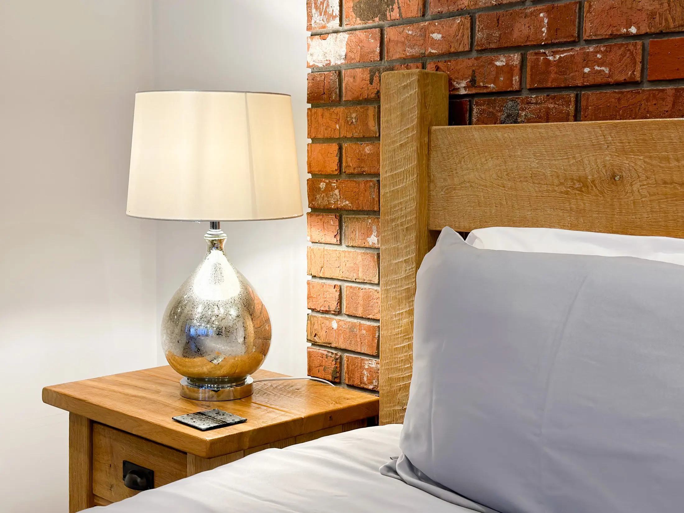 The centrepiece of this open-plan apartment is a super-king bed, hand-finished with beeswax to highlight the distinct wartime ripsaw marks in the Baltic Coast timber from which it was crafted. Paired with a memory foam mattress, it offers both heritage character and modern comfort.