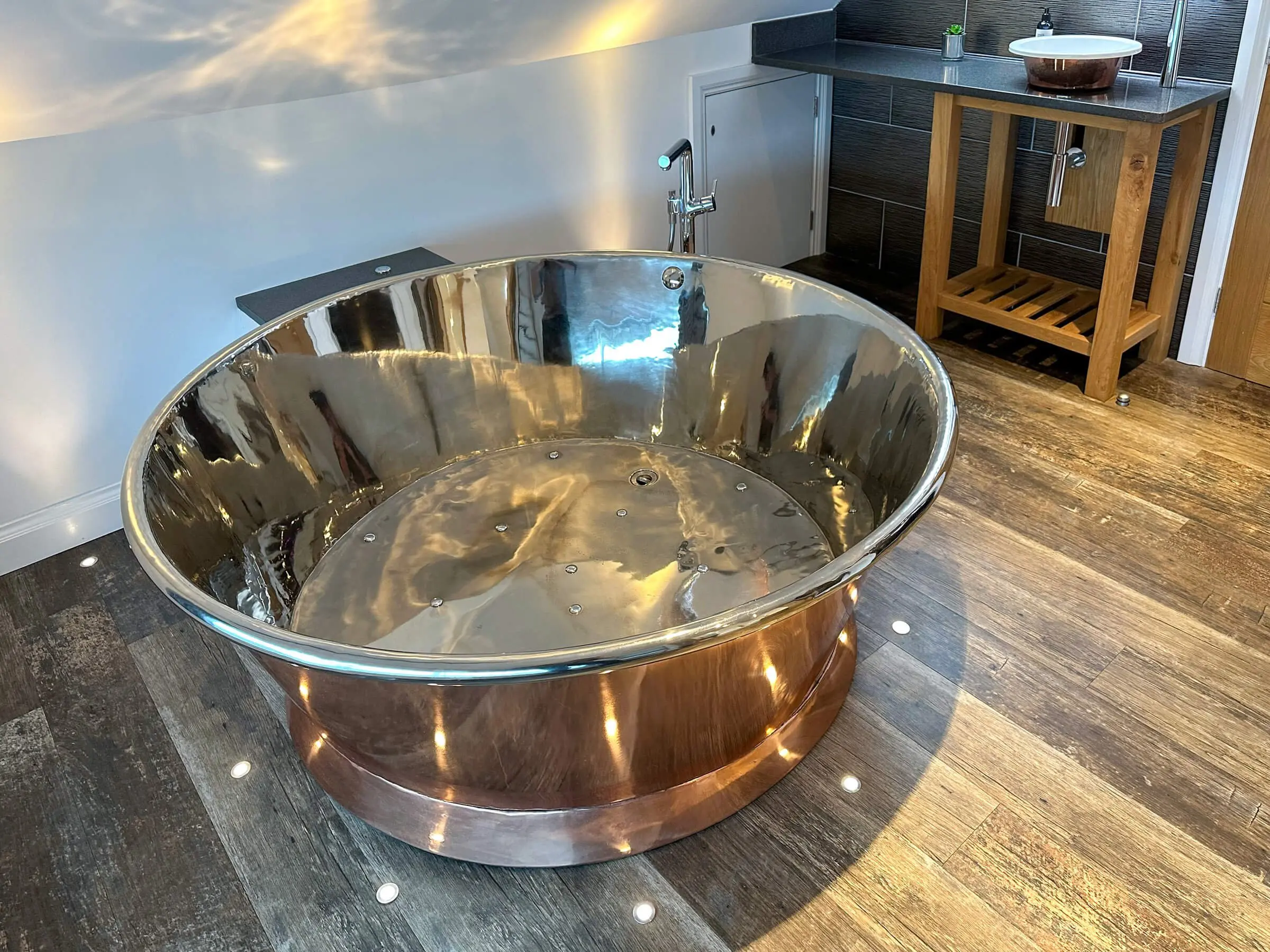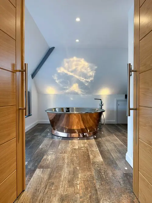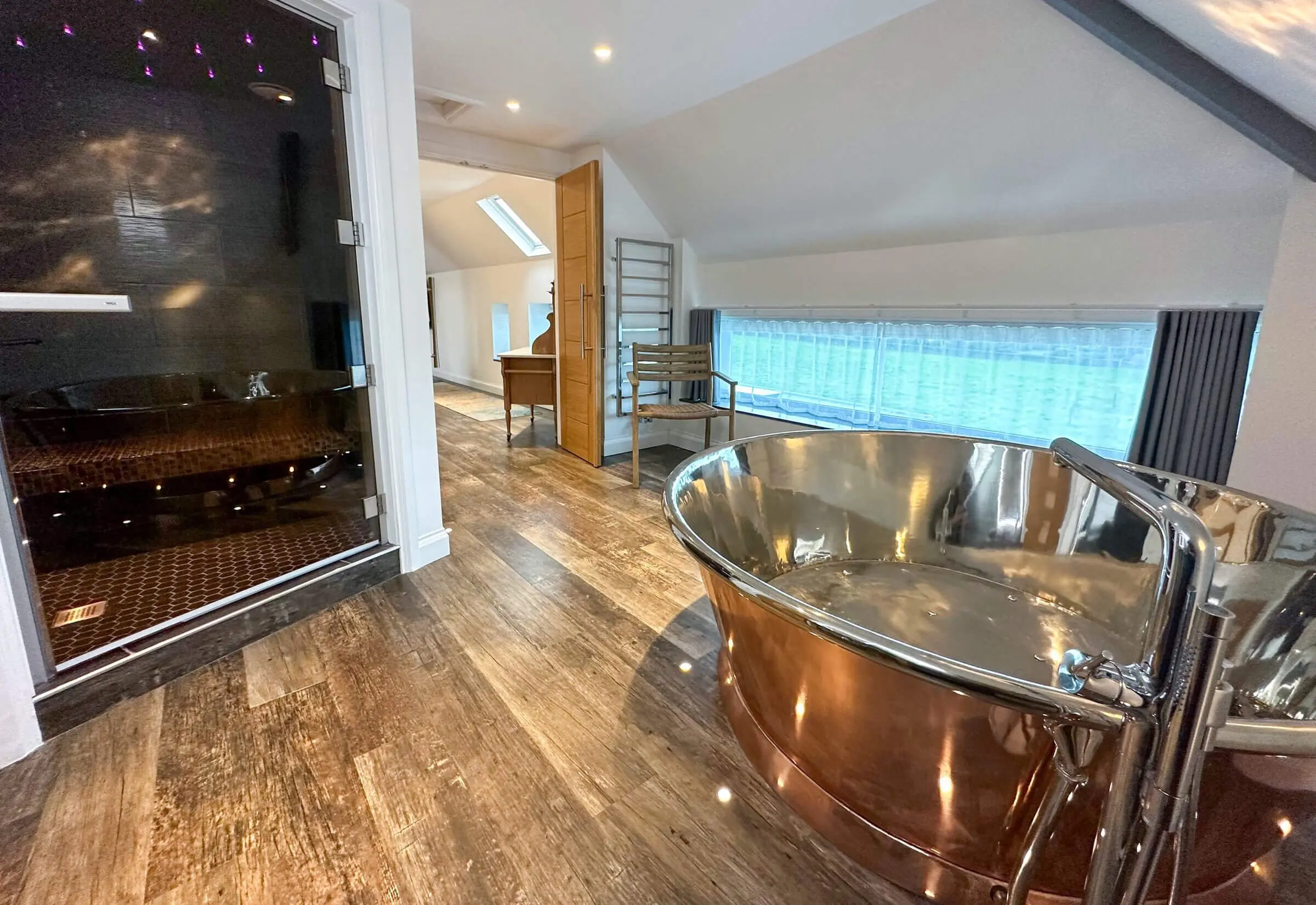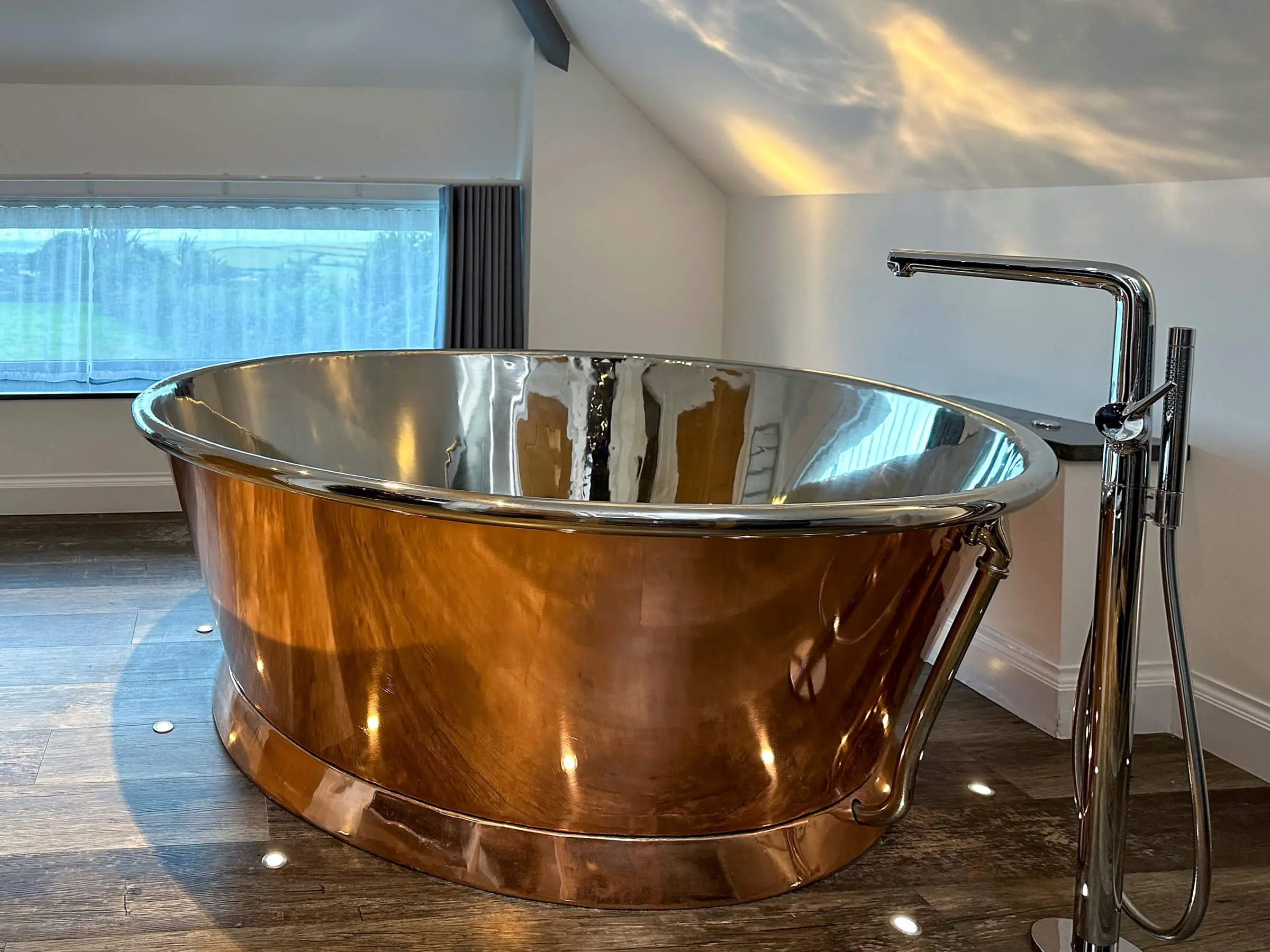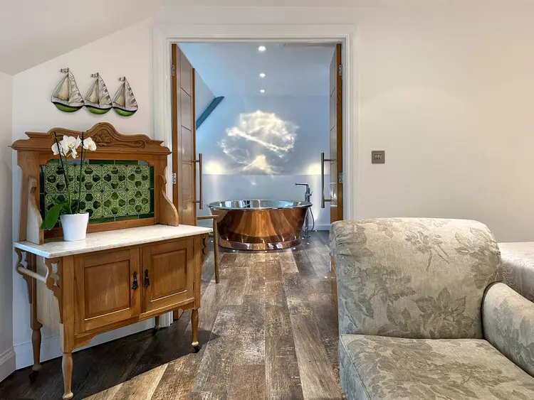 Taking centre stage, the free-standing copper air-spa bath glimmers with a nickel interior and has been meticulously hand-finished by master craftsmen at the world’s leading copper bath specialists. Perfect for sharing, it offers spectacular sunset views through the wide fixed-pane window, looking out towards the sea at Widemouth Bay.