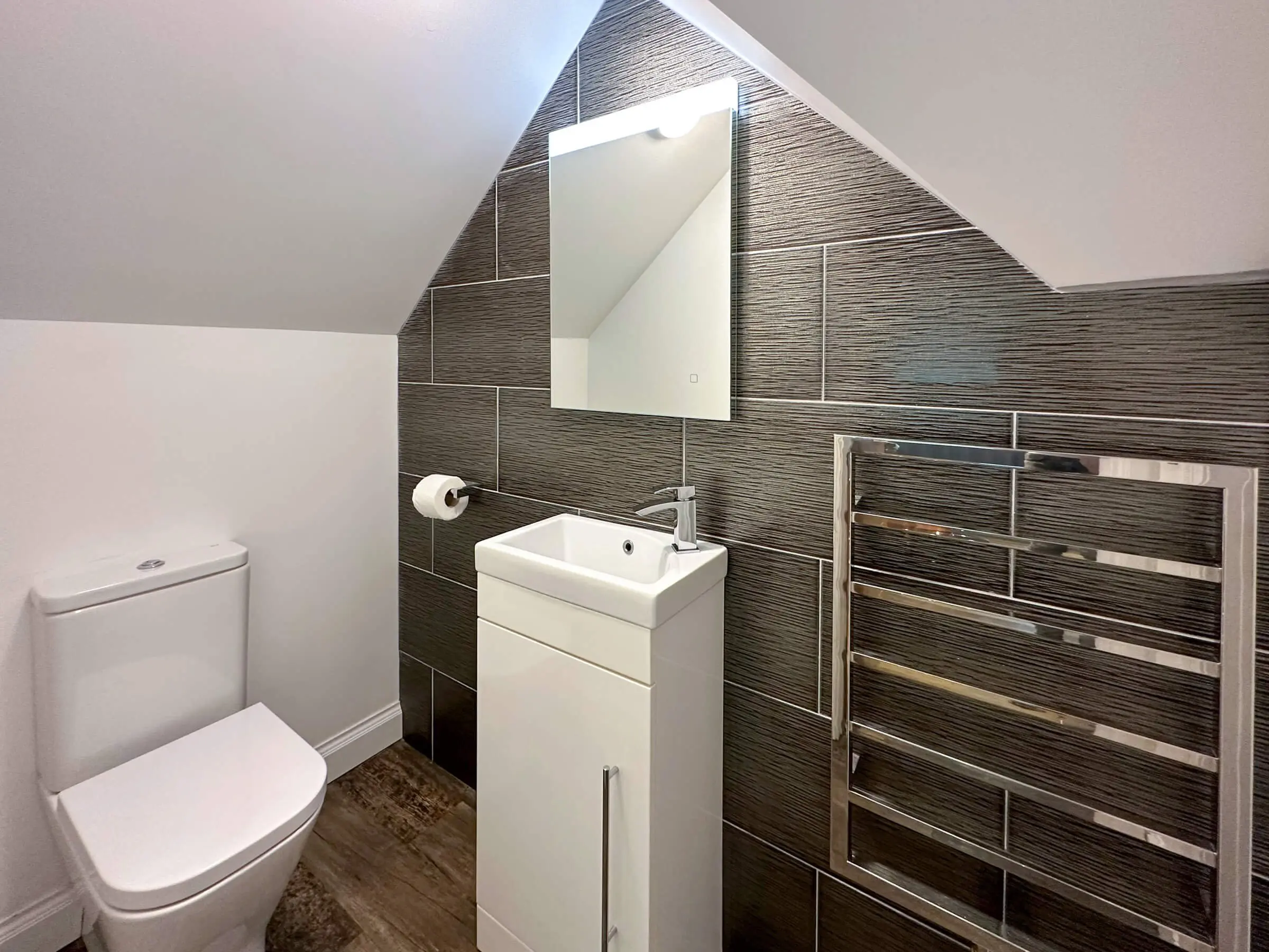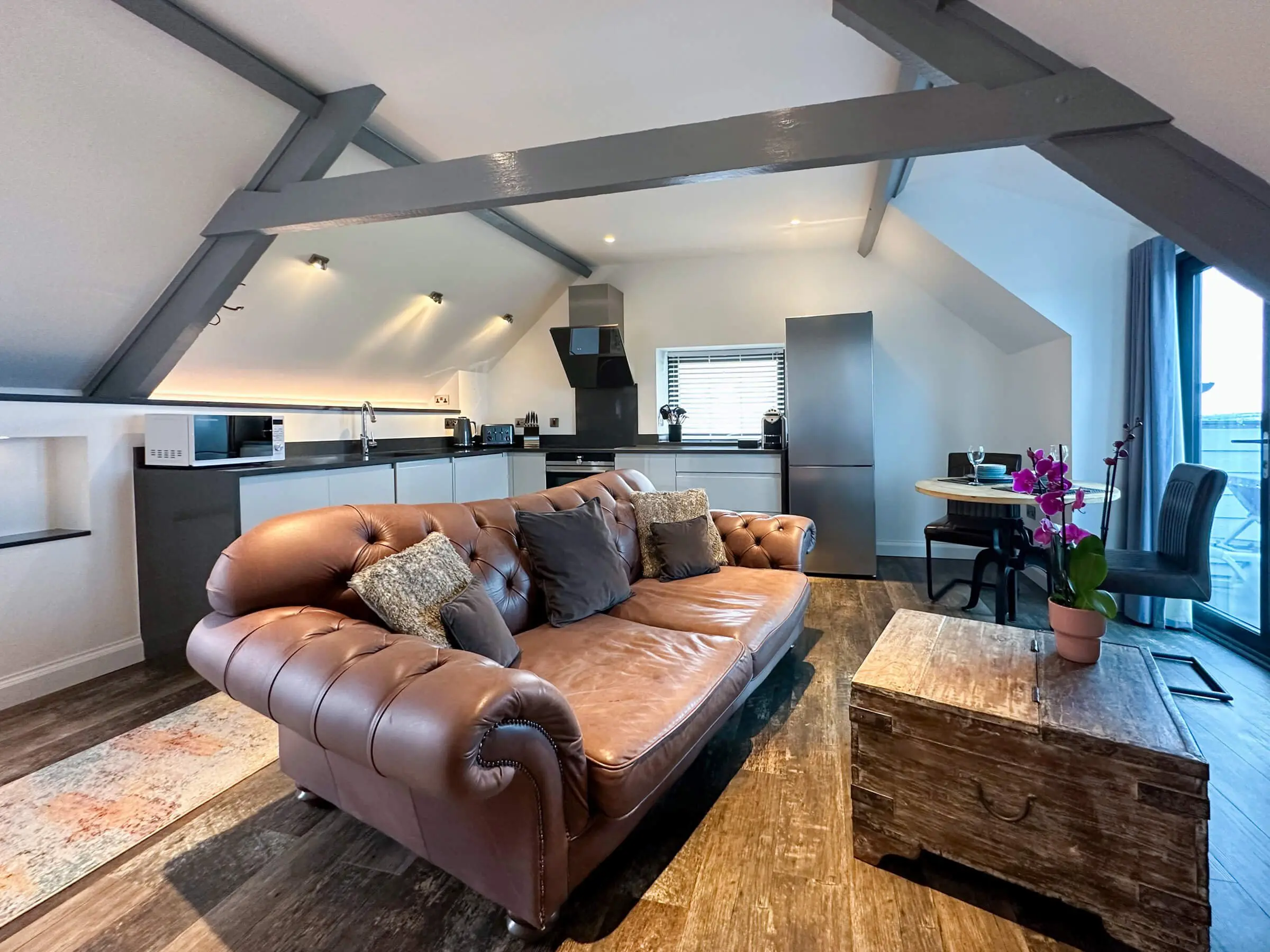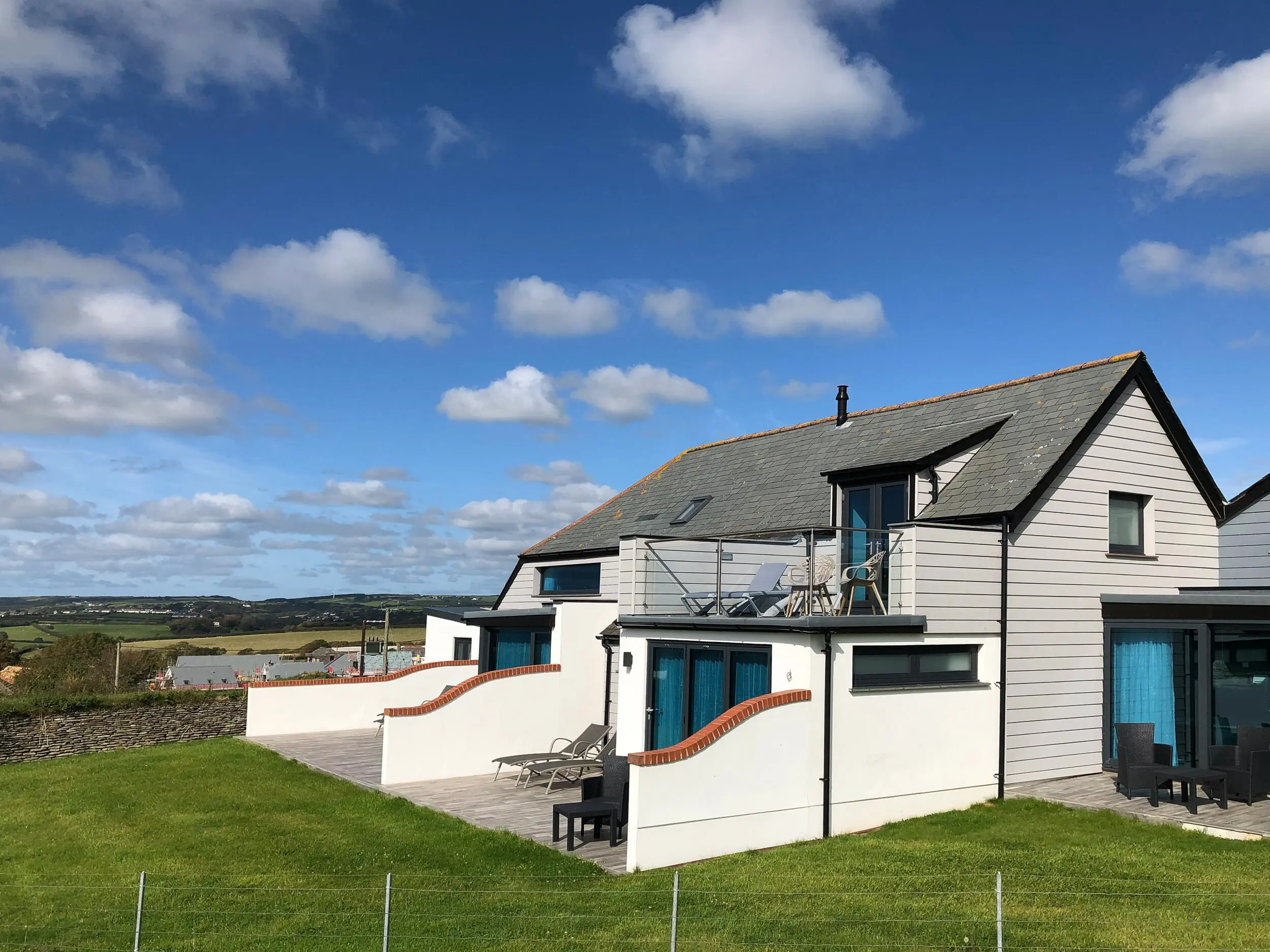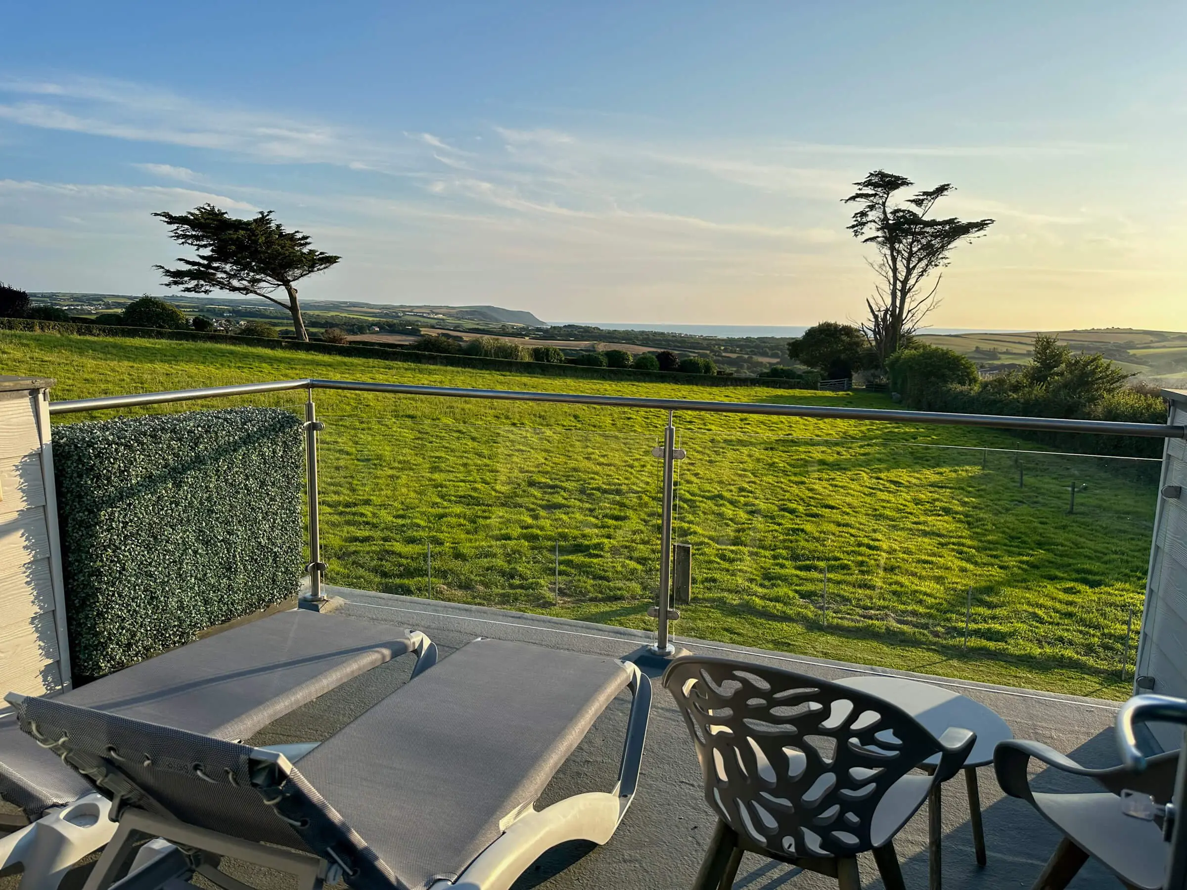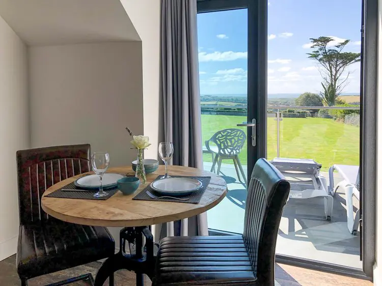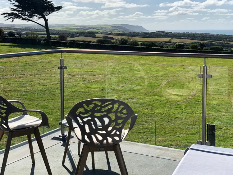 Patio doors open onto a balcony with countryside and sea views stretching towards Widemouth Bay. A smaller entrance balcony provides the perfect spot for a morning coffee while watching the sunrise. Parking is conveniently located a short distance from the apartment.