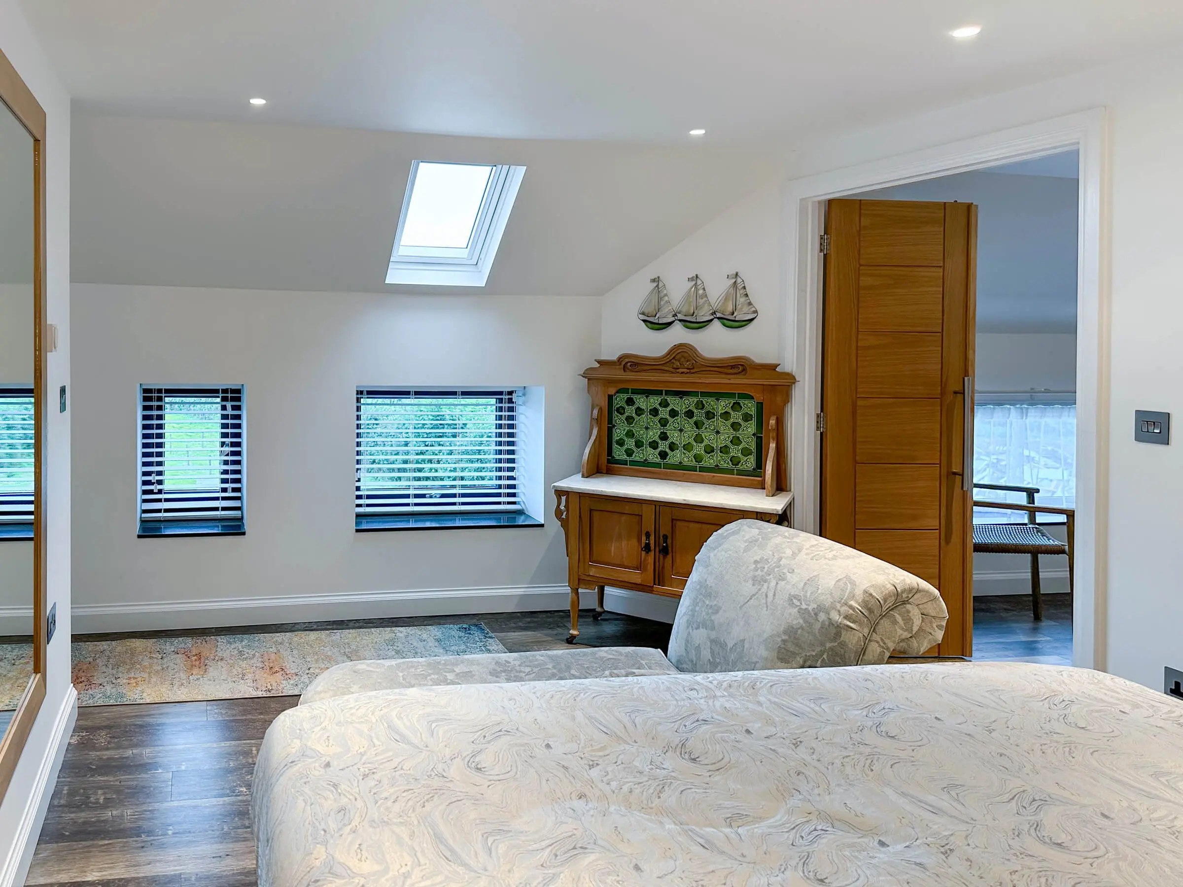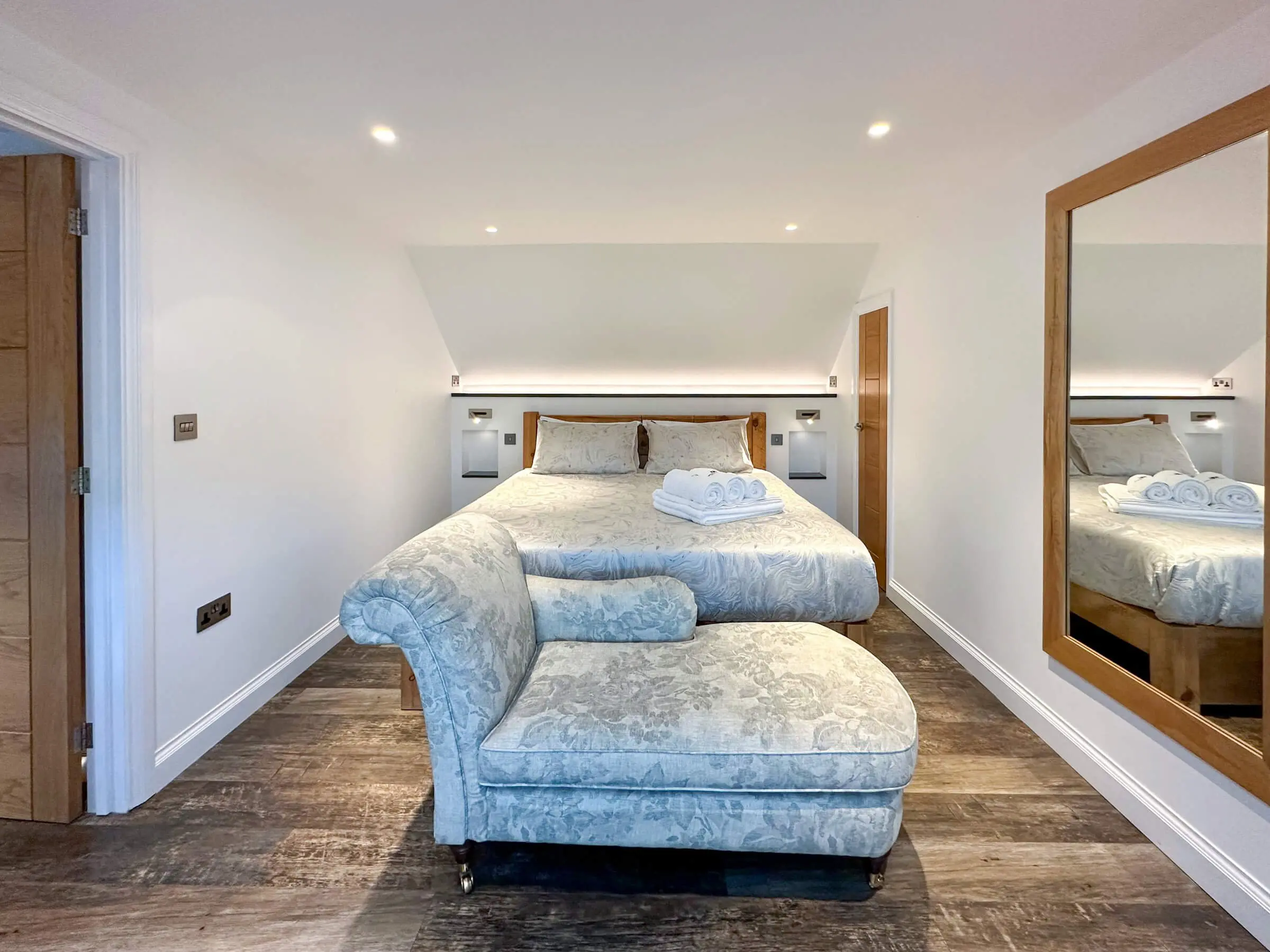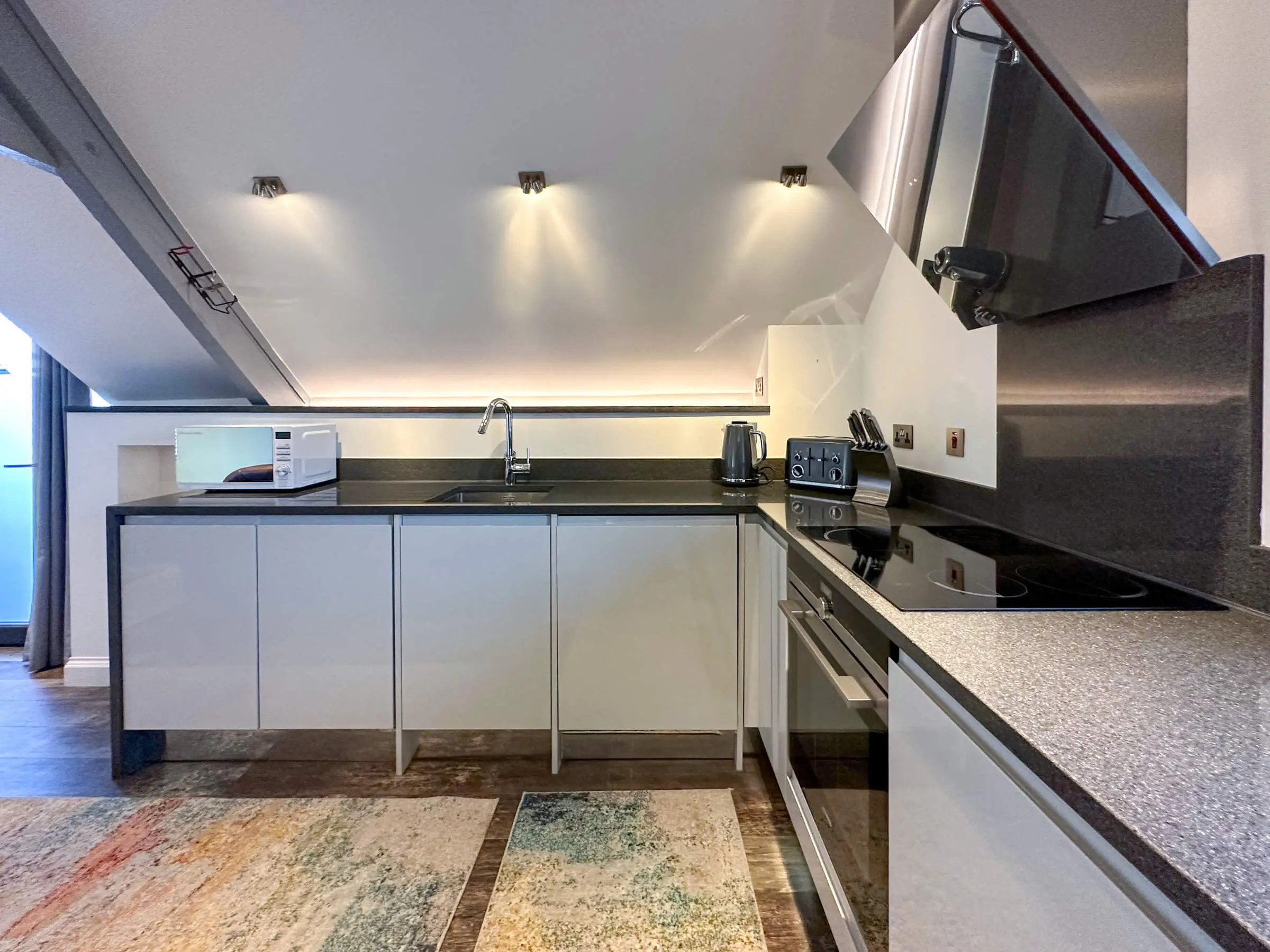 At the heart of the apartment, the open-plan bedroom features a handcrafted Canadian pine super-king bed with a sumptuous memory foam mattress. Double doors lead directly into the spacious bathroom, enhancing the sense of indulgence and flow.