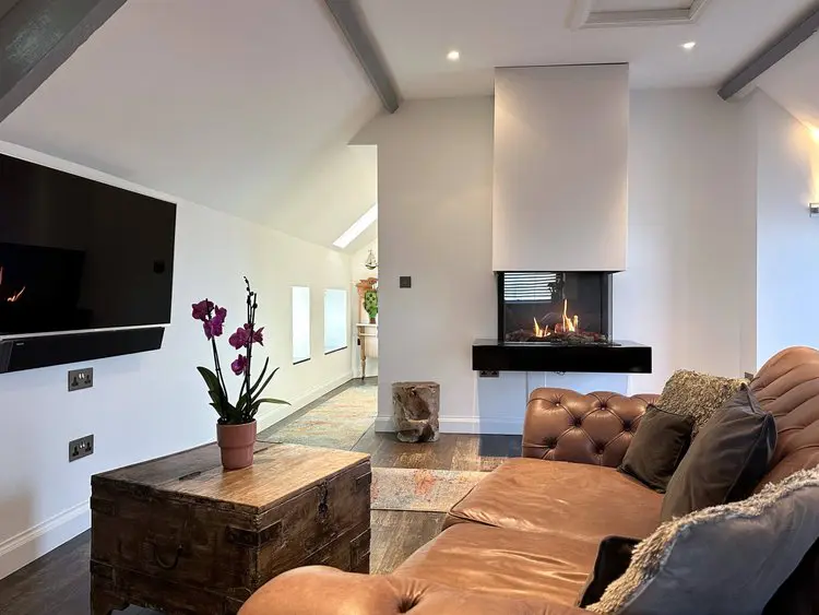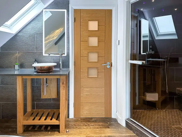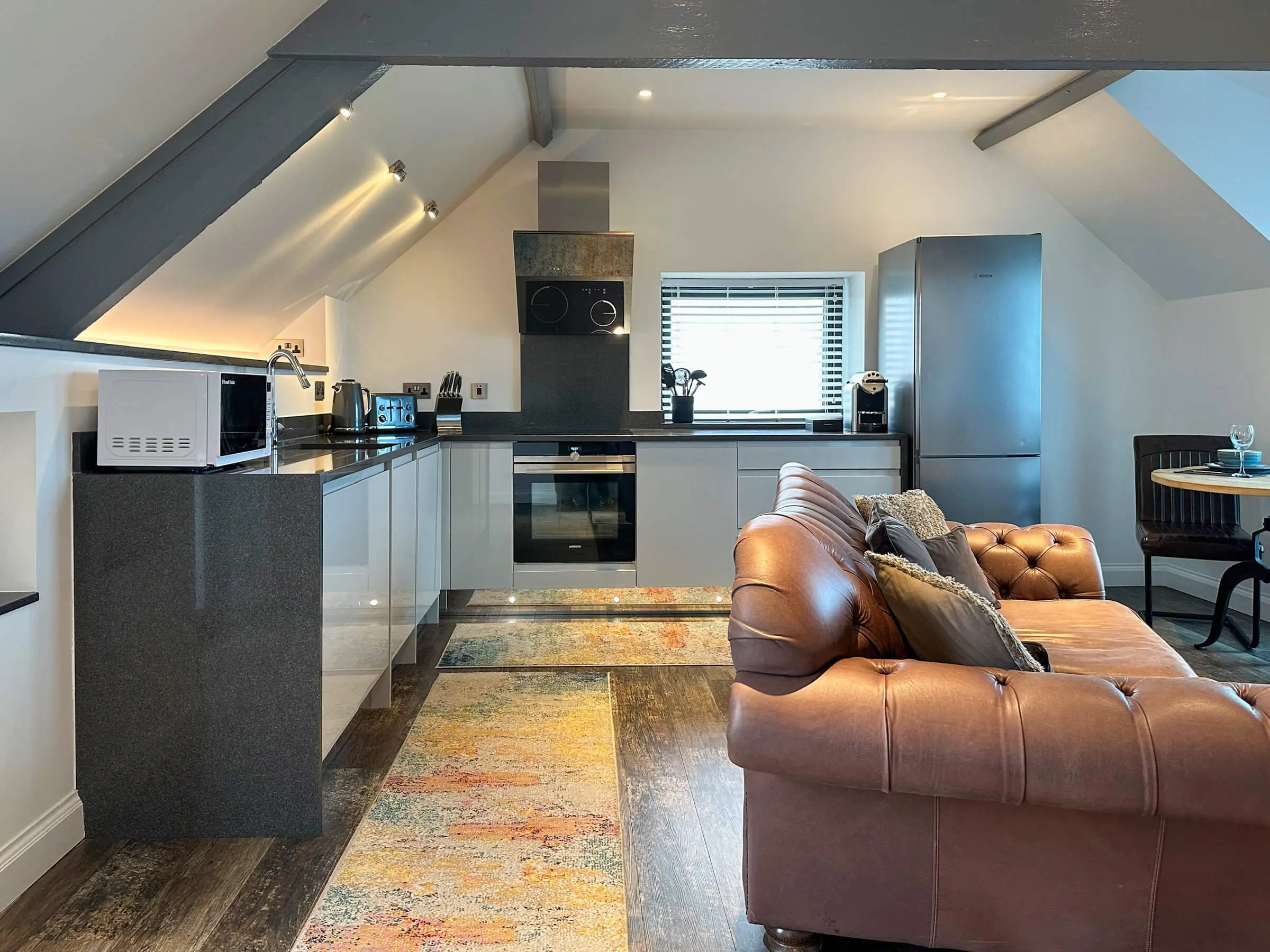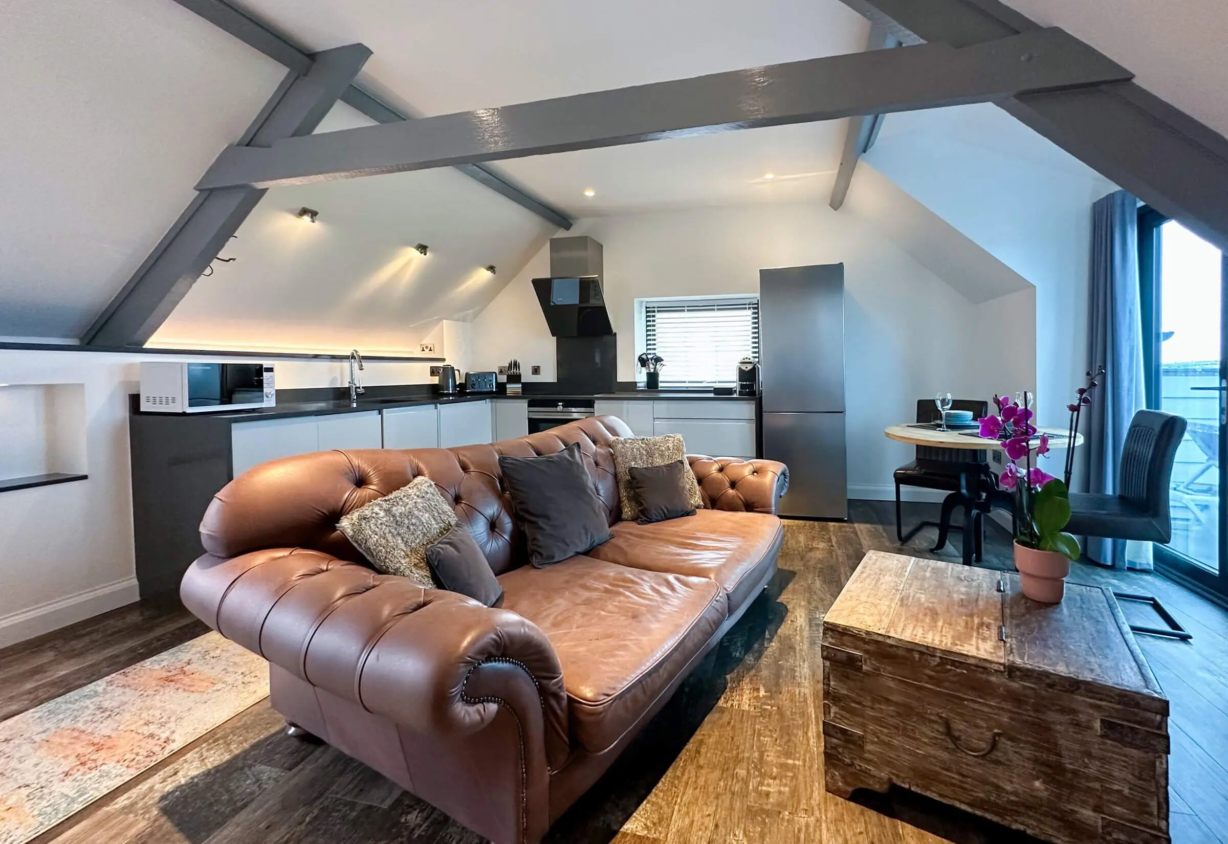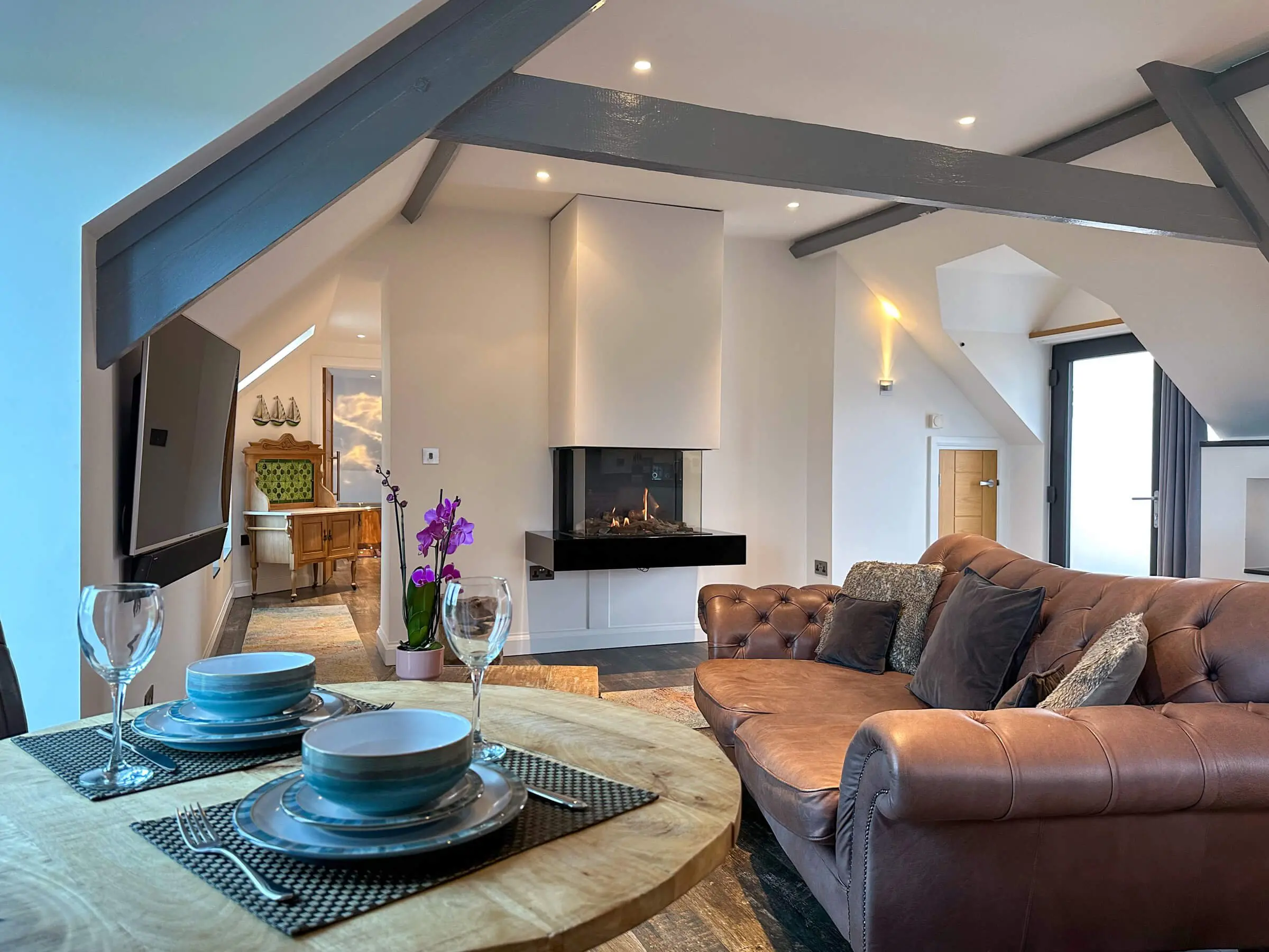 At the heart of the apartment, the open-plan bedroom features a handcrafted Canadian pine super-king bed with a sumptuous memory foam mattress. Double doors lead directly into the spacious bathroom, enhancing the sense of indulgence and flow.