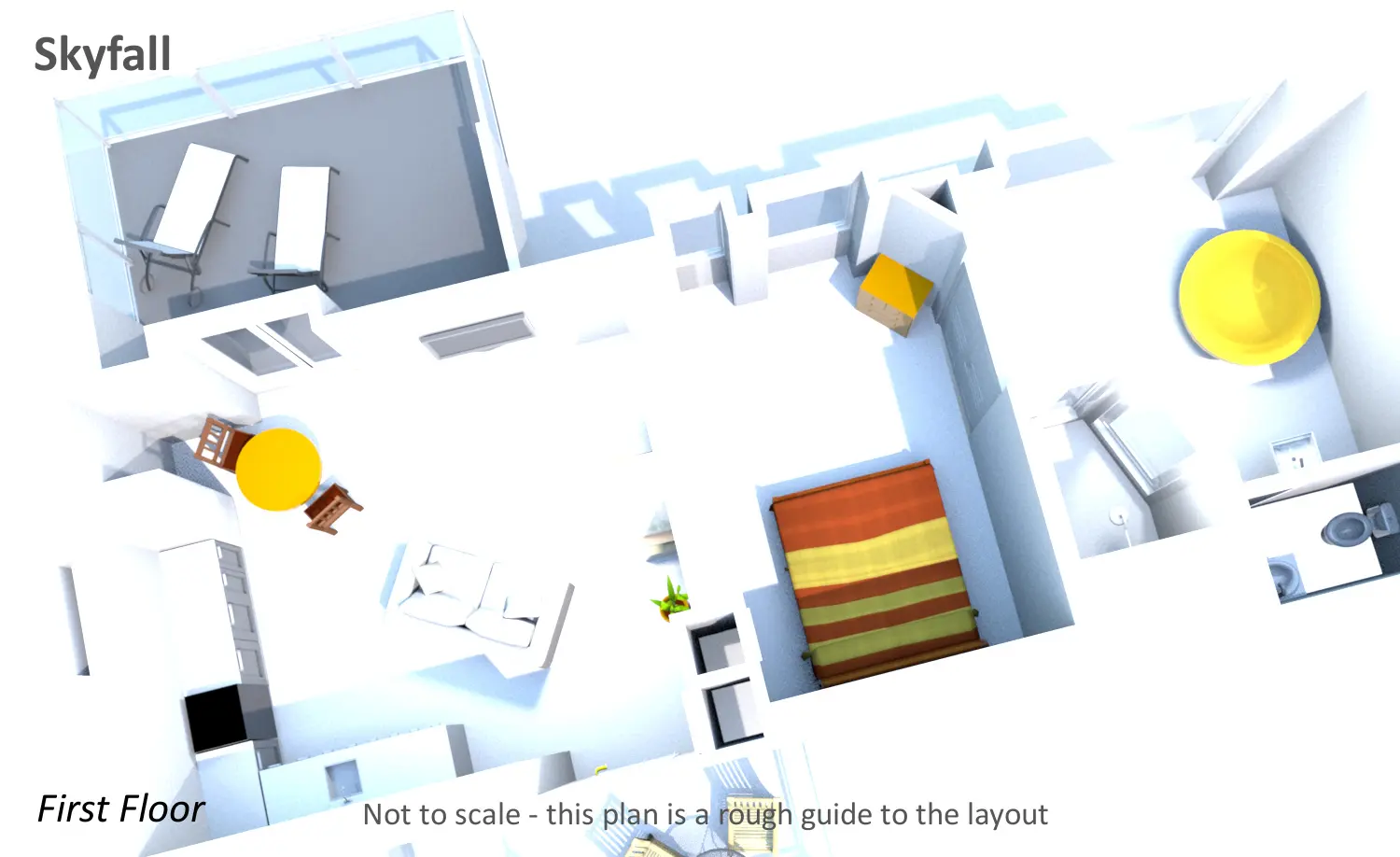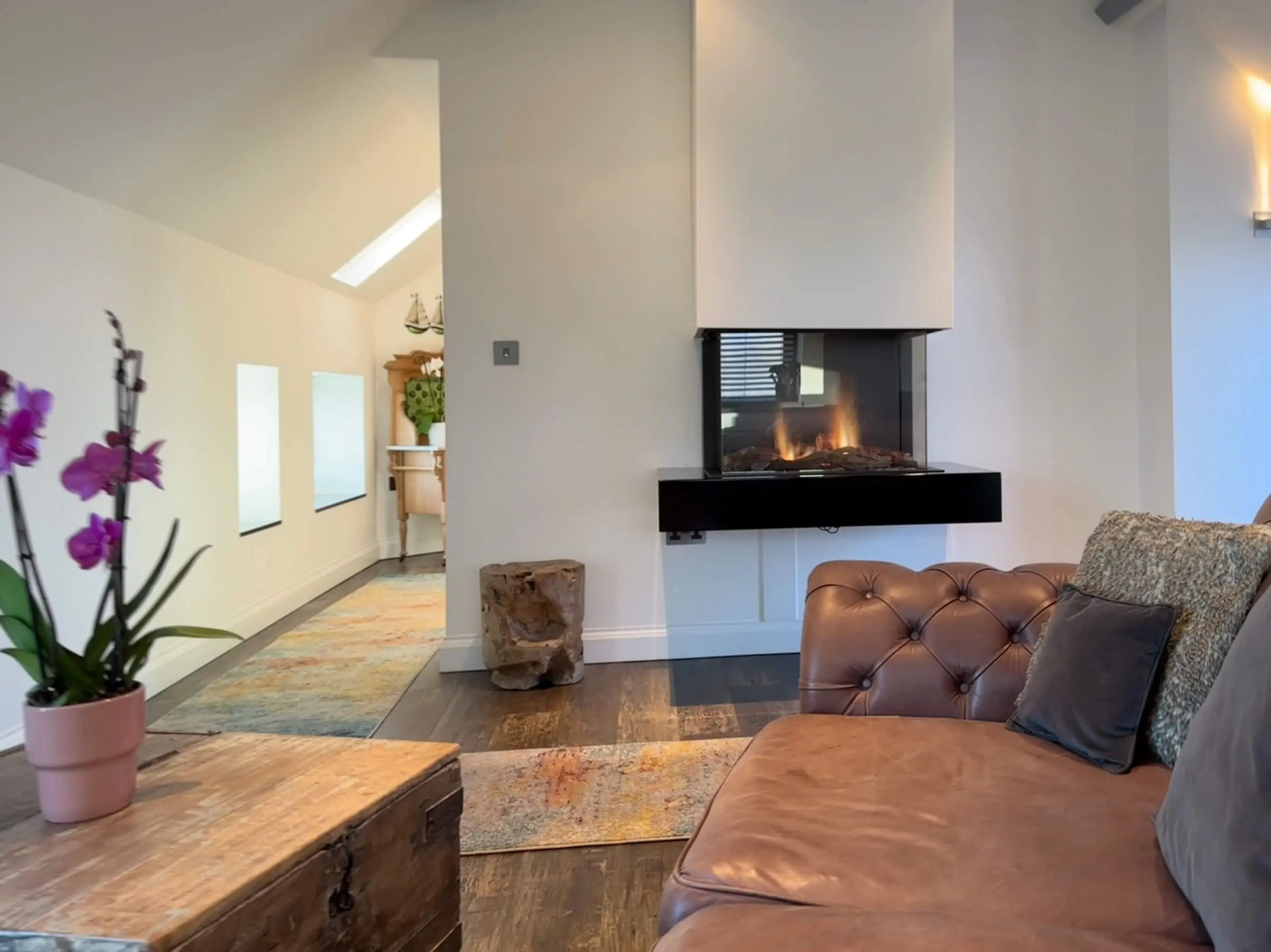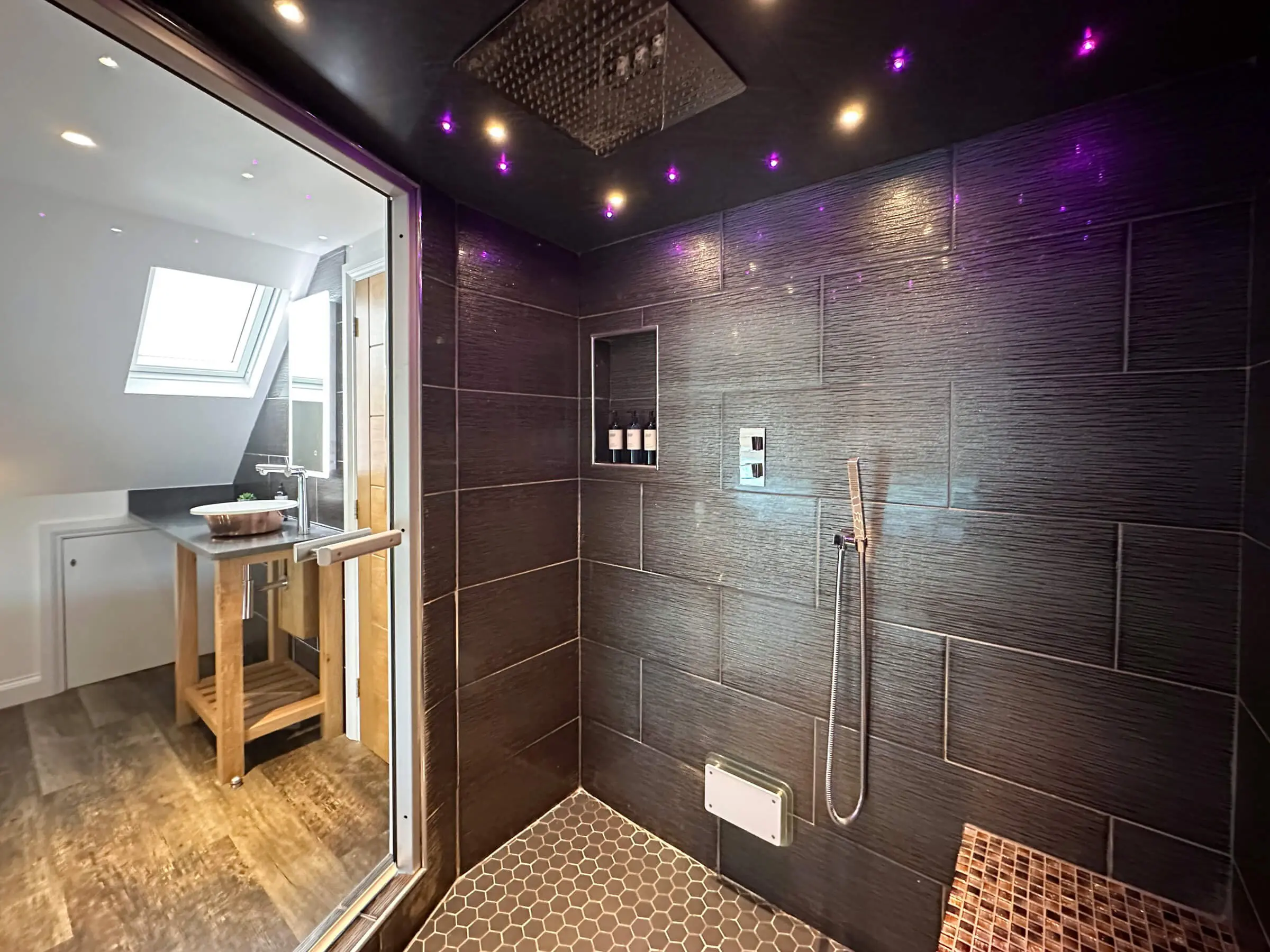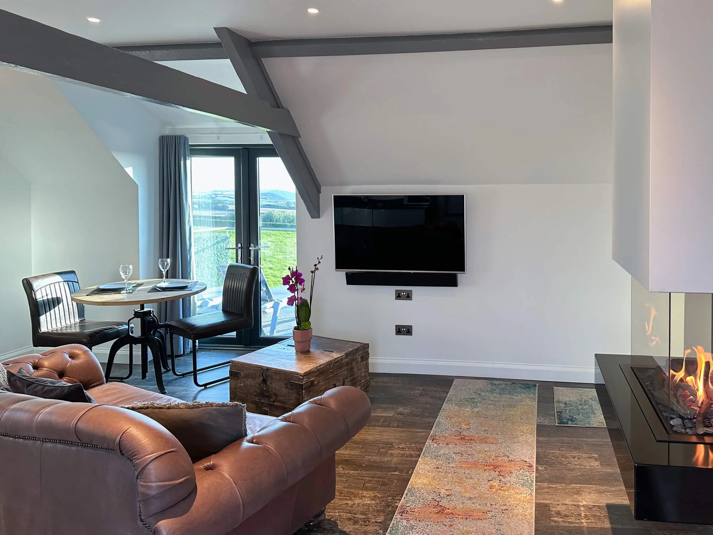 Skyfall is atmospherically lit, creating a romantic setting for couples to relax and unwind. A contemporary style blends with comfort — a cosy leather sofa invites you to sink in, while underfloor heating keeps the space warm throughout the year. In cooler months, the striking feature fire adds an extra touch of snugness.