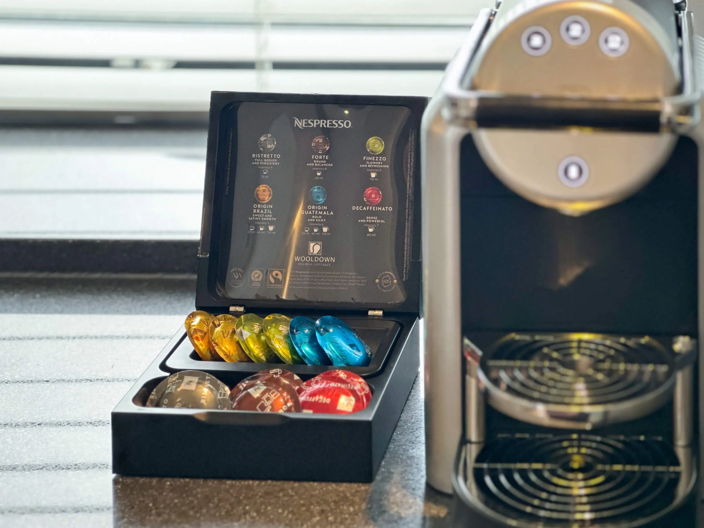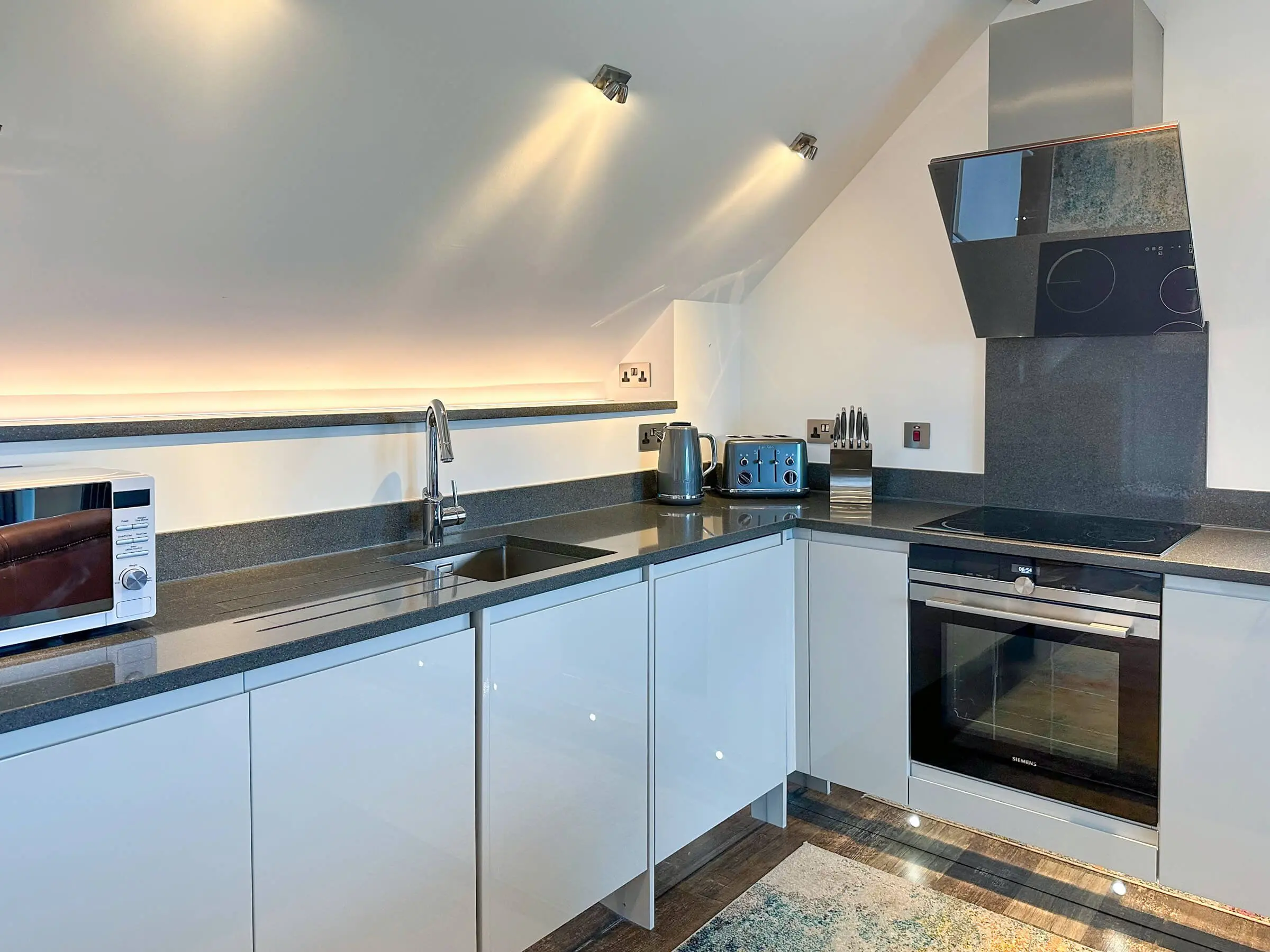 The modern kitchen is fully equipped with quality appliances and everything you need for your stay: