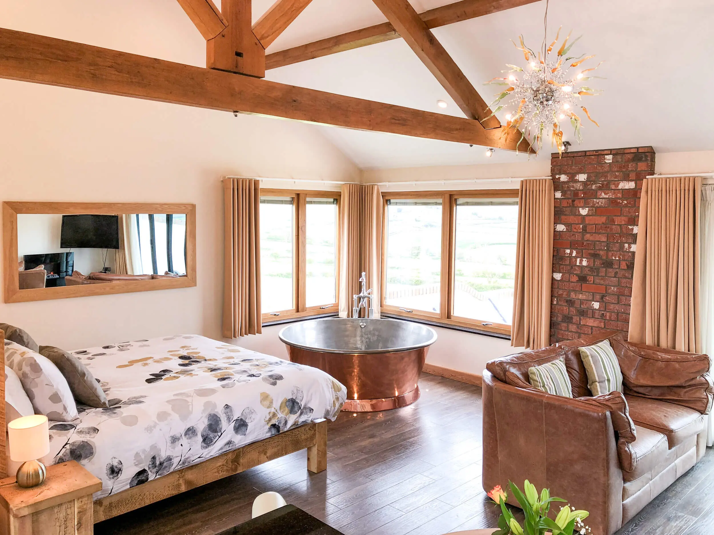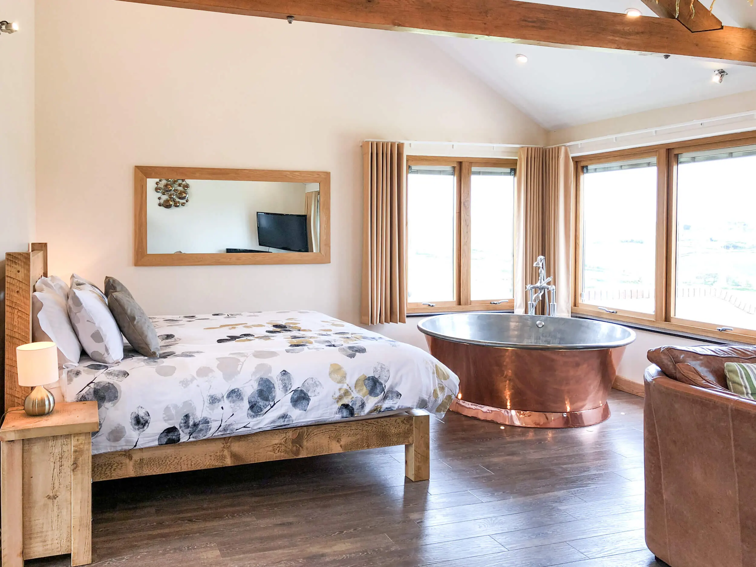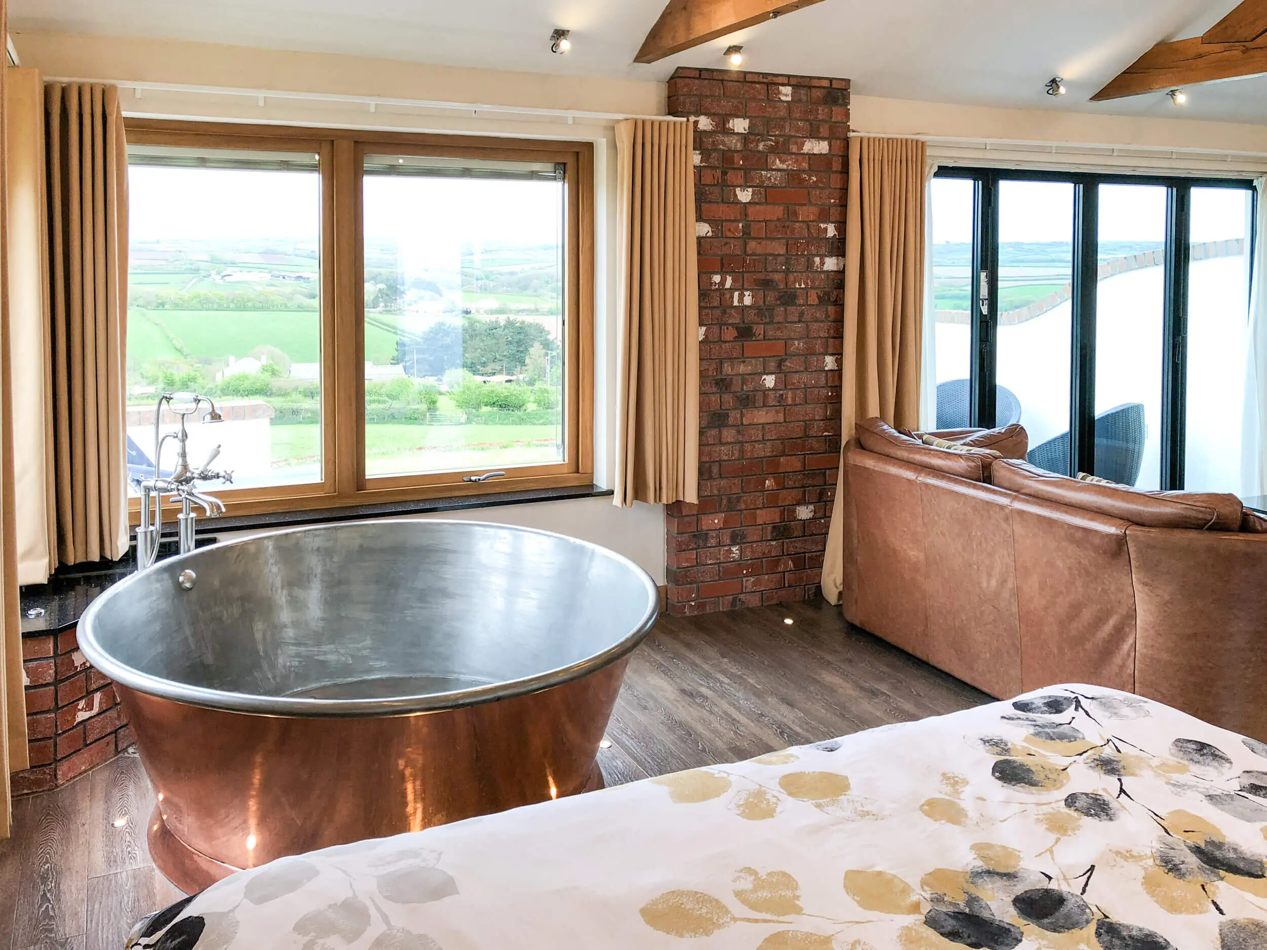 A standout feature of Stargazey, the large freestanding round copper air-spa bath with tin interior has been meticulously hand-finished by master craftsmen from the world’s leading copper bath specialists. Its elevated position allows you to soak in tranquillity while admiring sweeping views of the rolling Cornish countryside.