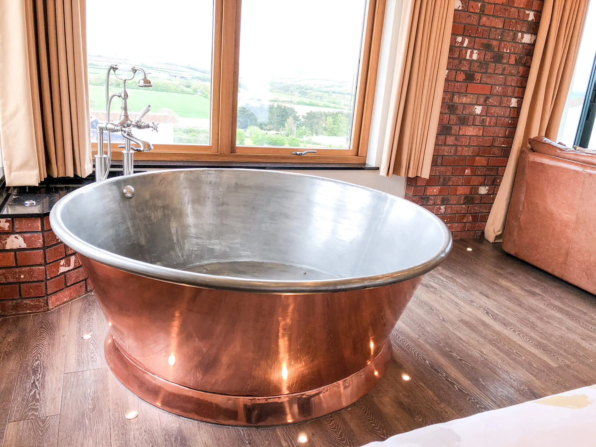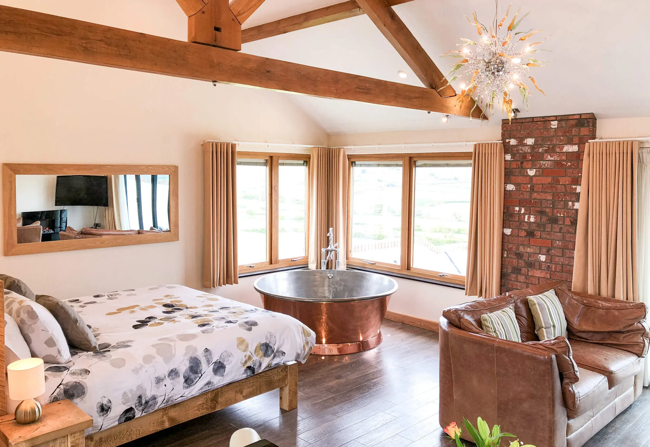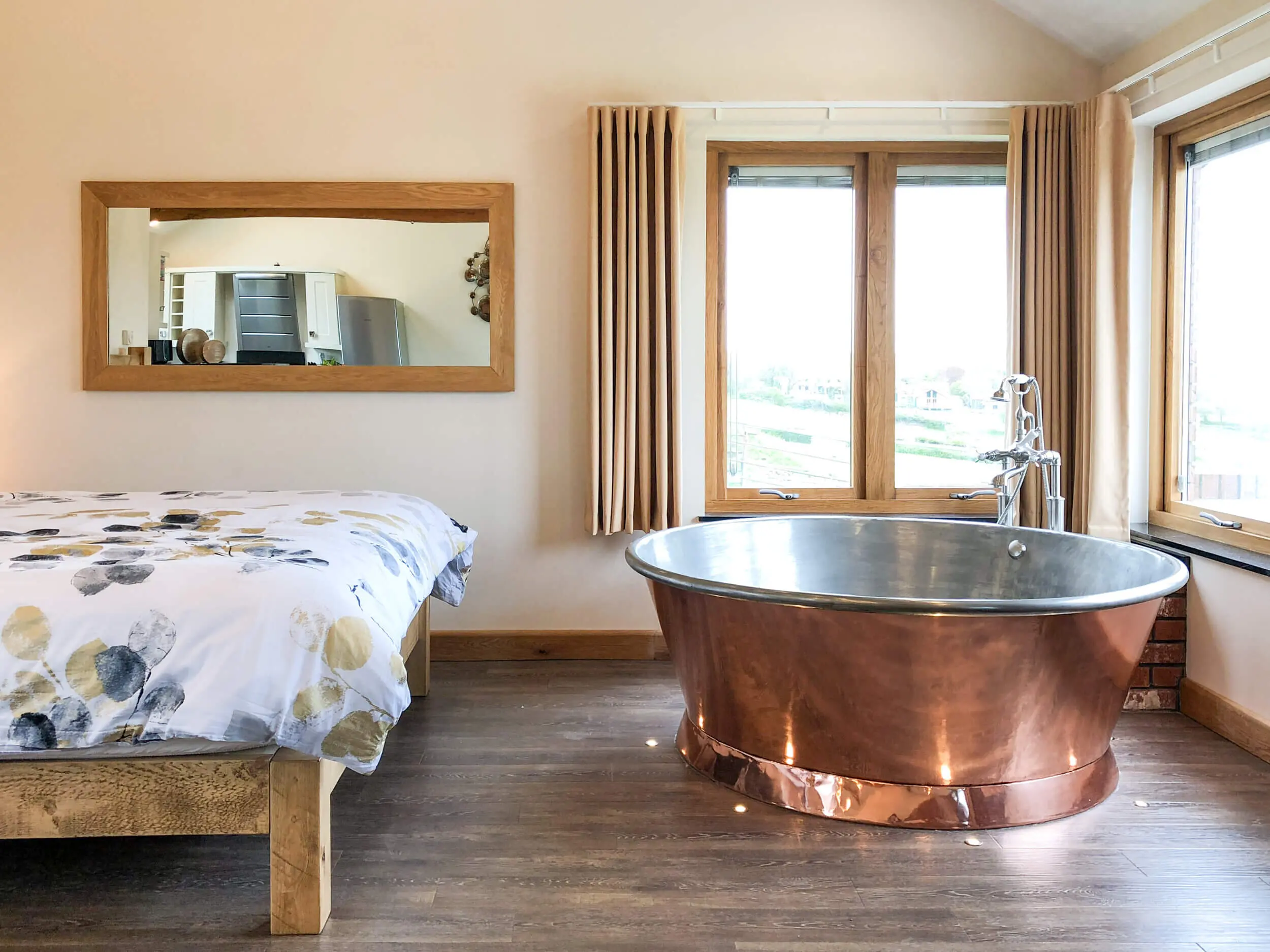 A standout feature of Stargazey, the large freestanding round copper air-spa bath with tin interior has been meticulously hand-finished by master craftsmen from the world’s leading copper bath specialists. Its elevated position allows you to soak in tranquillity while admiring sweeping views of the rolling Cornish countryside.