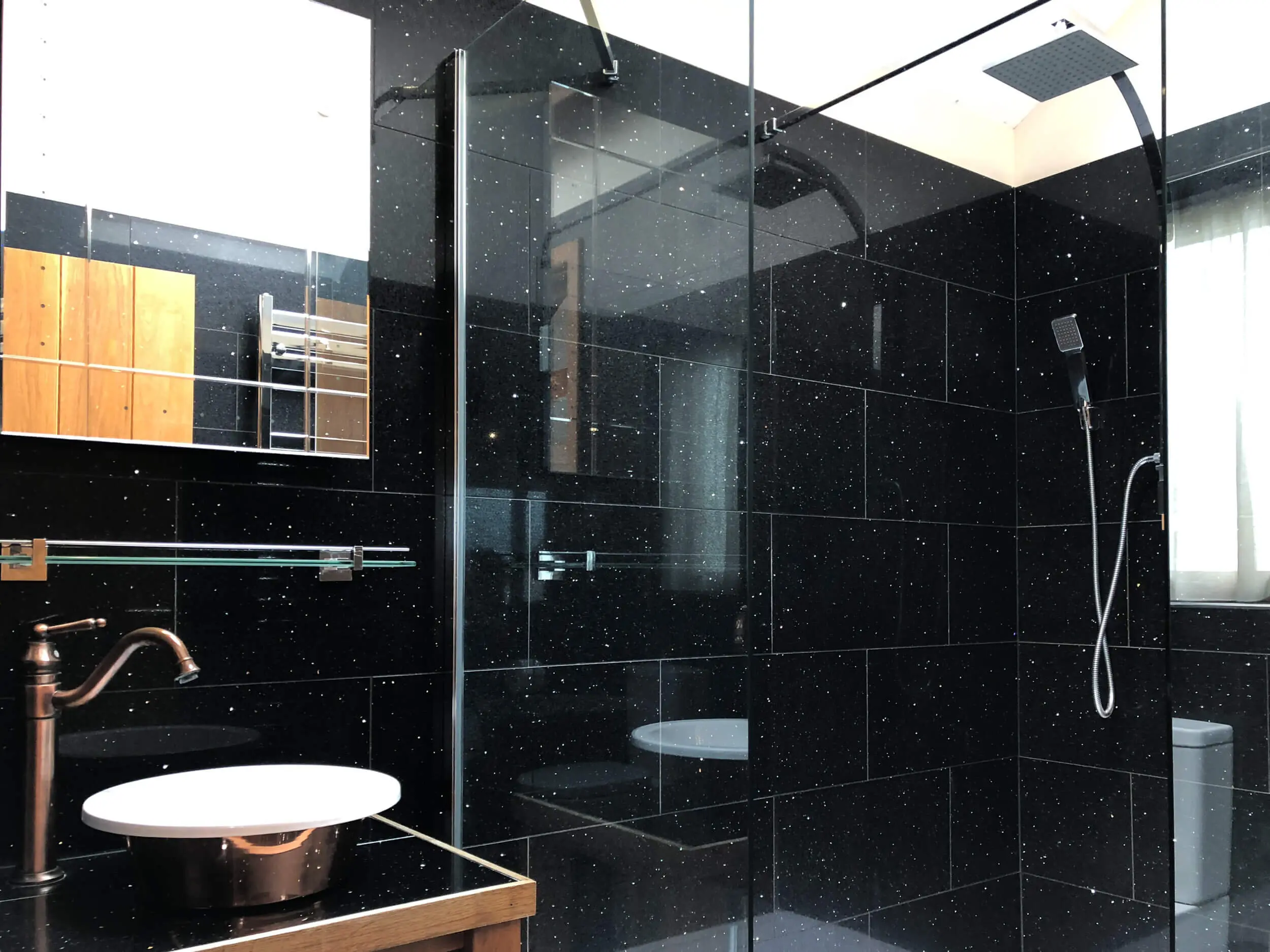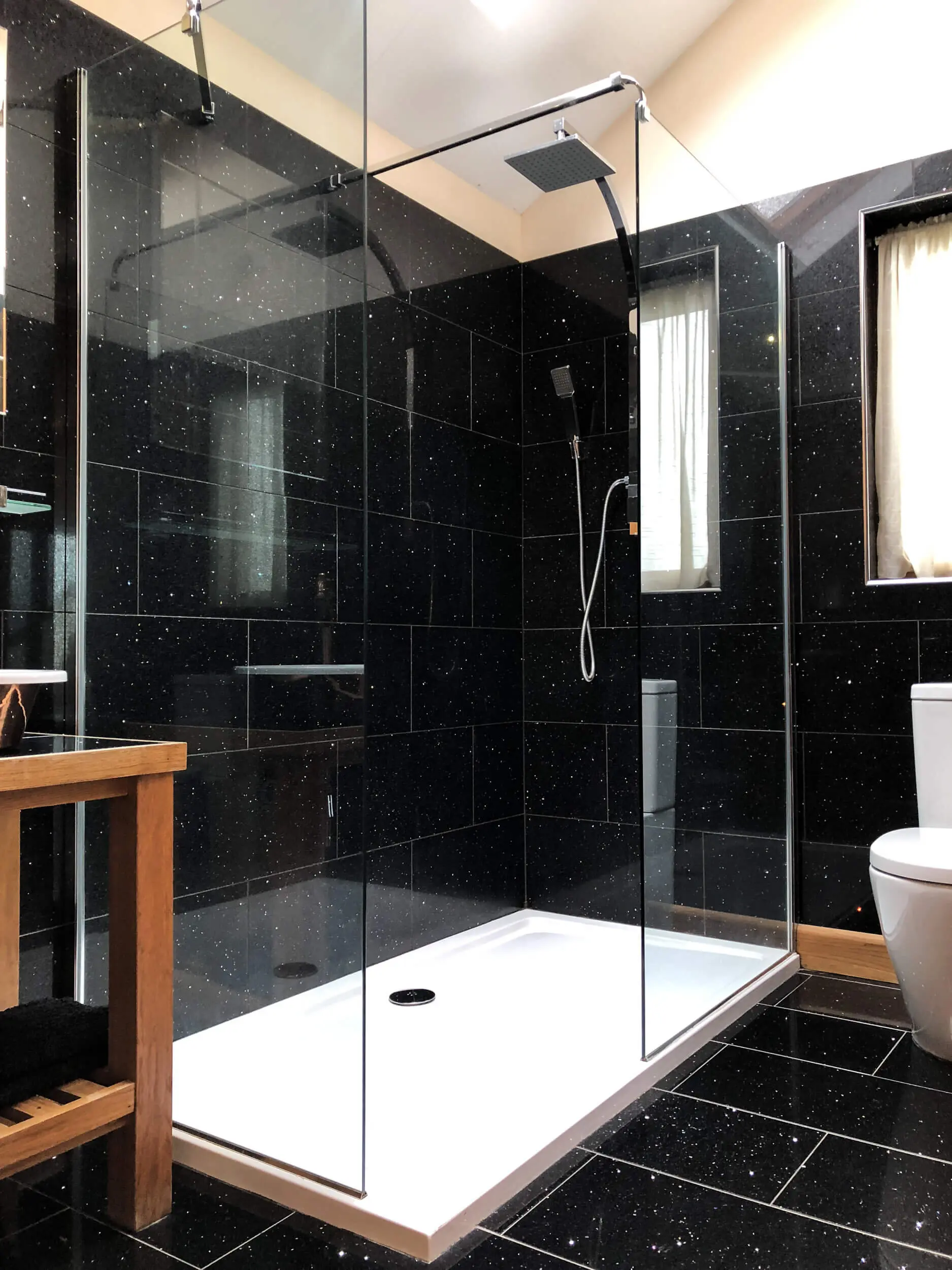 The shower room features bold black sparkling tiles, a spacious walk-in rainfall shower, and locally made toiletries with bath foam for a touch of indulgence.