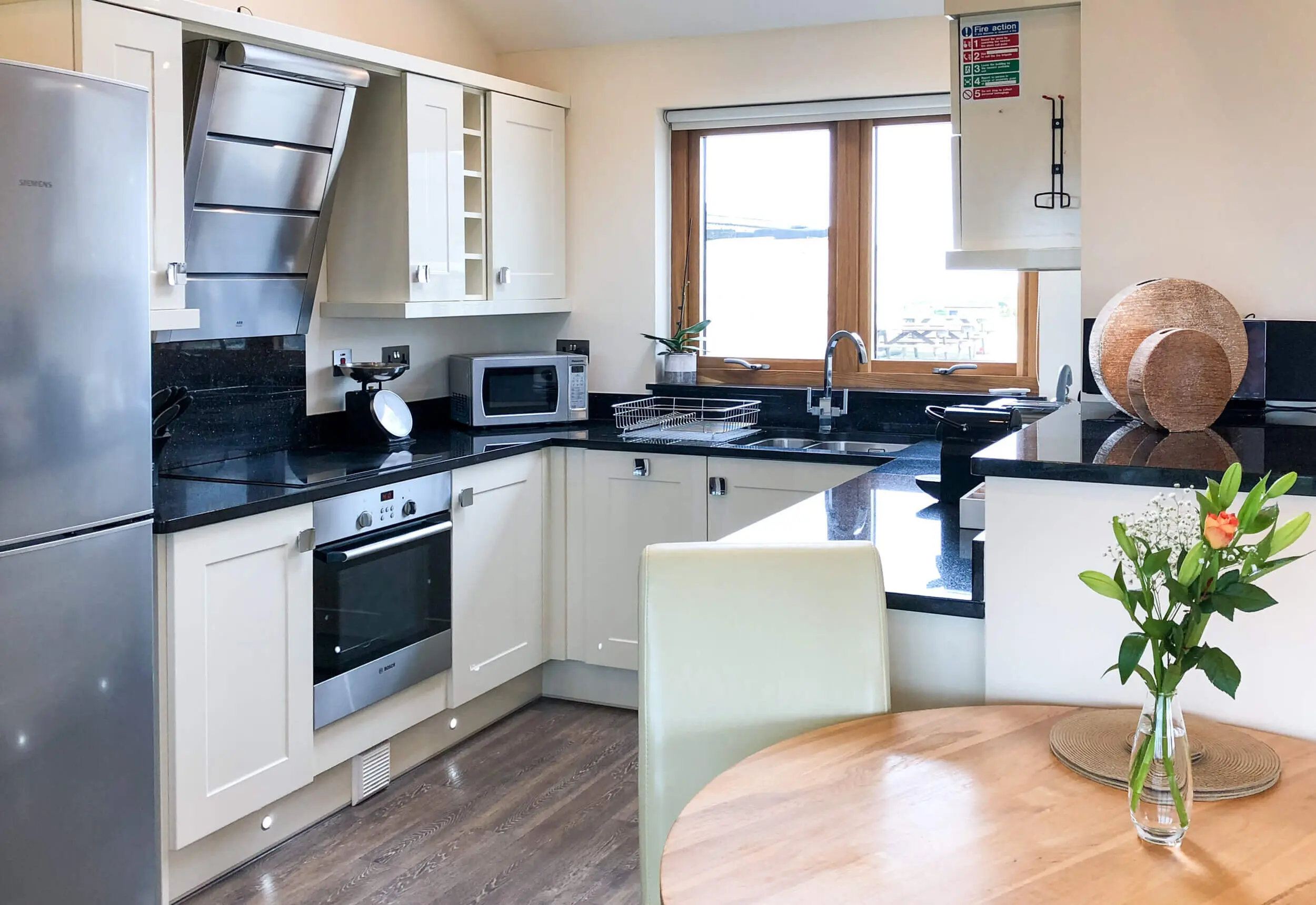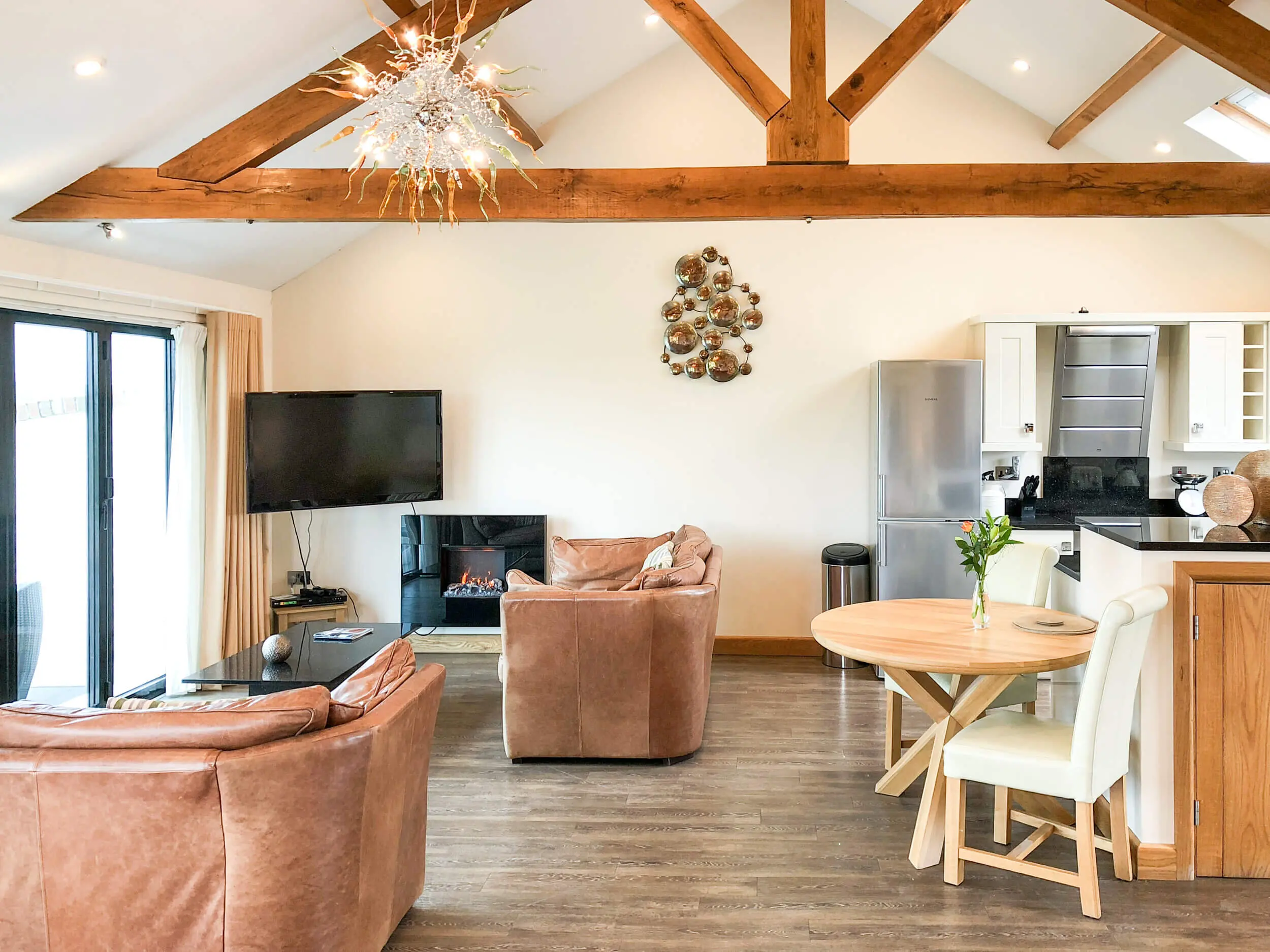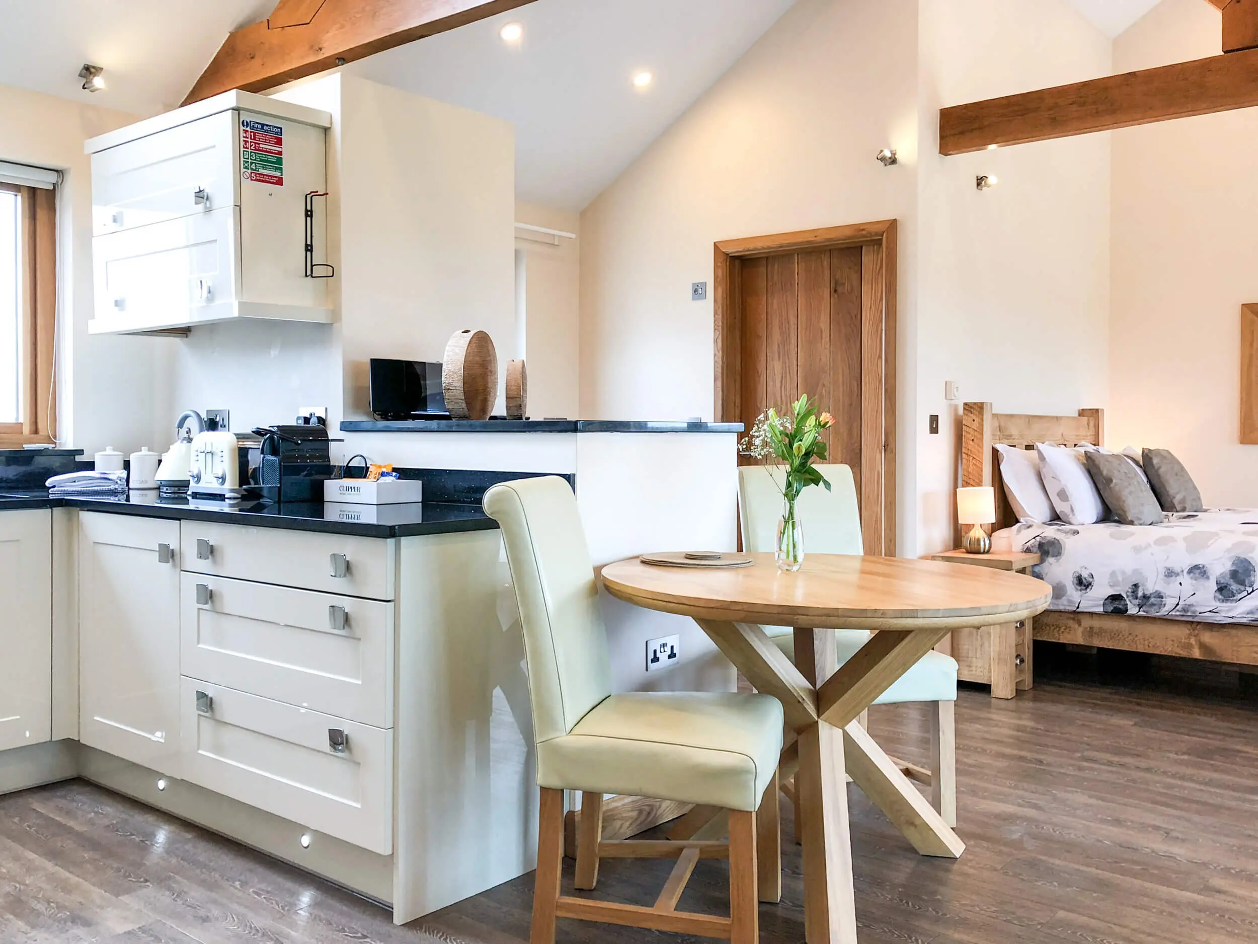 Spotlighting draws attention to the striking chunky oak beams, adding a traditional character to this otherwise contemporary space. Solid oak doors and a stylish kitchen with Galaxy Black granite — flecked with copper and gold — enhance the apartment’s refined finish.
