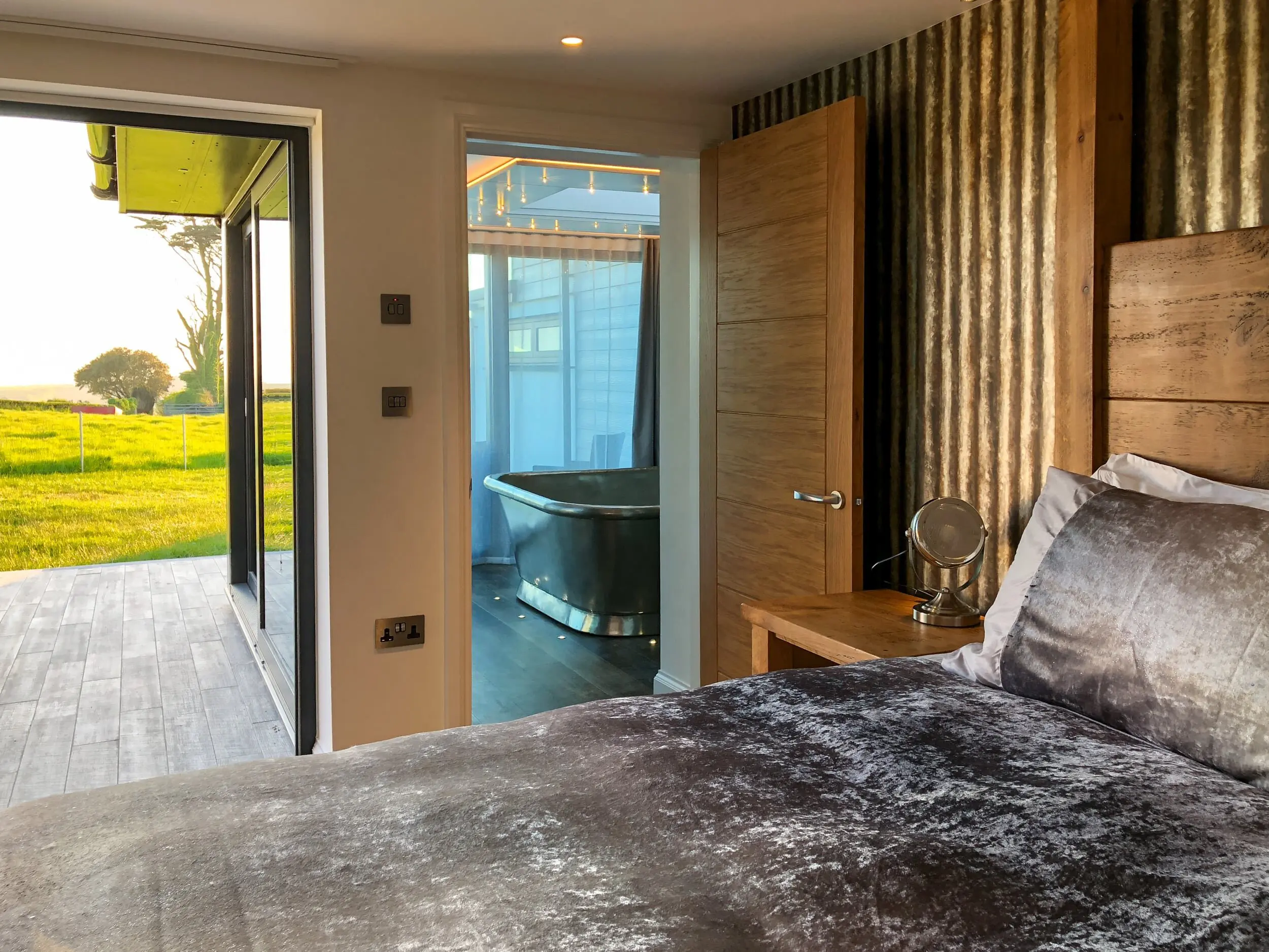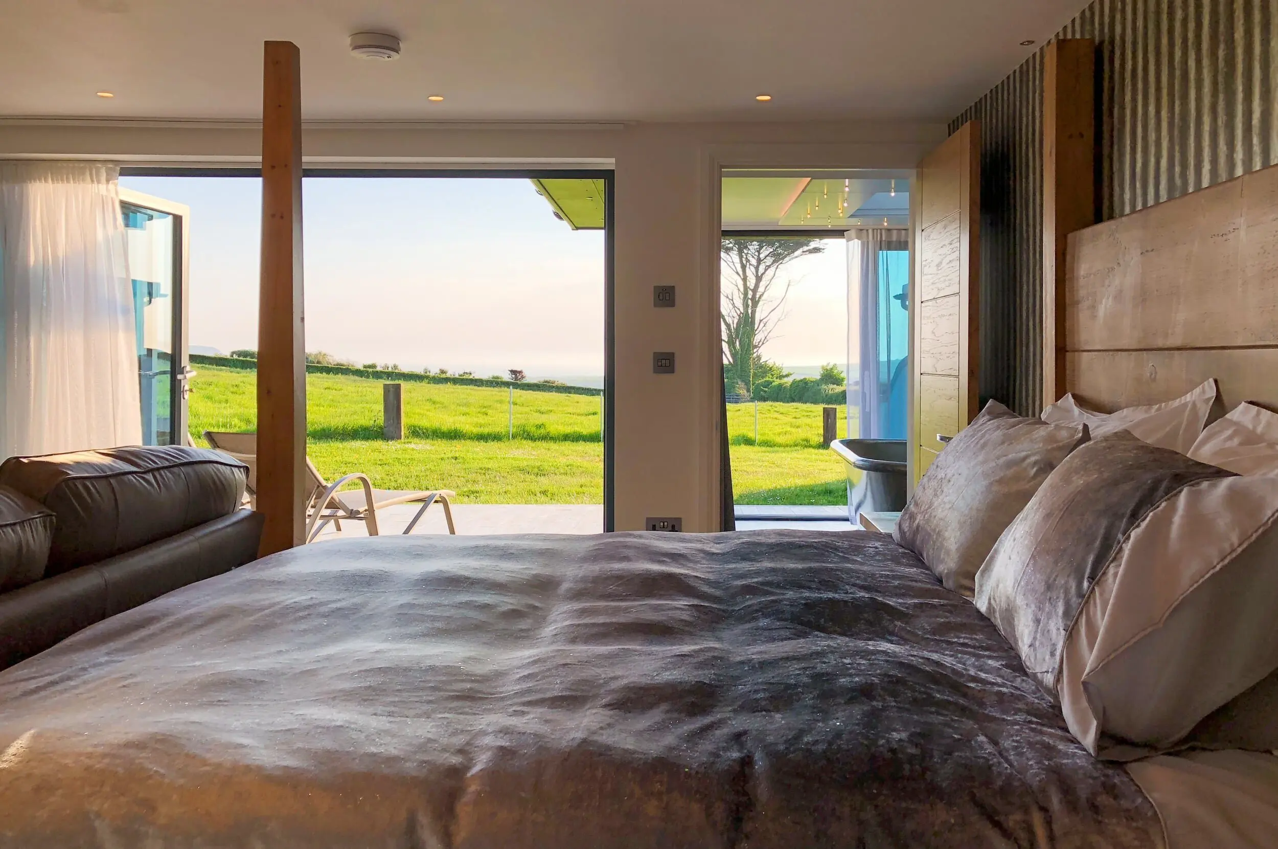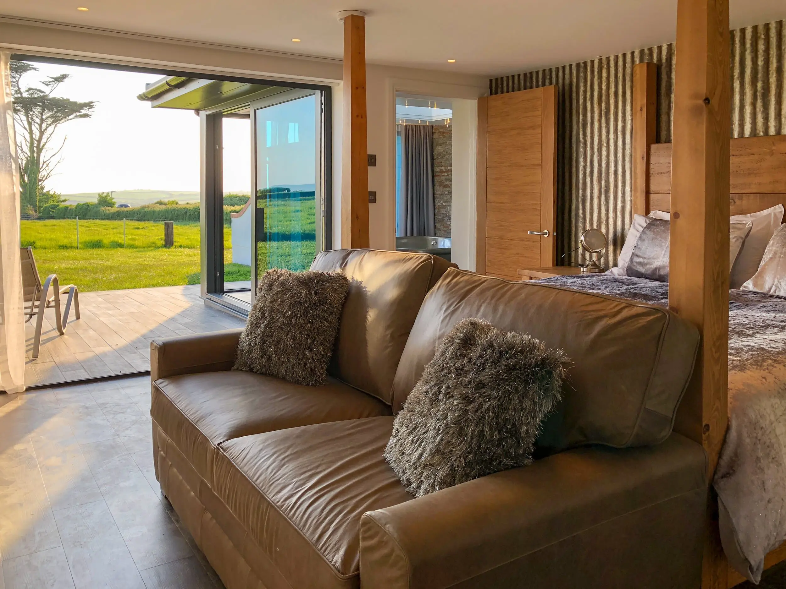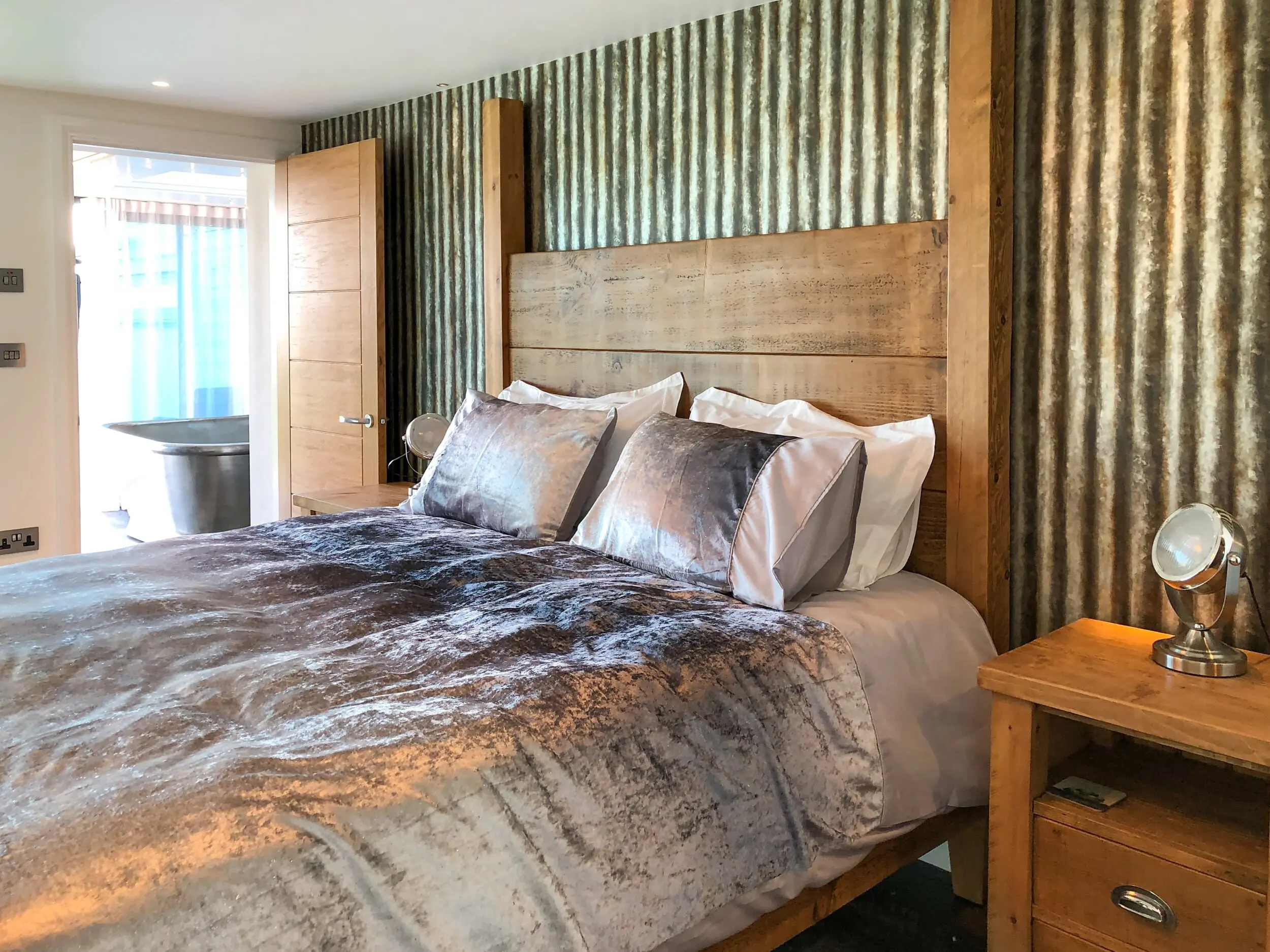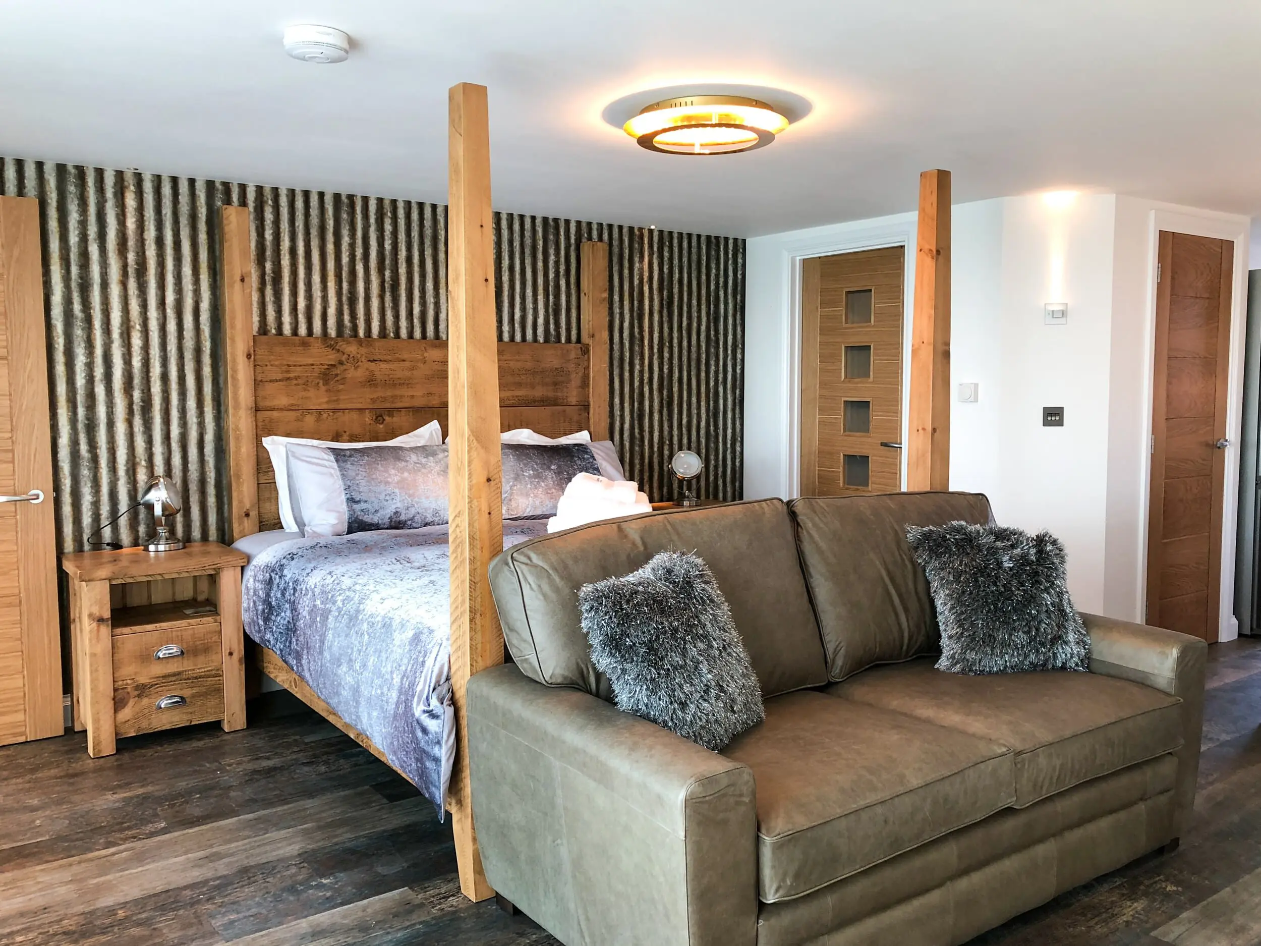 The open-plan bedroom features a handcrafted Canadian pine super-king four-poster bed with a sumptuous memory foam mattress for the perfect night’s rest. Bi-folding doors open directly onto the patio, flooding the space with light and views.