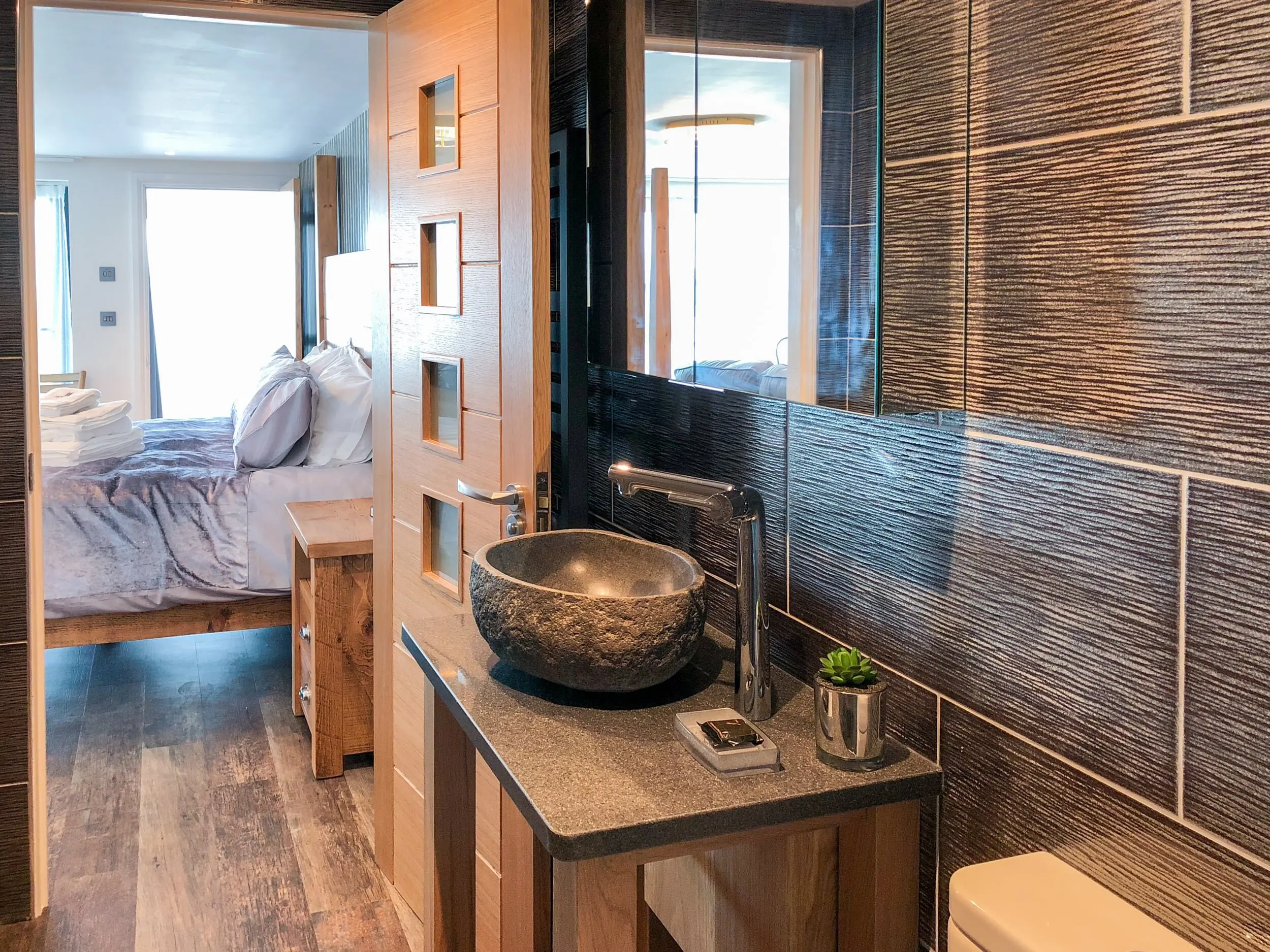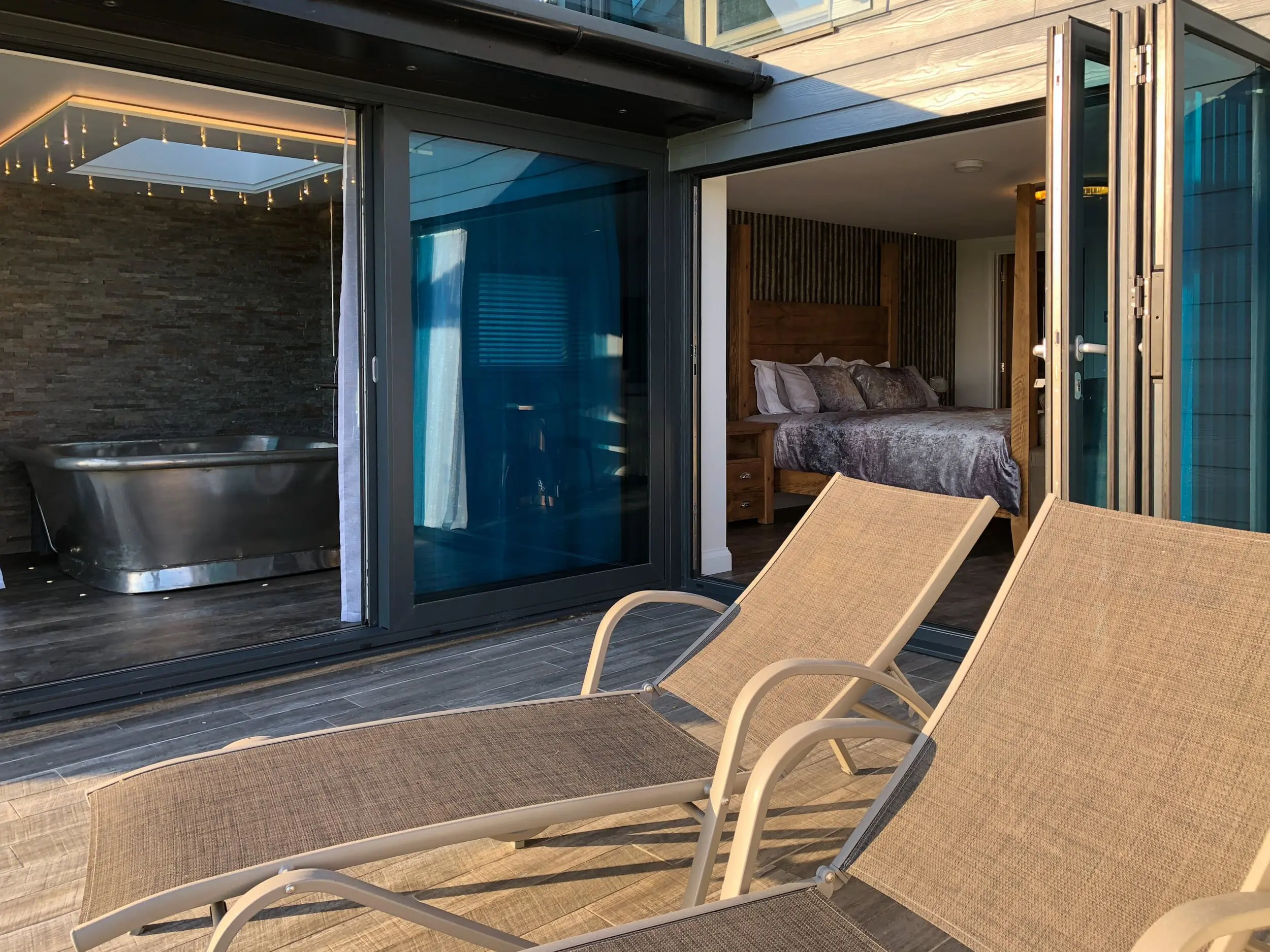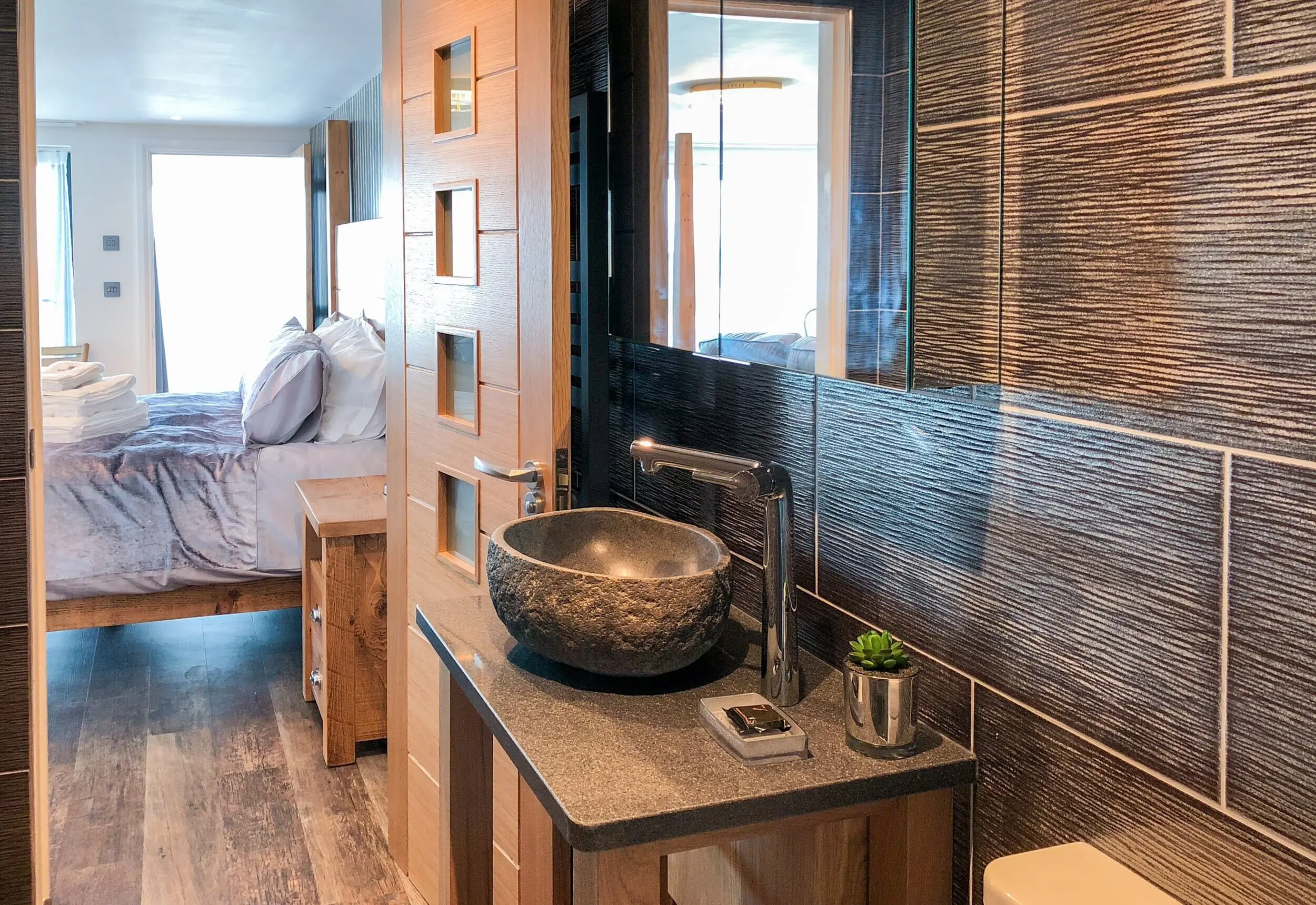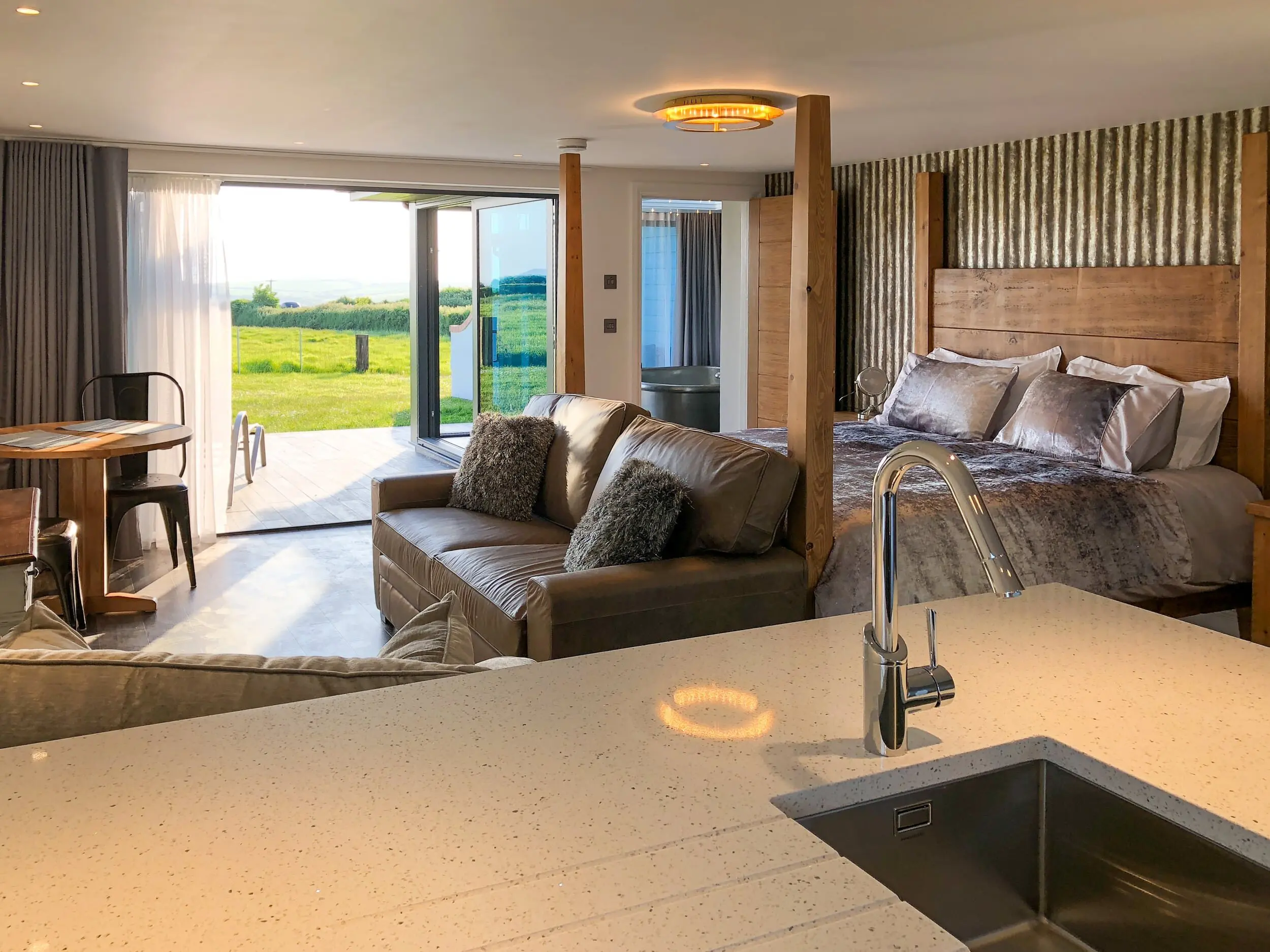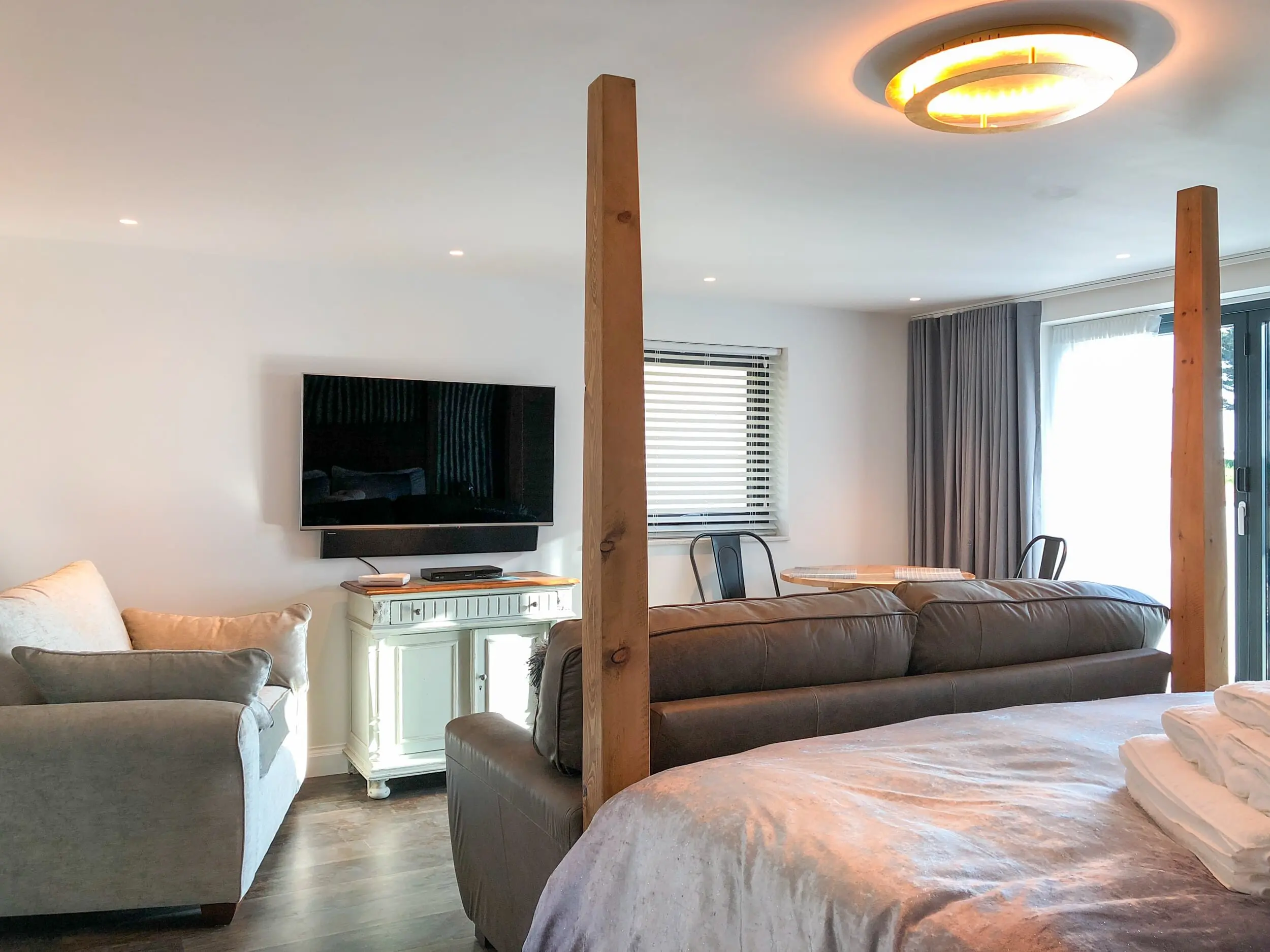 The open-plan bedroom features a handcrafted Canadian pine super-king four-poster bed with a sumptuous memory foam mattress for the perfect night’s rest. Bi-folding doors open directly onto the patio, flooding the space with light and views.
