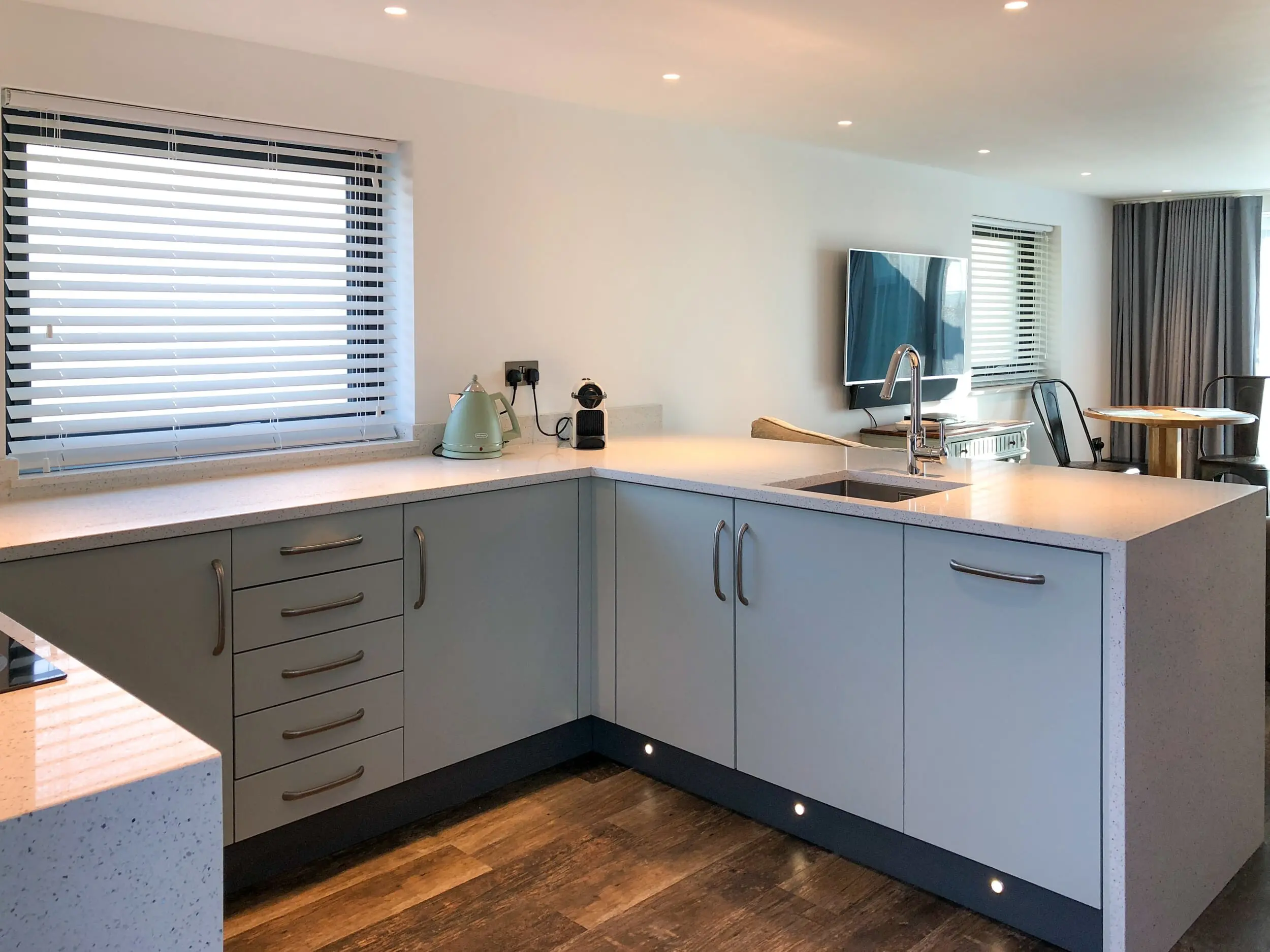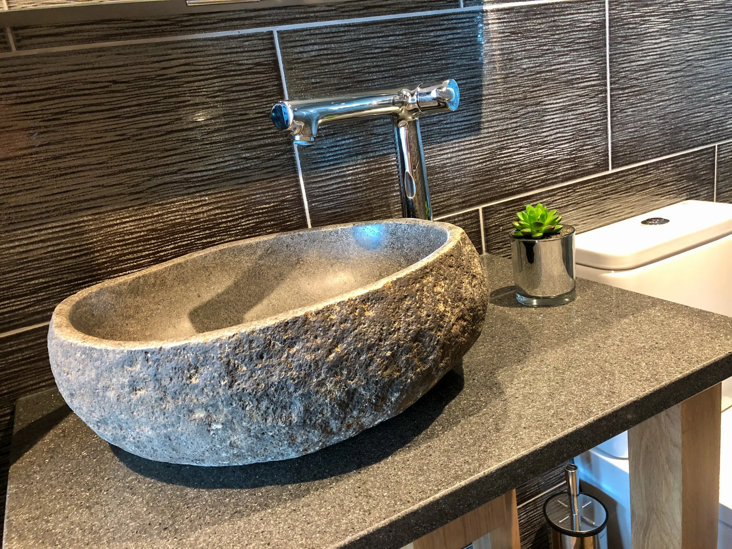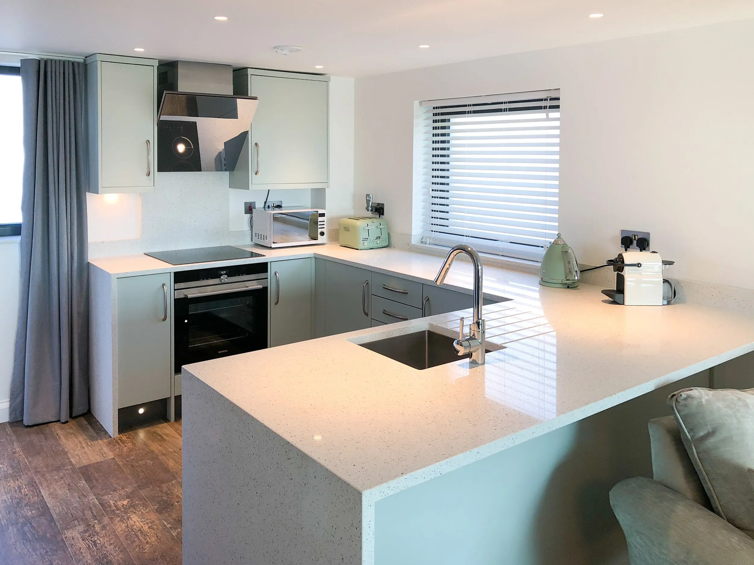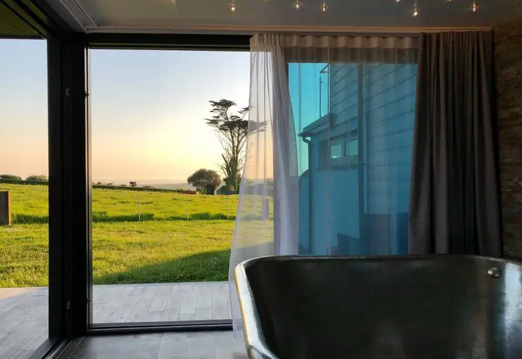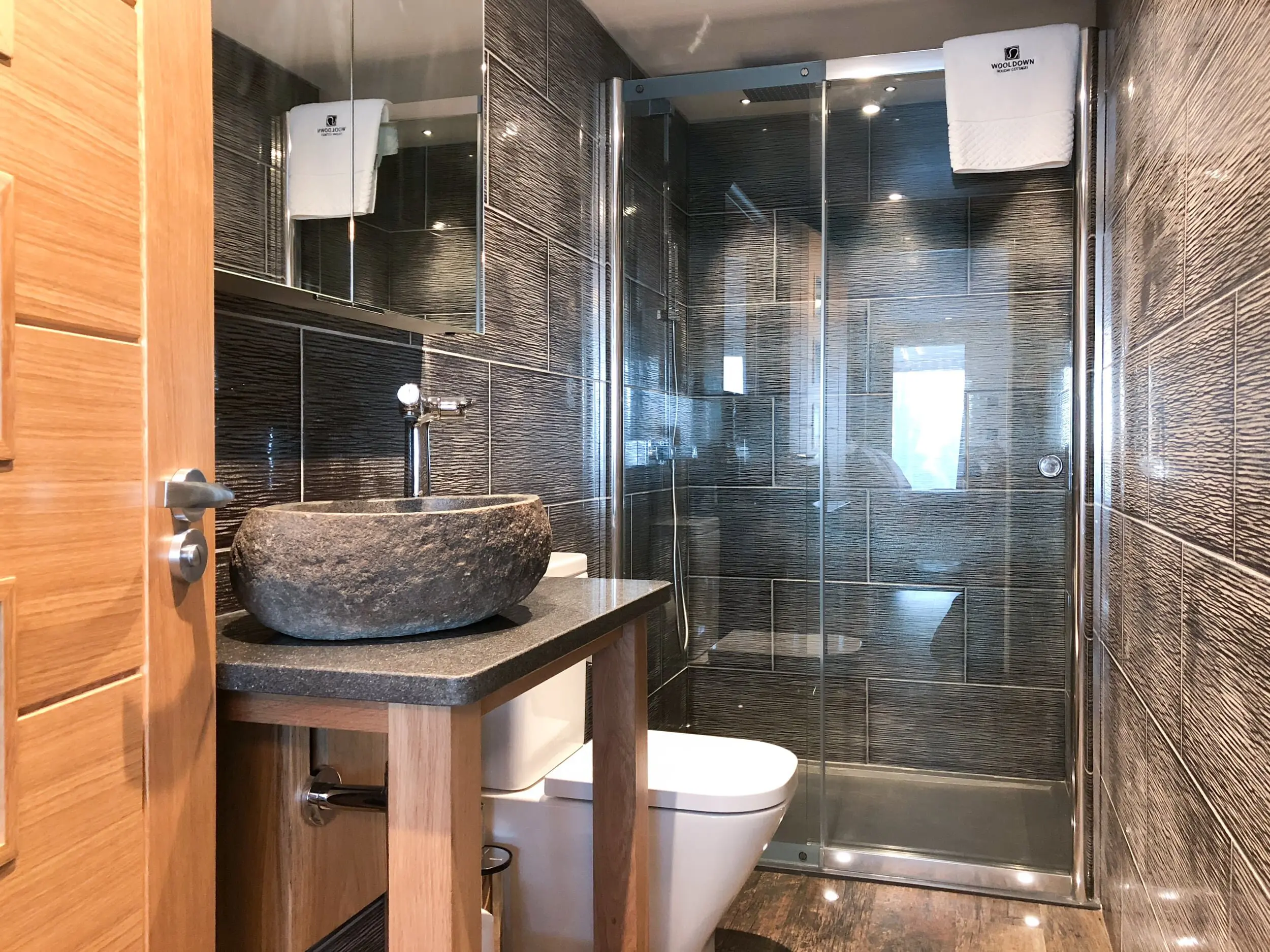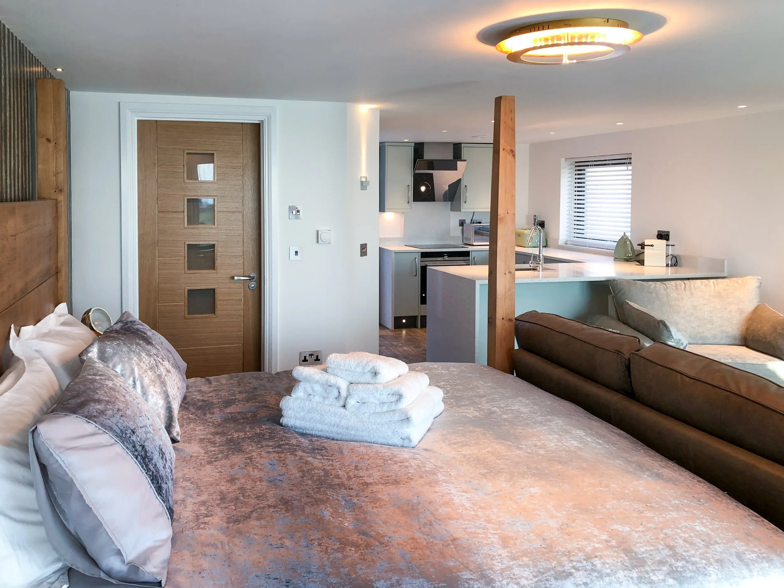 The open-plan bedroom features a handcrafted Canadian pine super-king four-poster bed with a sumptuous memory foam mattress for the perfect night’s rest. Bi-folding doors open directly onto the patio, flooding the space with light and views.