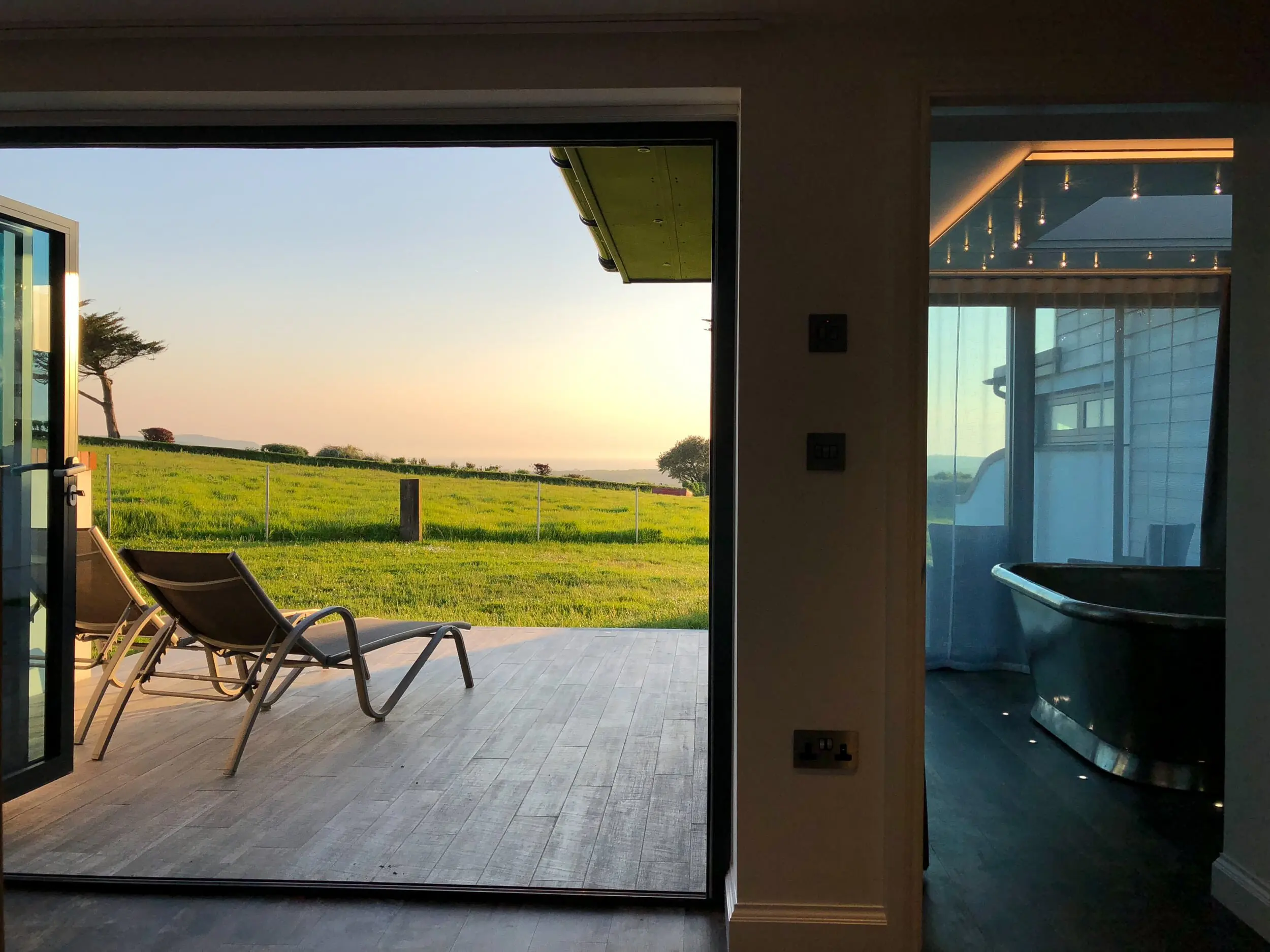 From the patio — or even from the air-spa bath — enjoy spectacular countryside and sea vistas stretching towards Widemouth Bay.