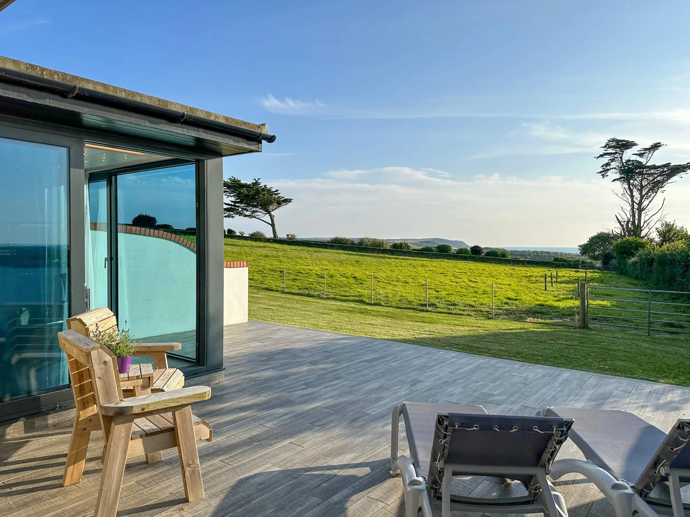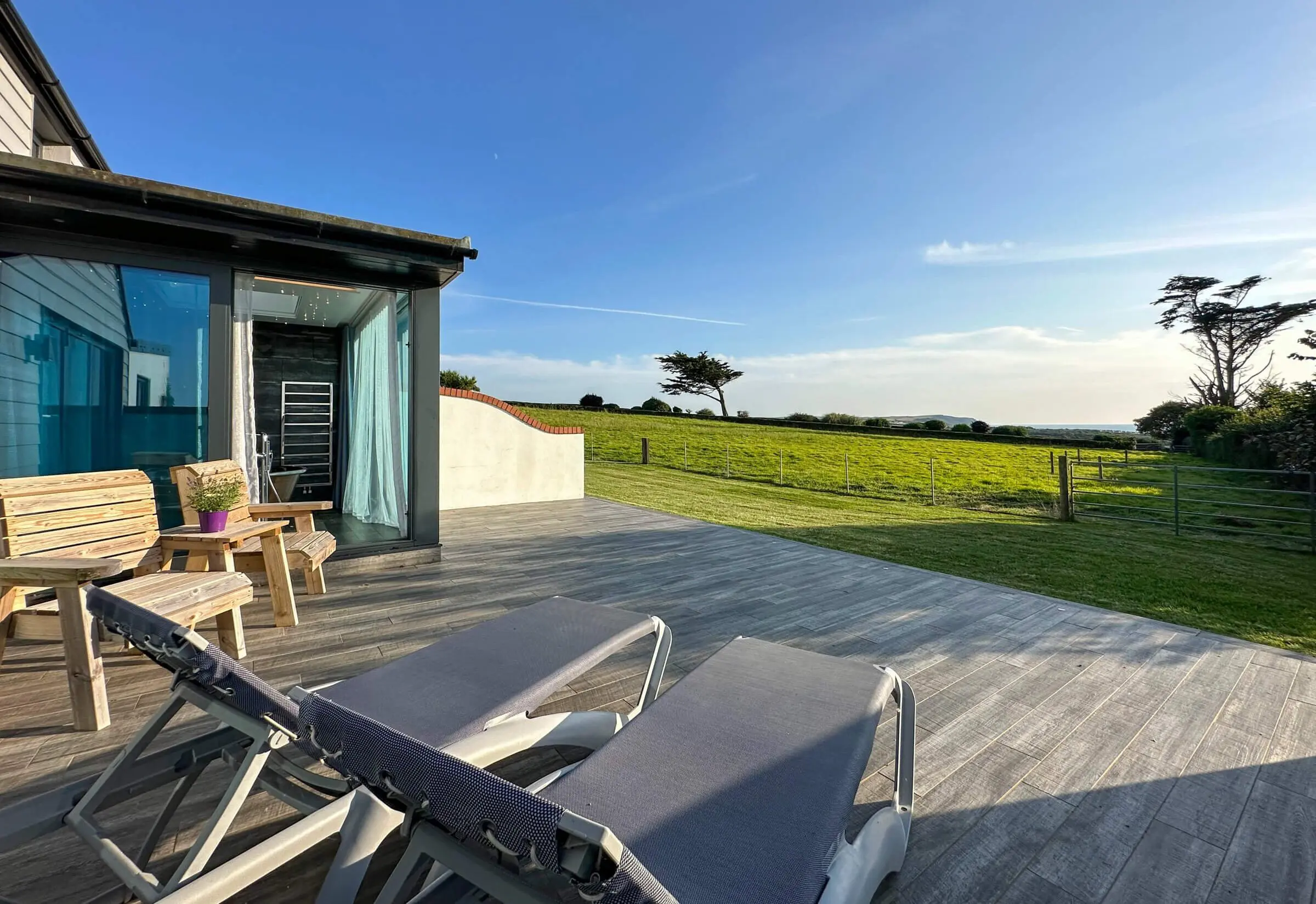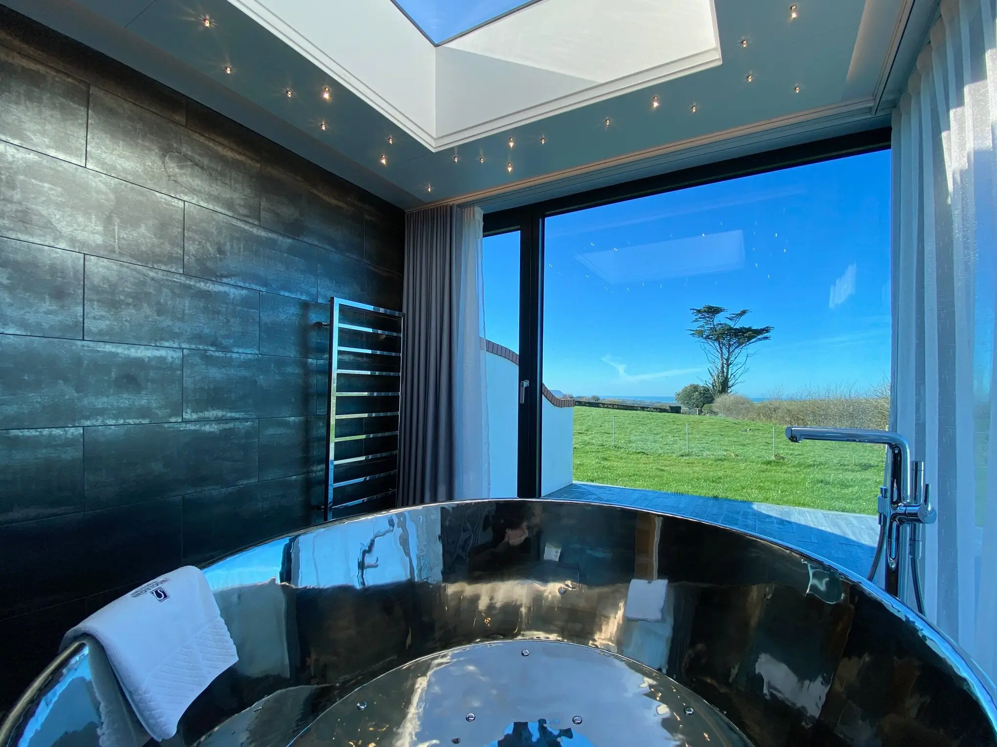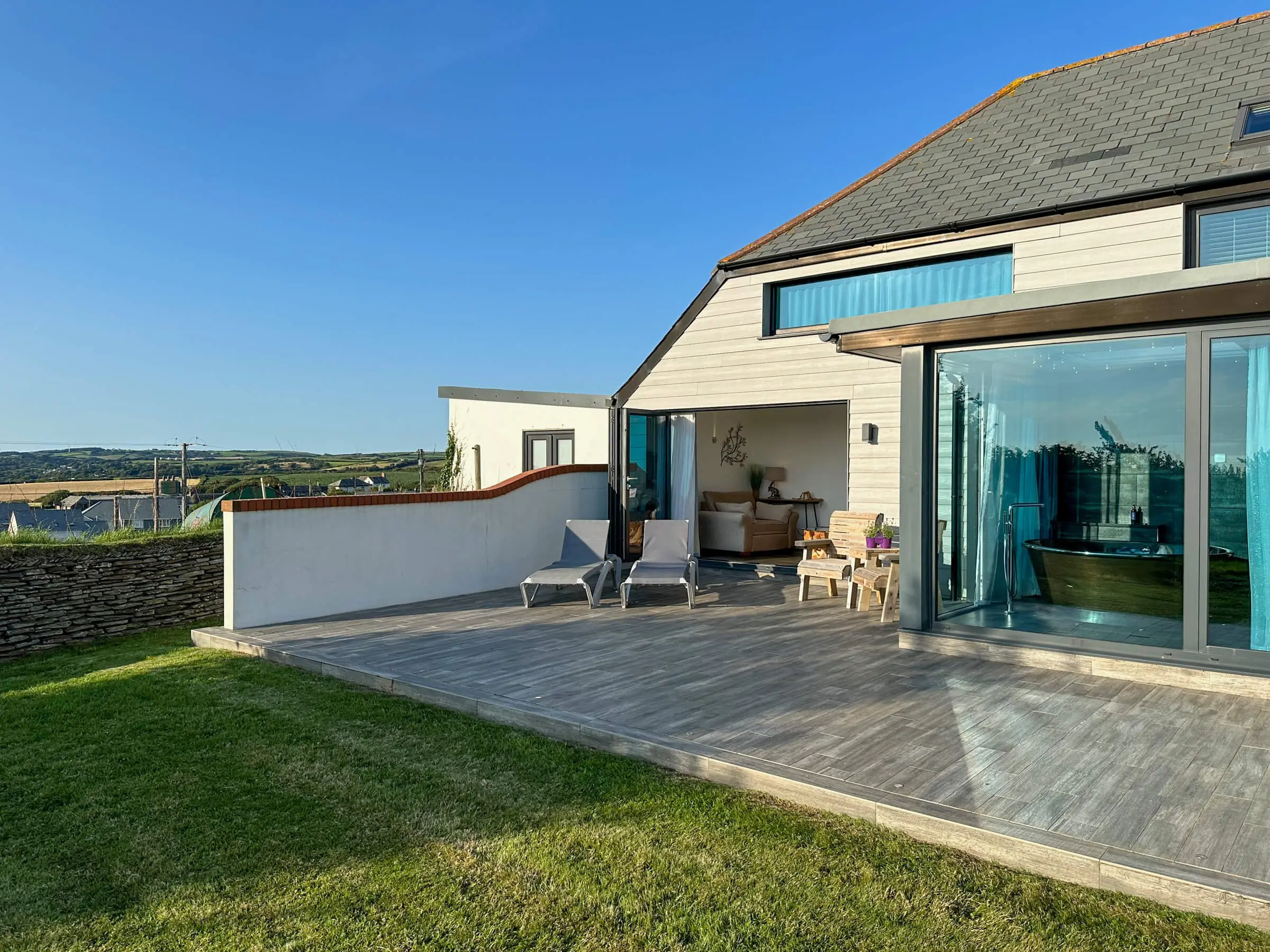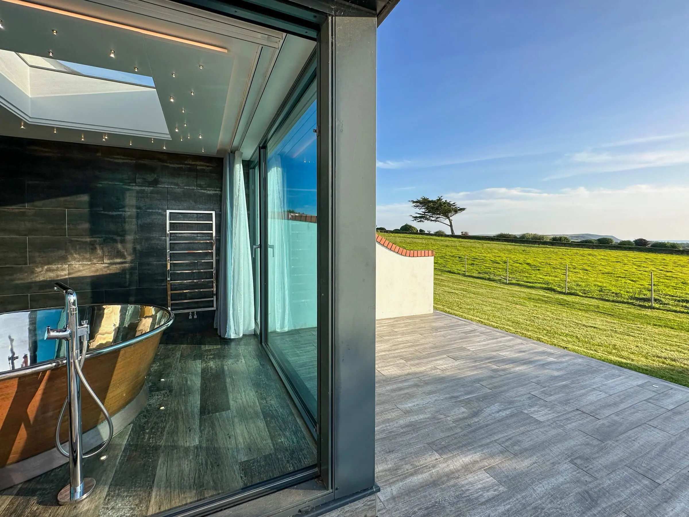 Bi-fold doors lead to a private patio with stunning countryside and sea views stretching towards Widemouth Bay and the town of Bude. Throughout the year, guests can enjoy unforgettable sunsets over Bude’s sweeping bays.
