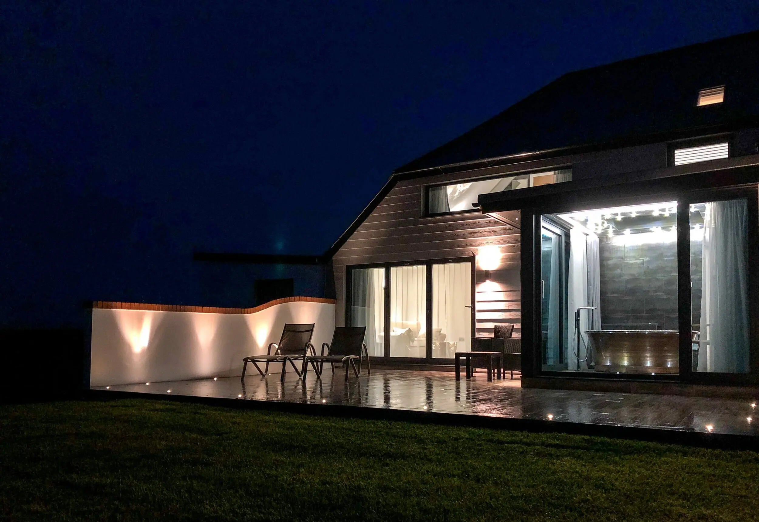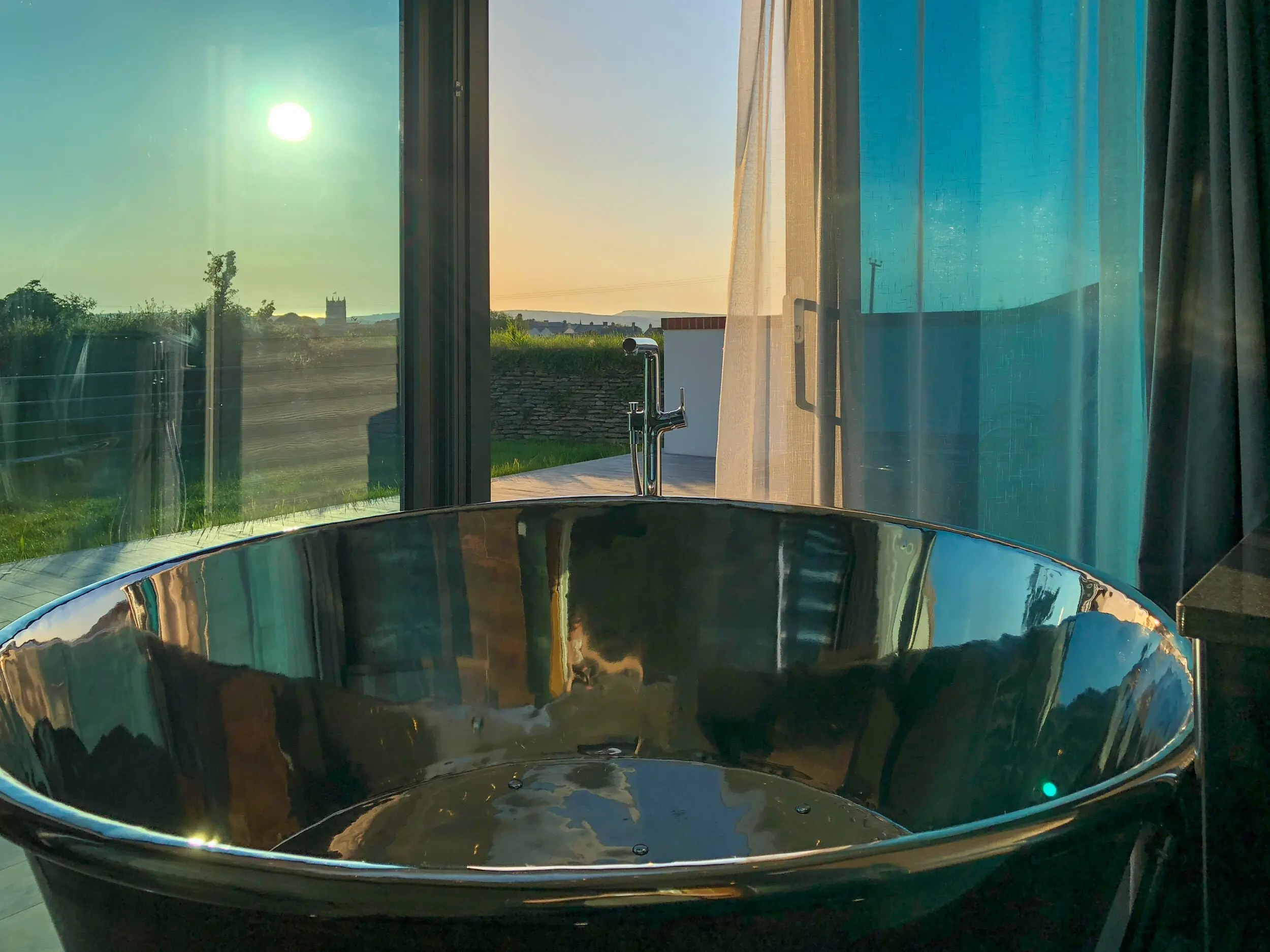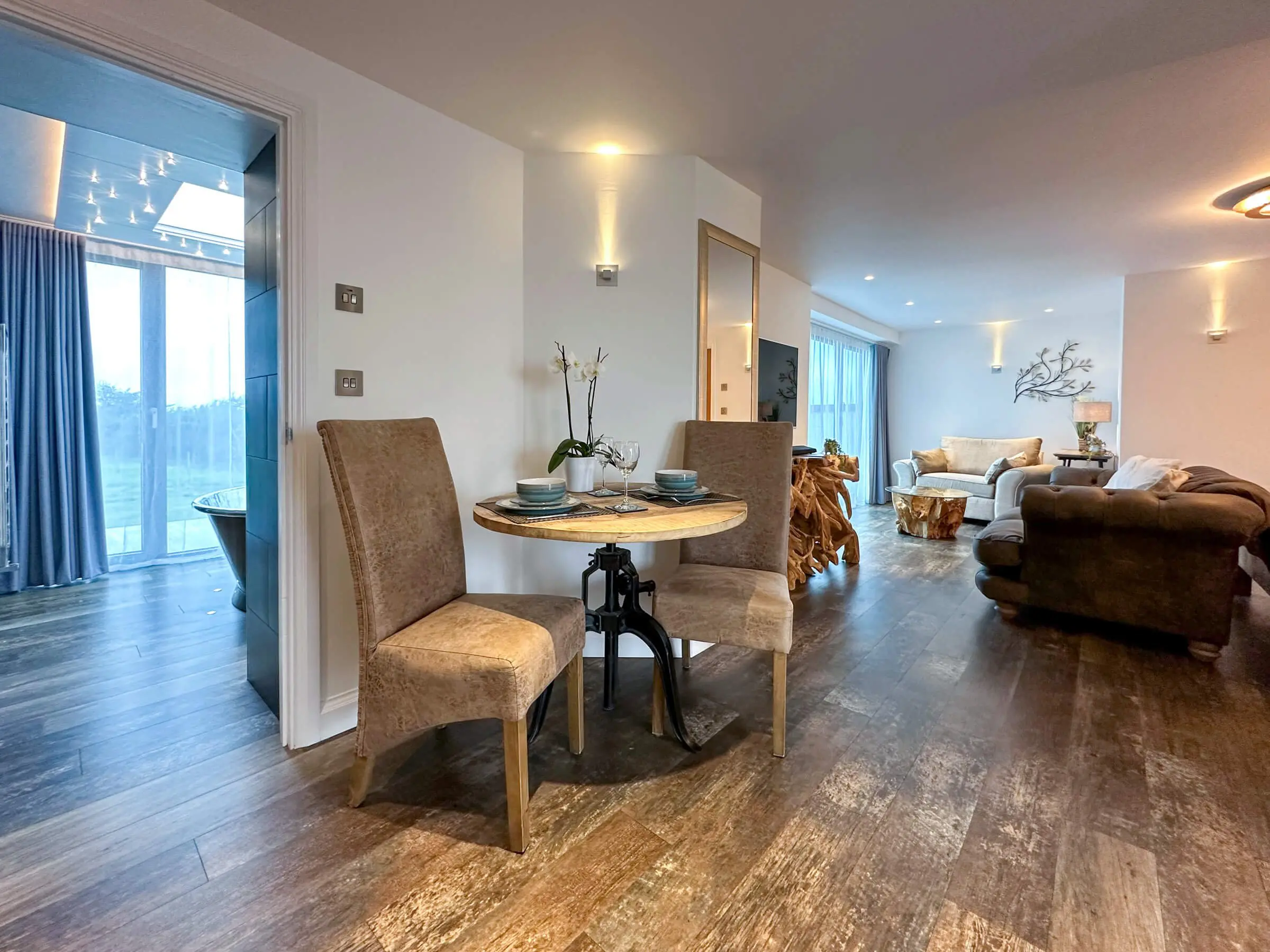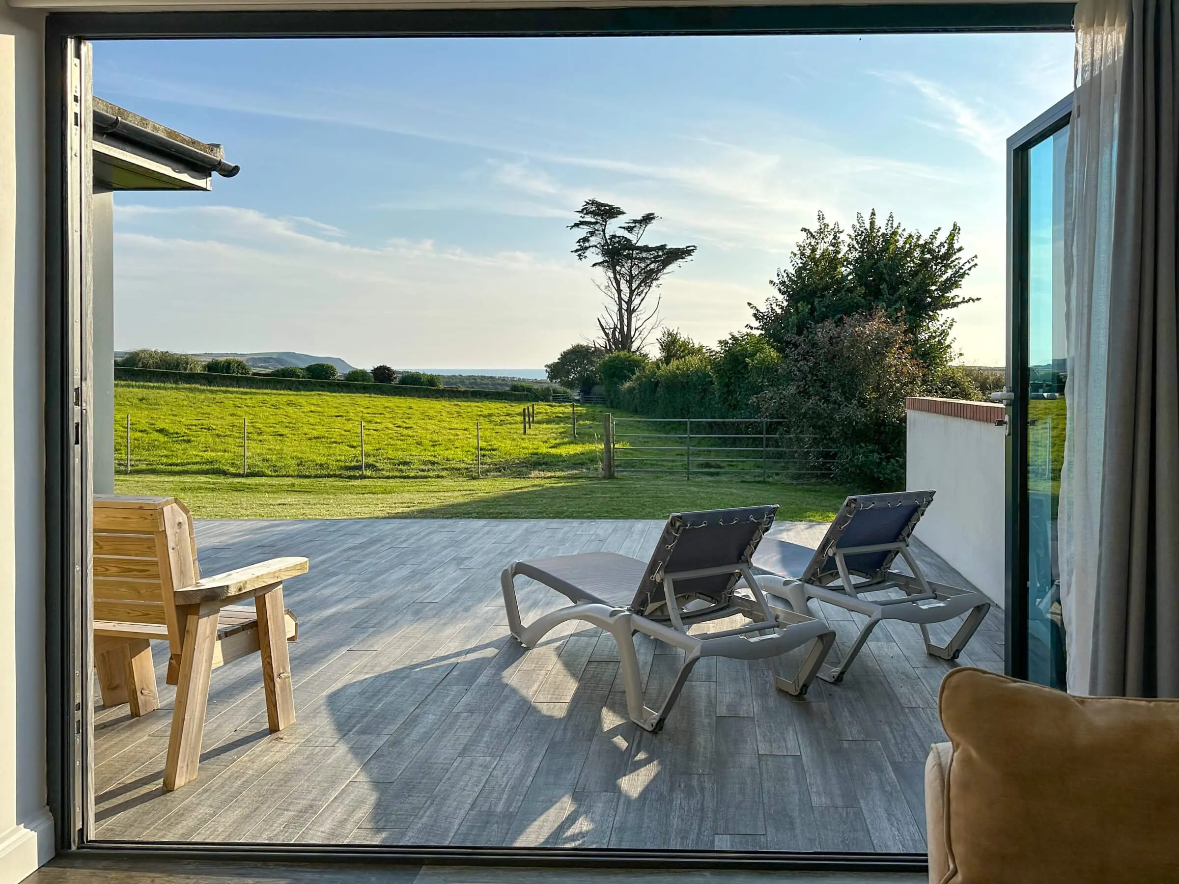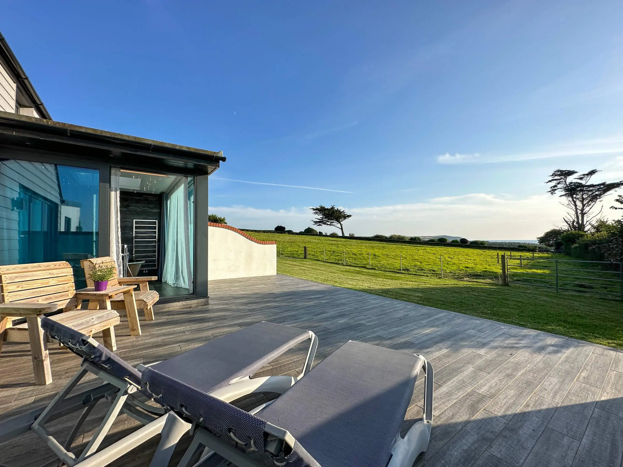 Bi-fold doors lead to a private patio with stunning countryside and sea views stretching towards Widemouth Bay and the town of Bude. Throughout the year, guests can enjoy unforgettable sunsets over Bude’s sweeping bays.