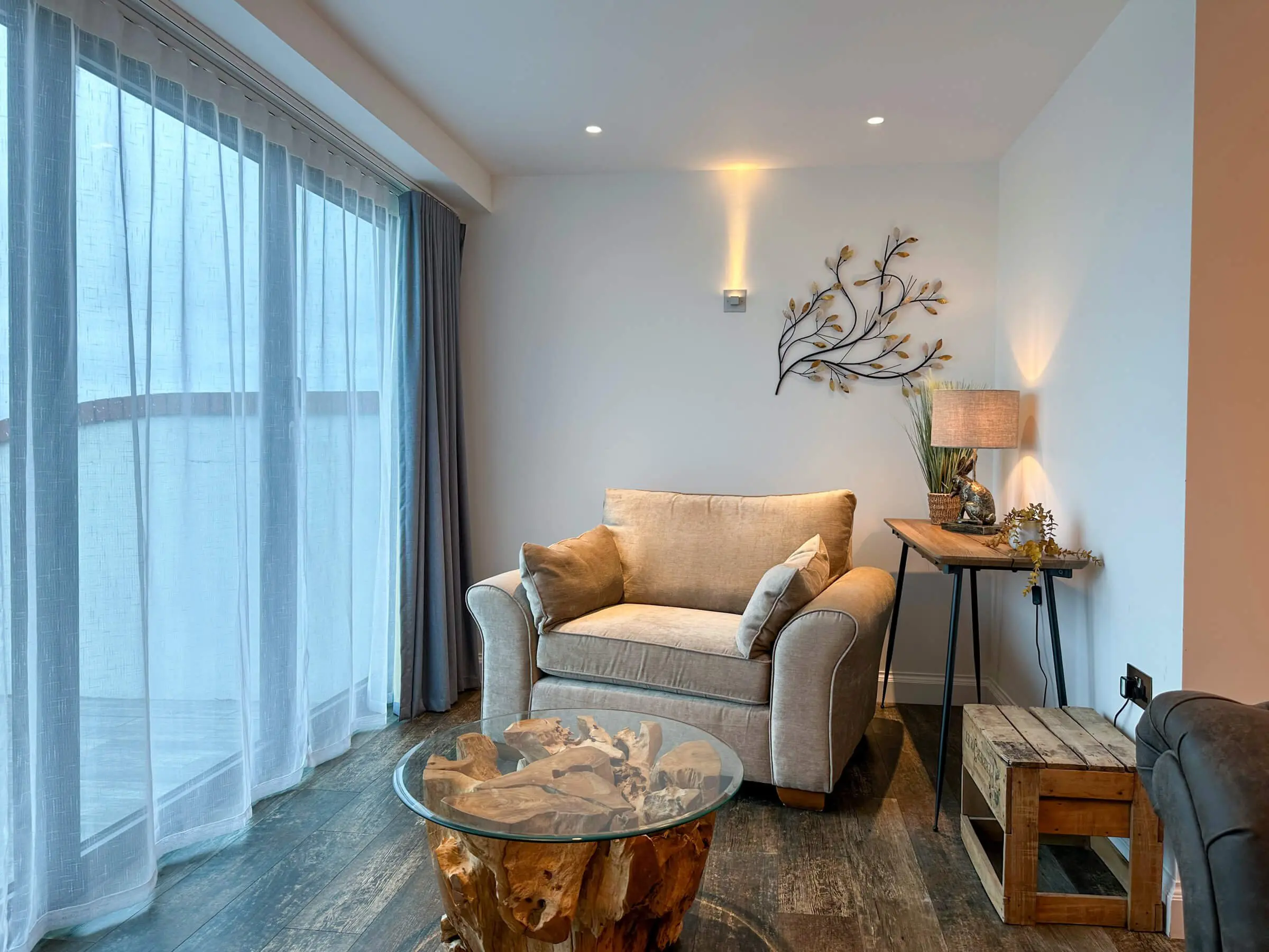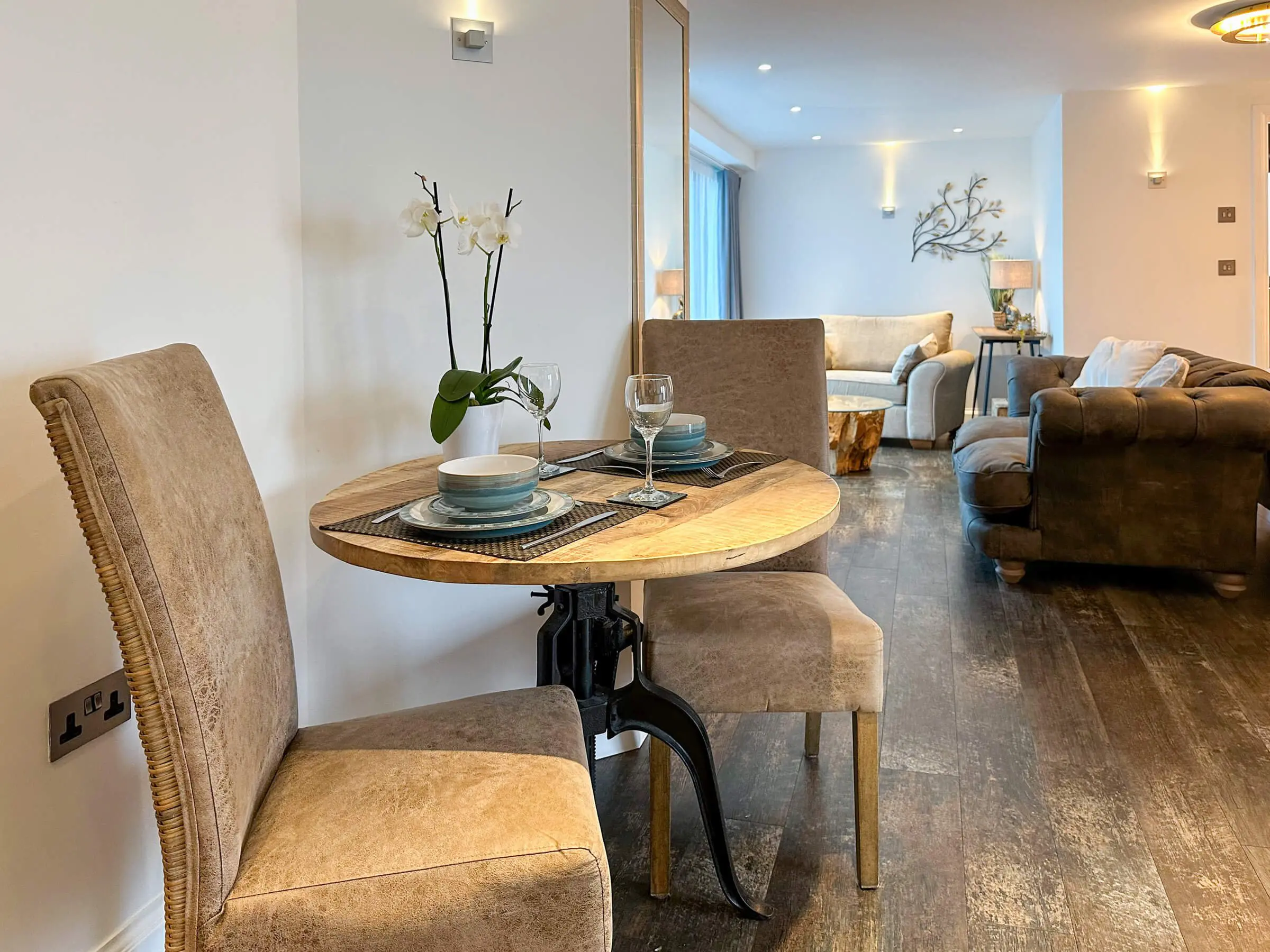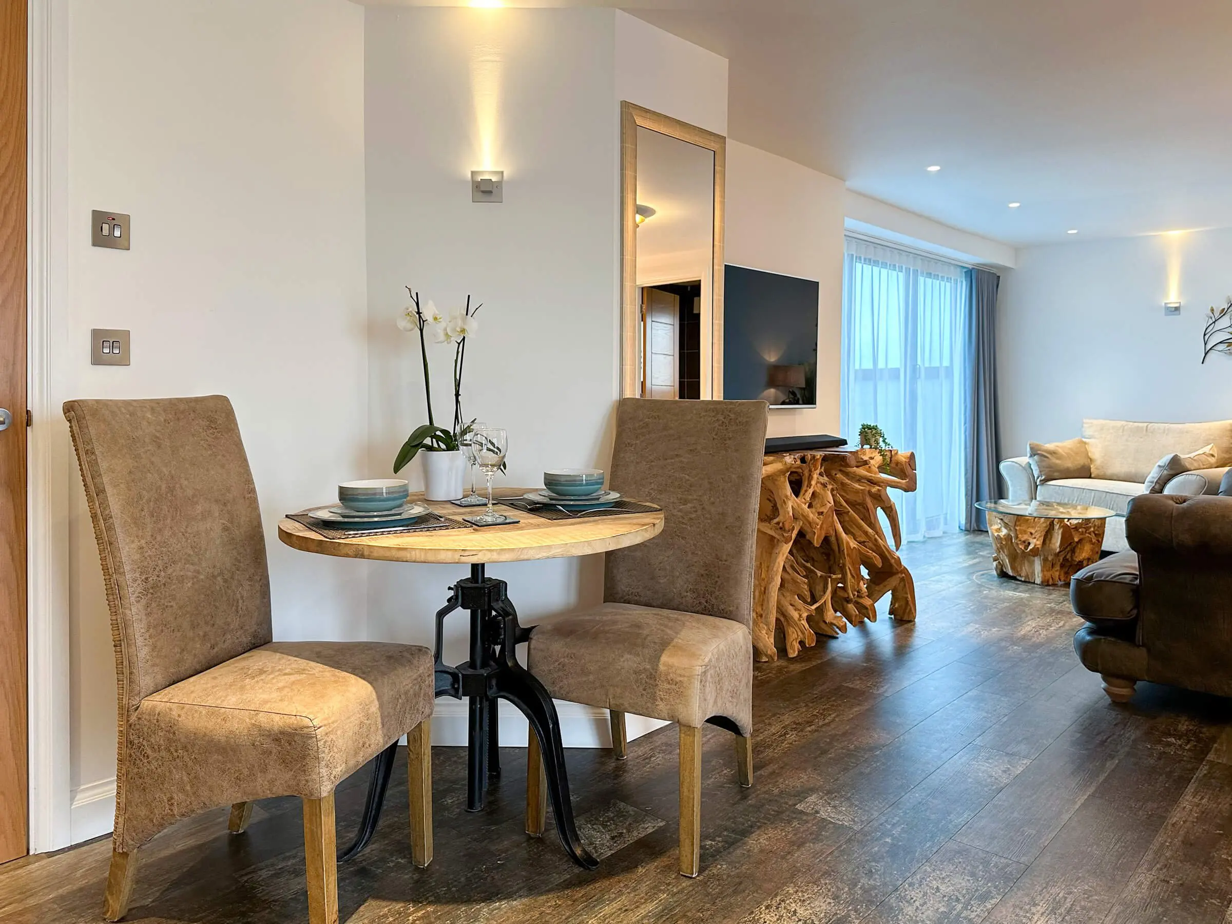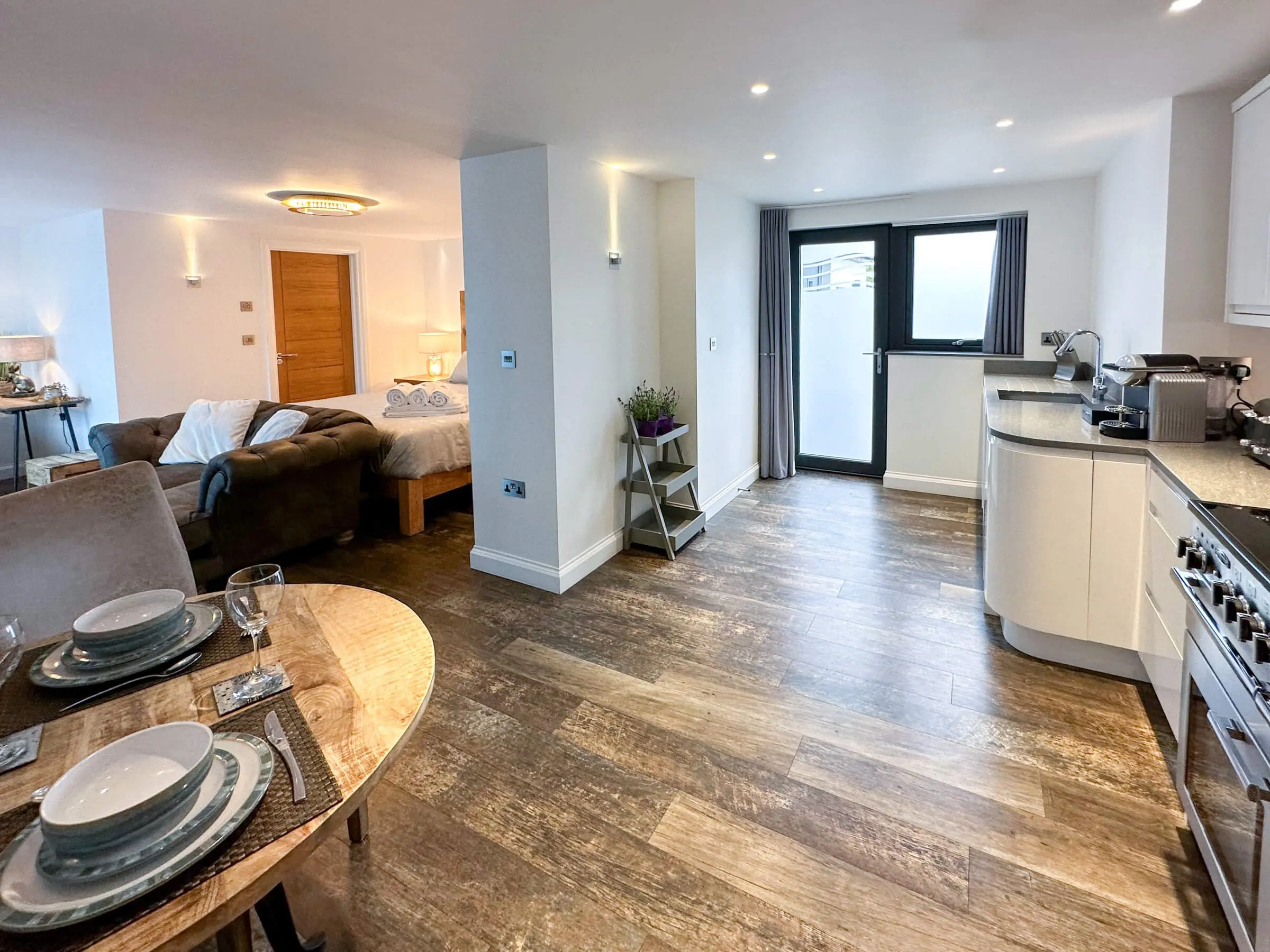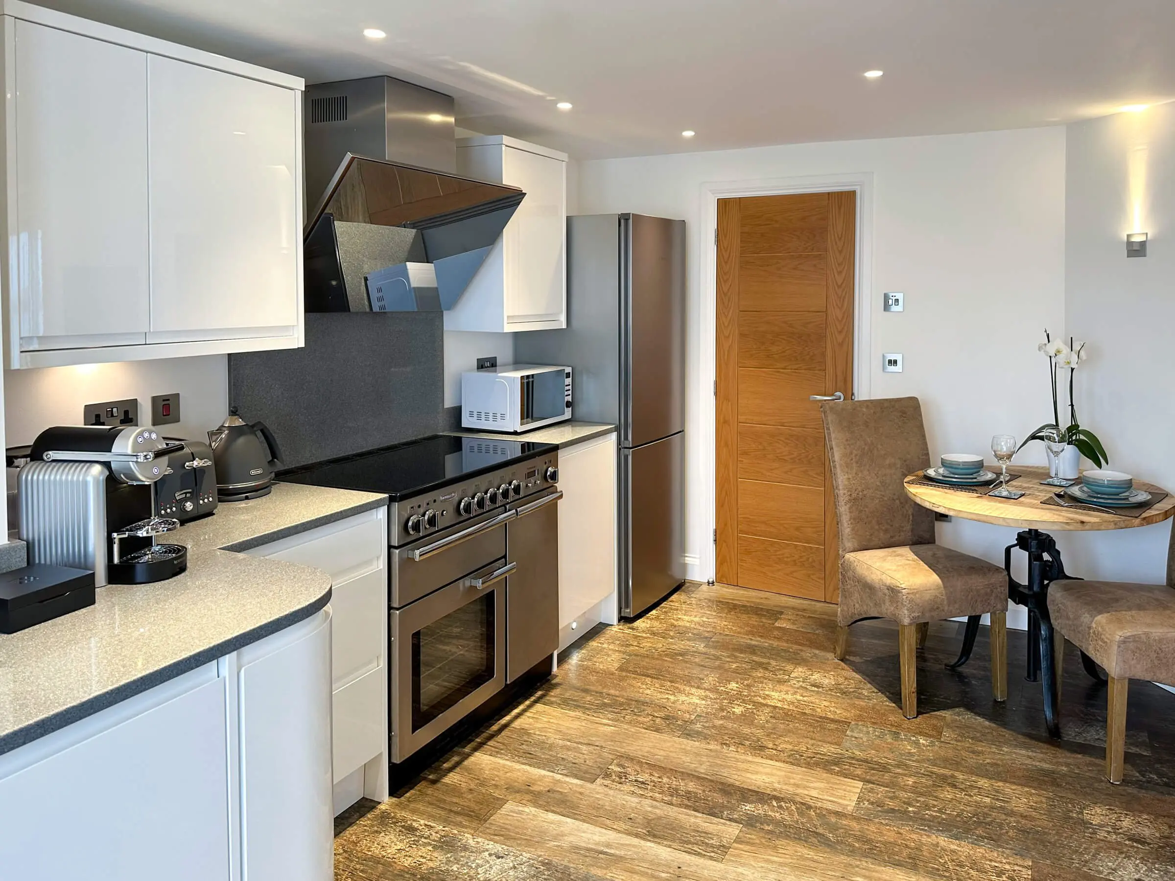 Bi-fold doors lead to a private patio with stunning countryside and sea views stretching towards Widemouth Bay and the town of Bude. Throughout the year, guests can enjoy unforgettable sunsets over Bude’s sweeping bays.